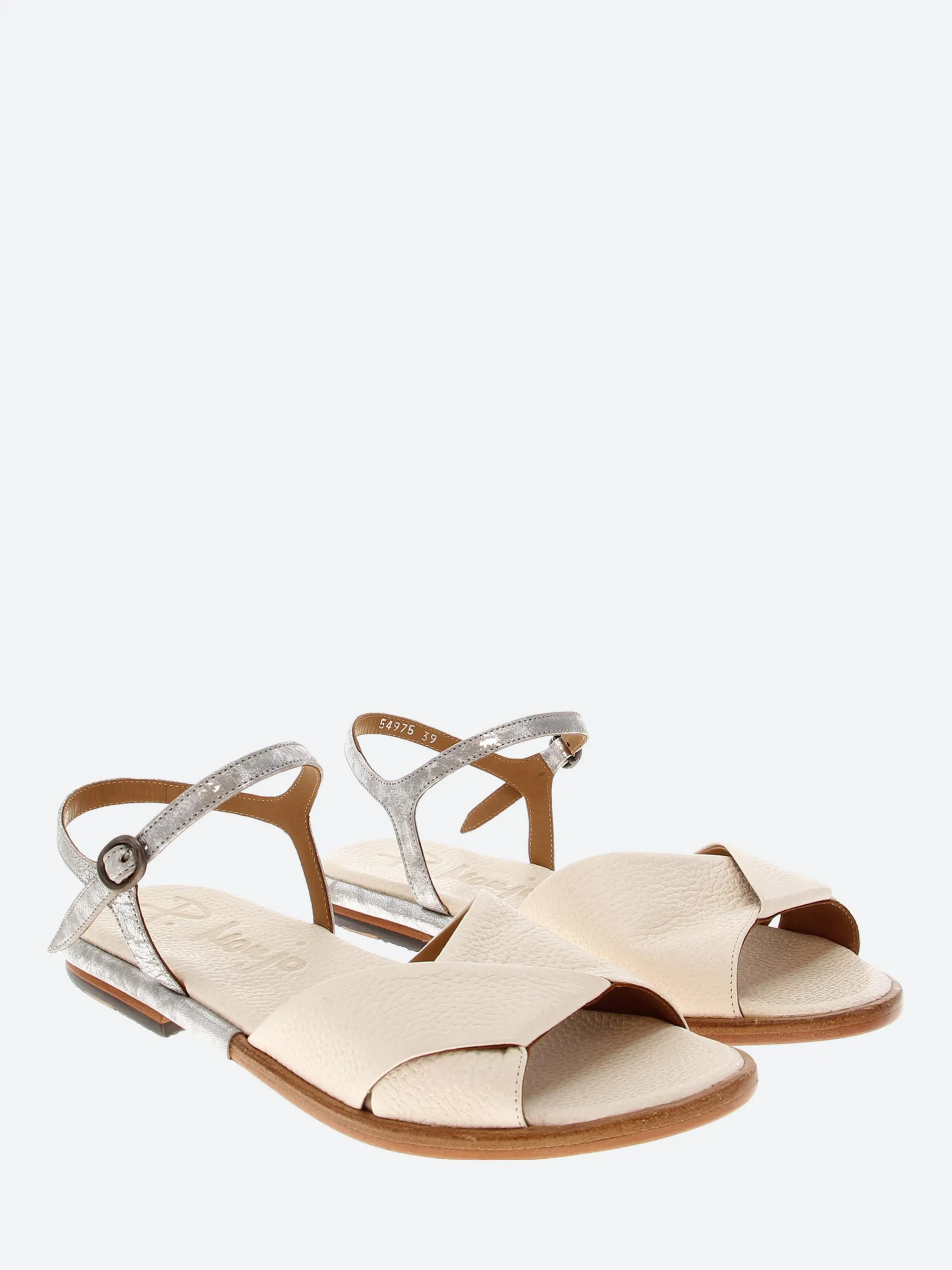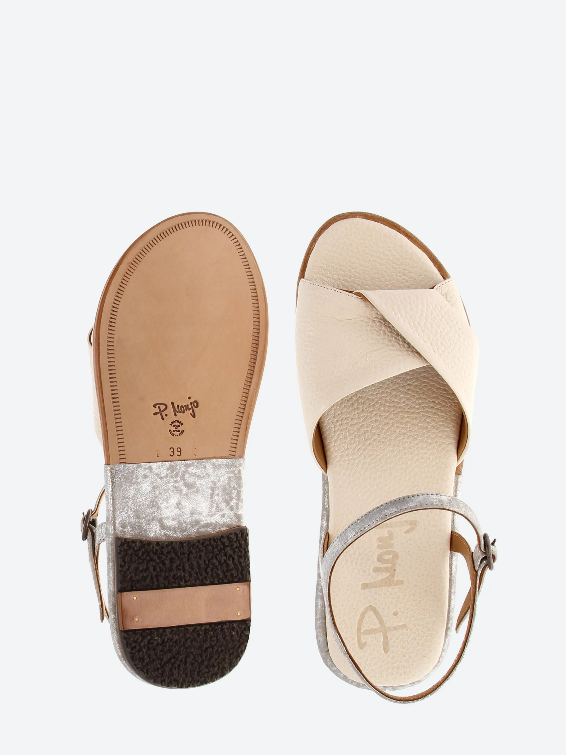 P. Monjo flat leather two-tone sandals designed in Menorca, Spain. Leather sole with non-slip rubber piece and insole made of the same leather.