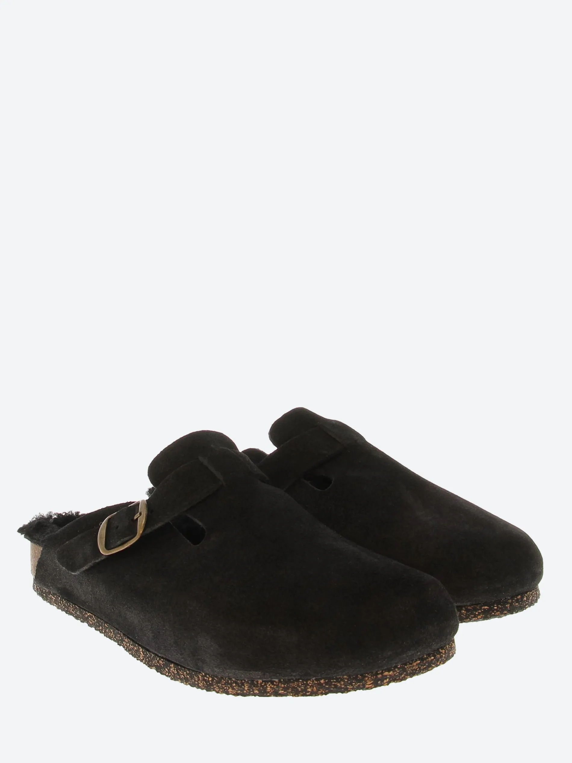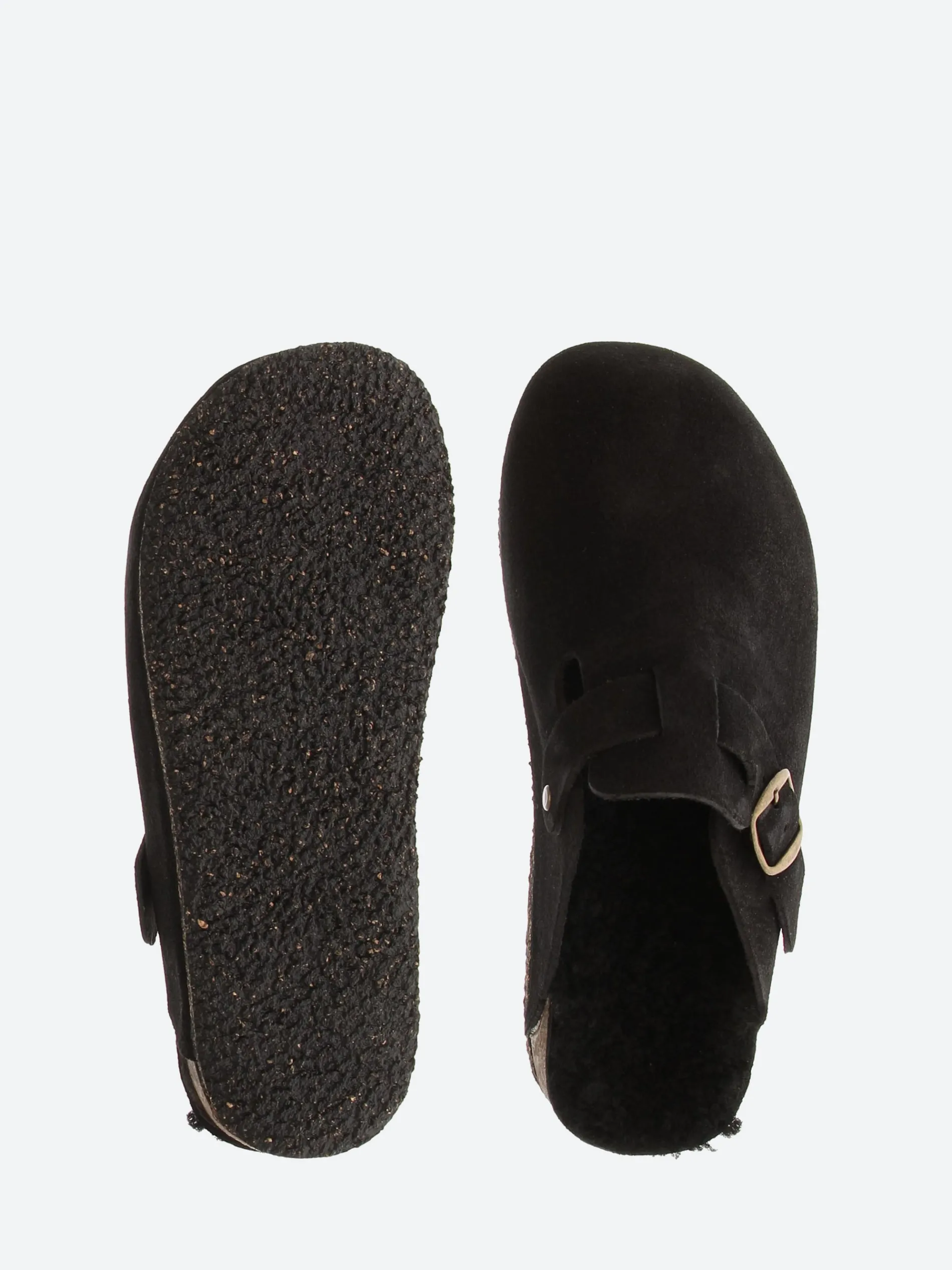 Bosabo clog with black nubuck upper and black sheepskin lining.