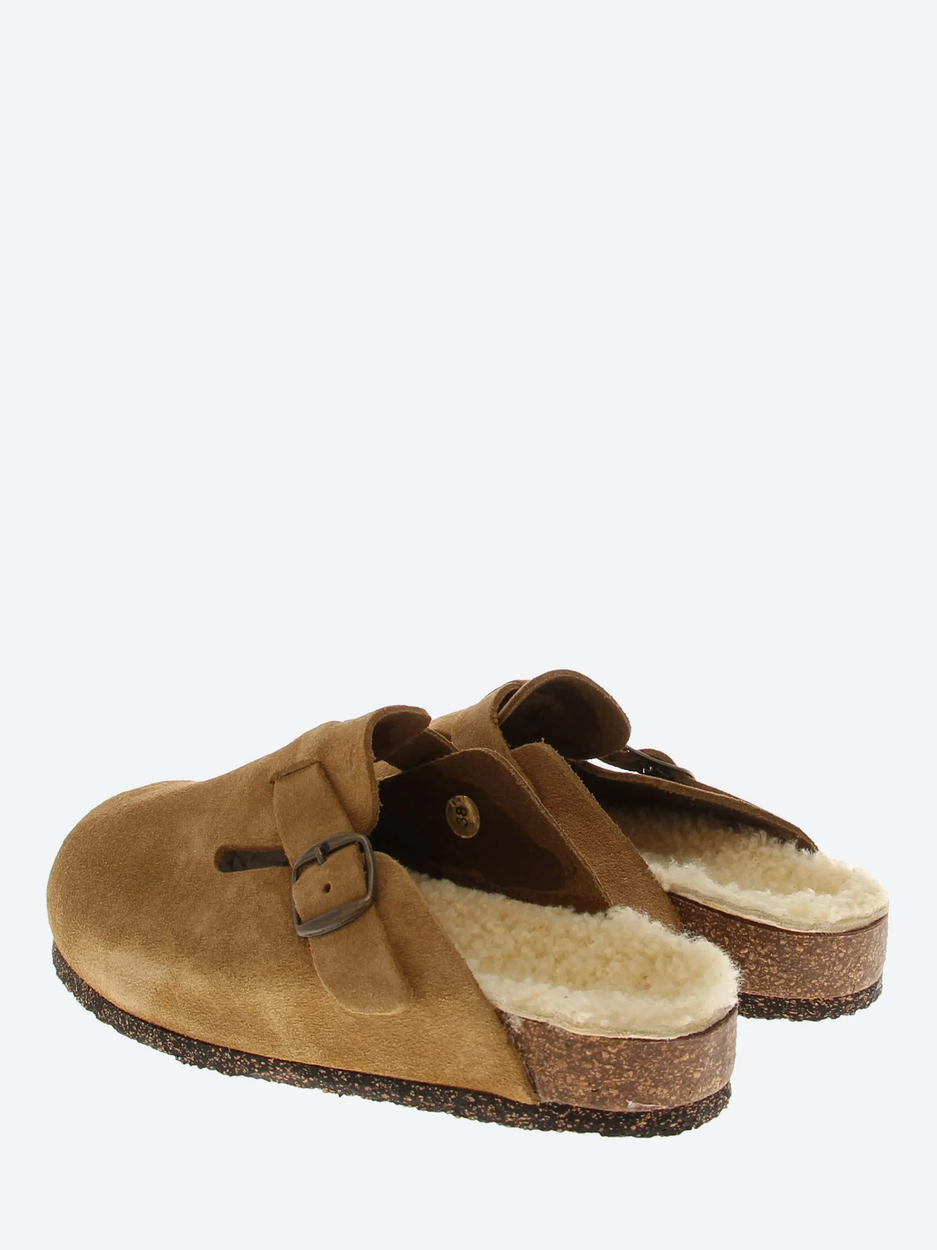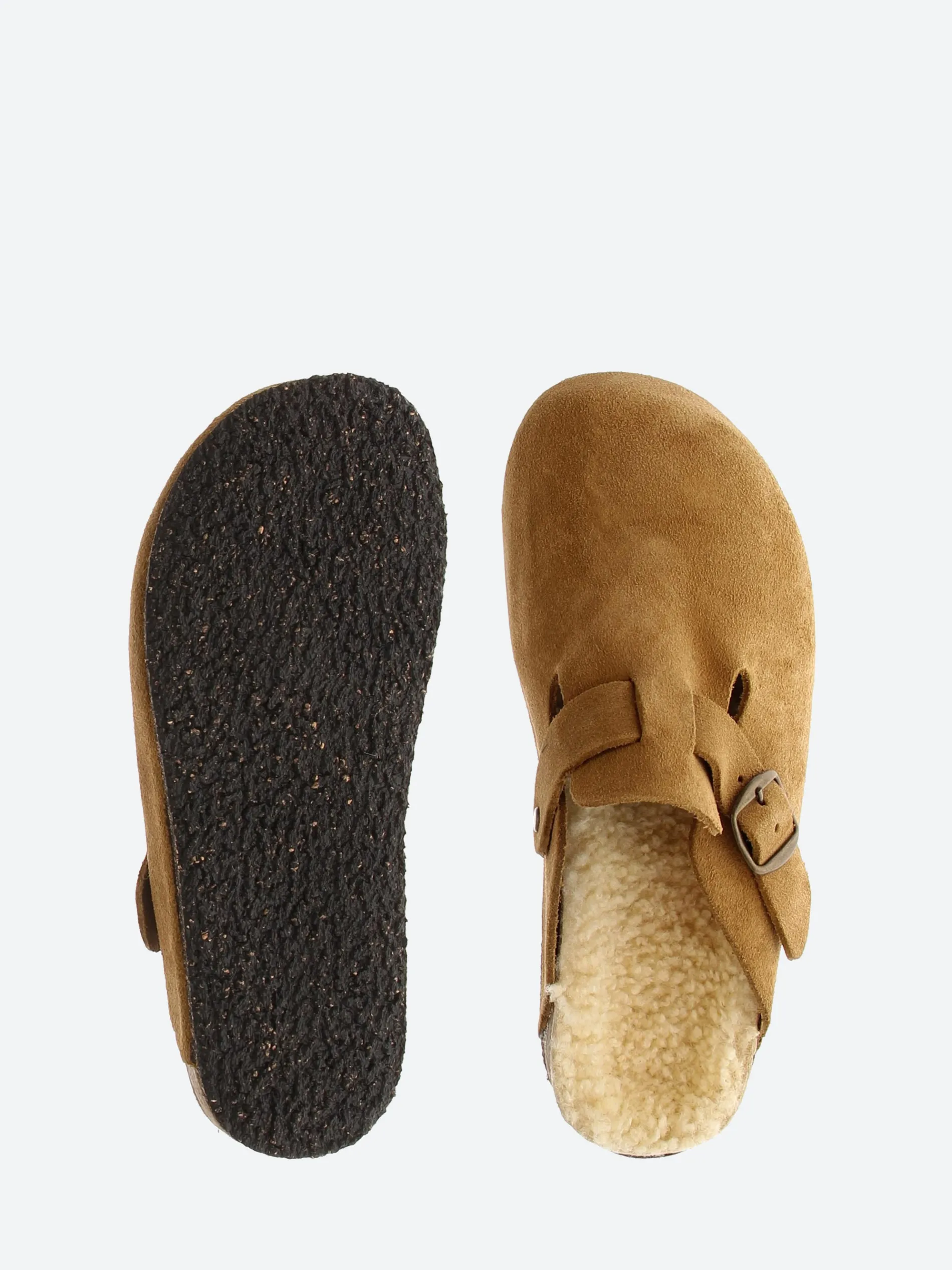 Bosabo clog with tan nubuck upper and champagne sheepskin lining.