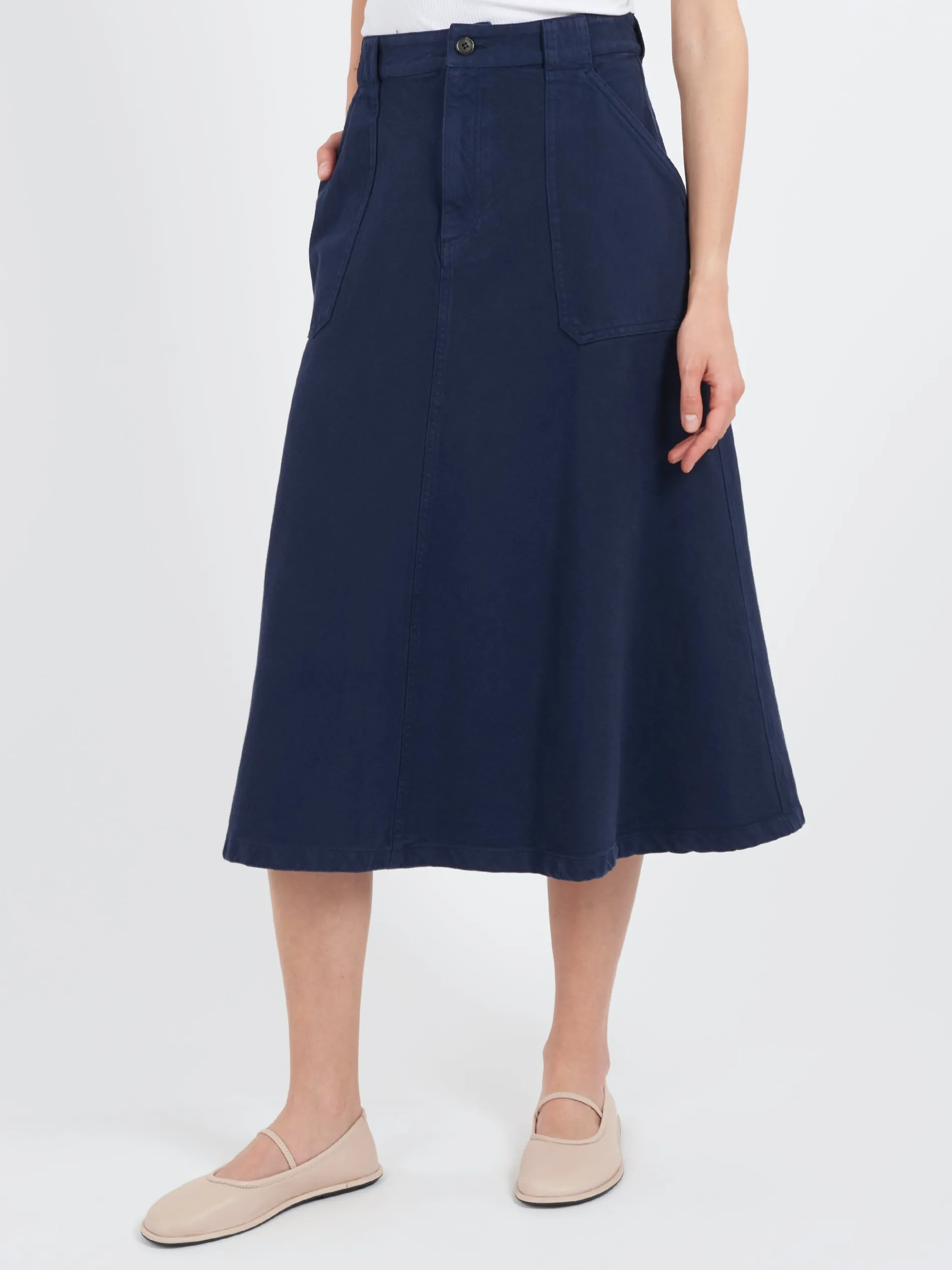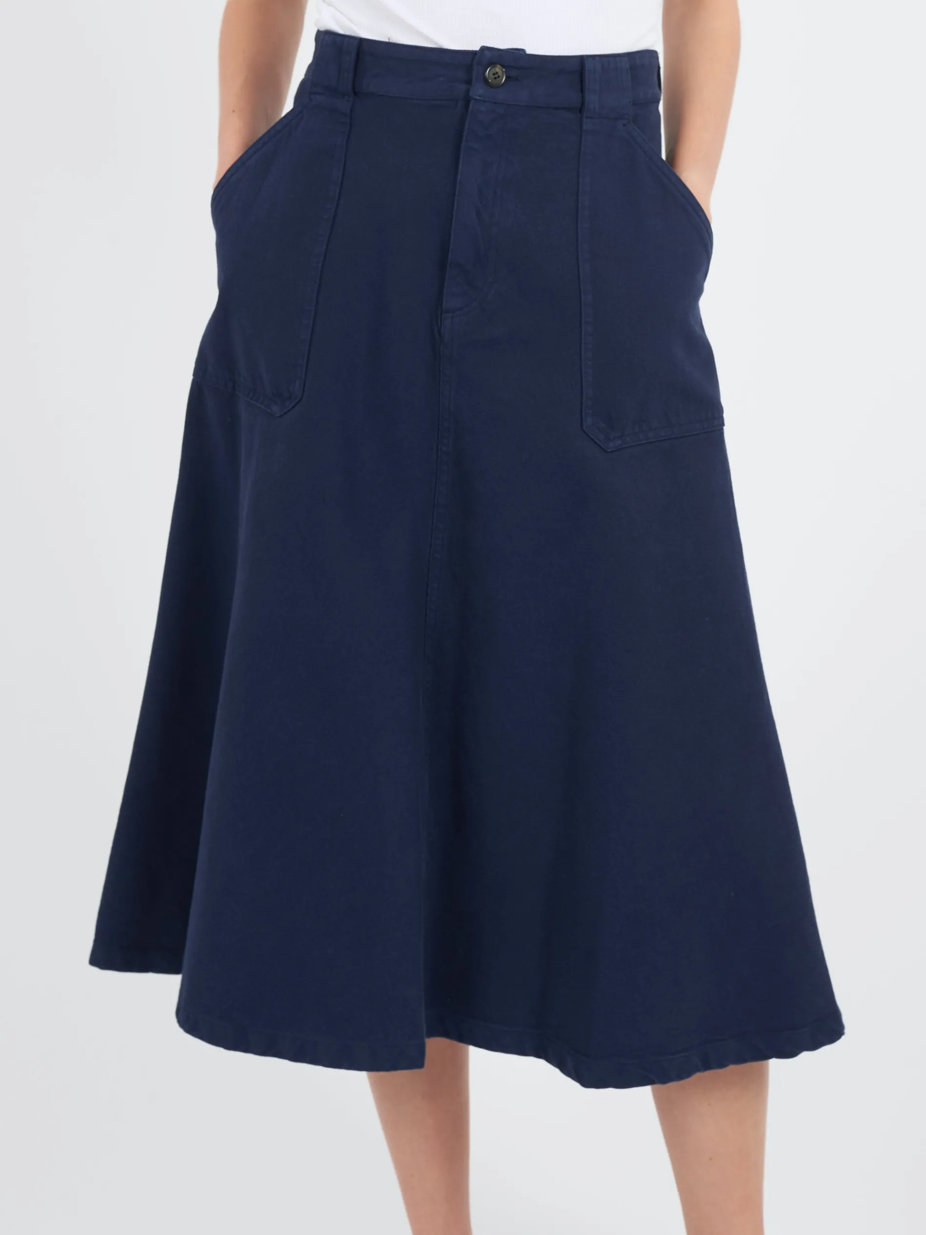 A.P.C. workwear-style long skirt in organic cotton with a straight cut that flares out at the hem.