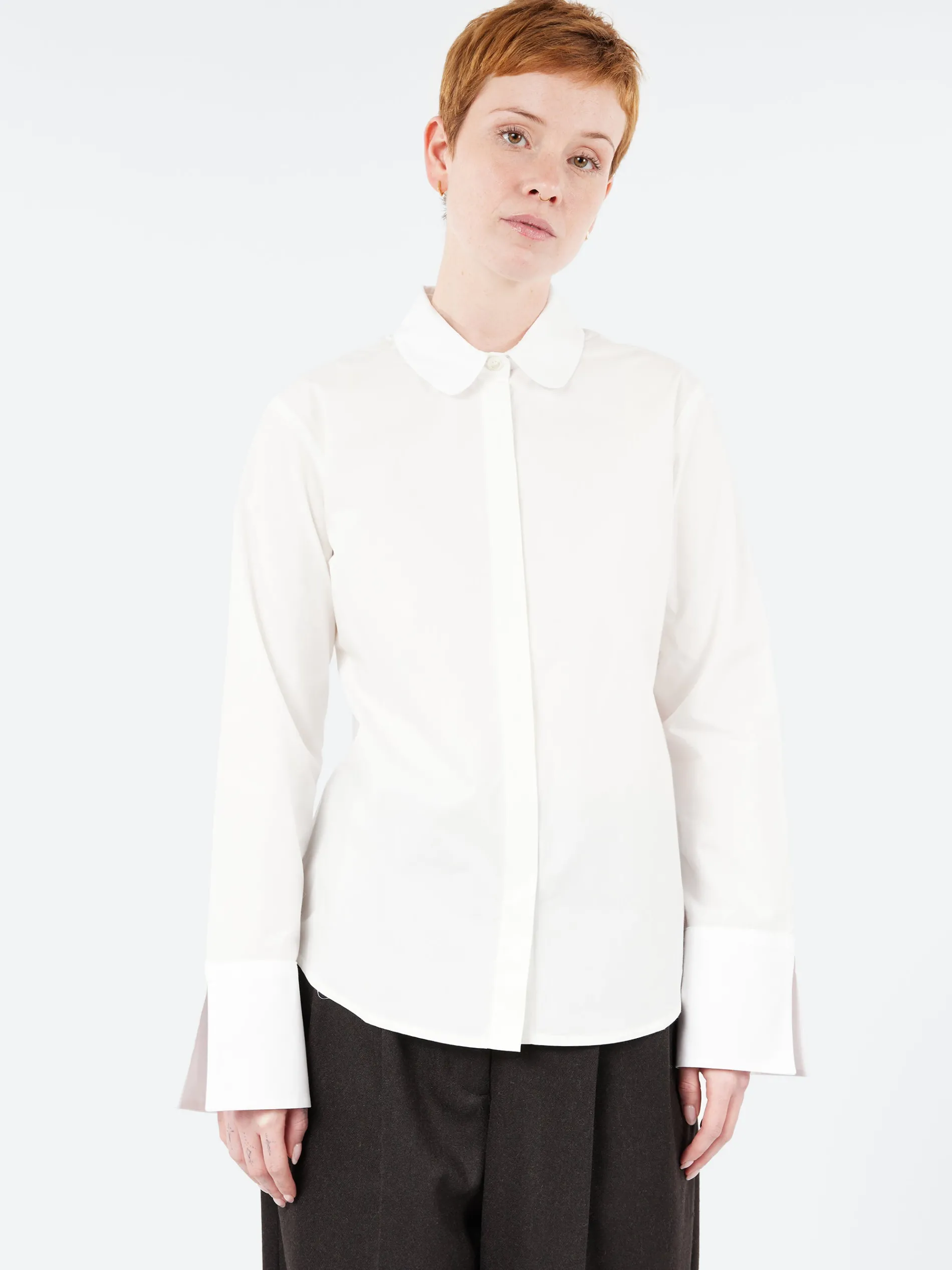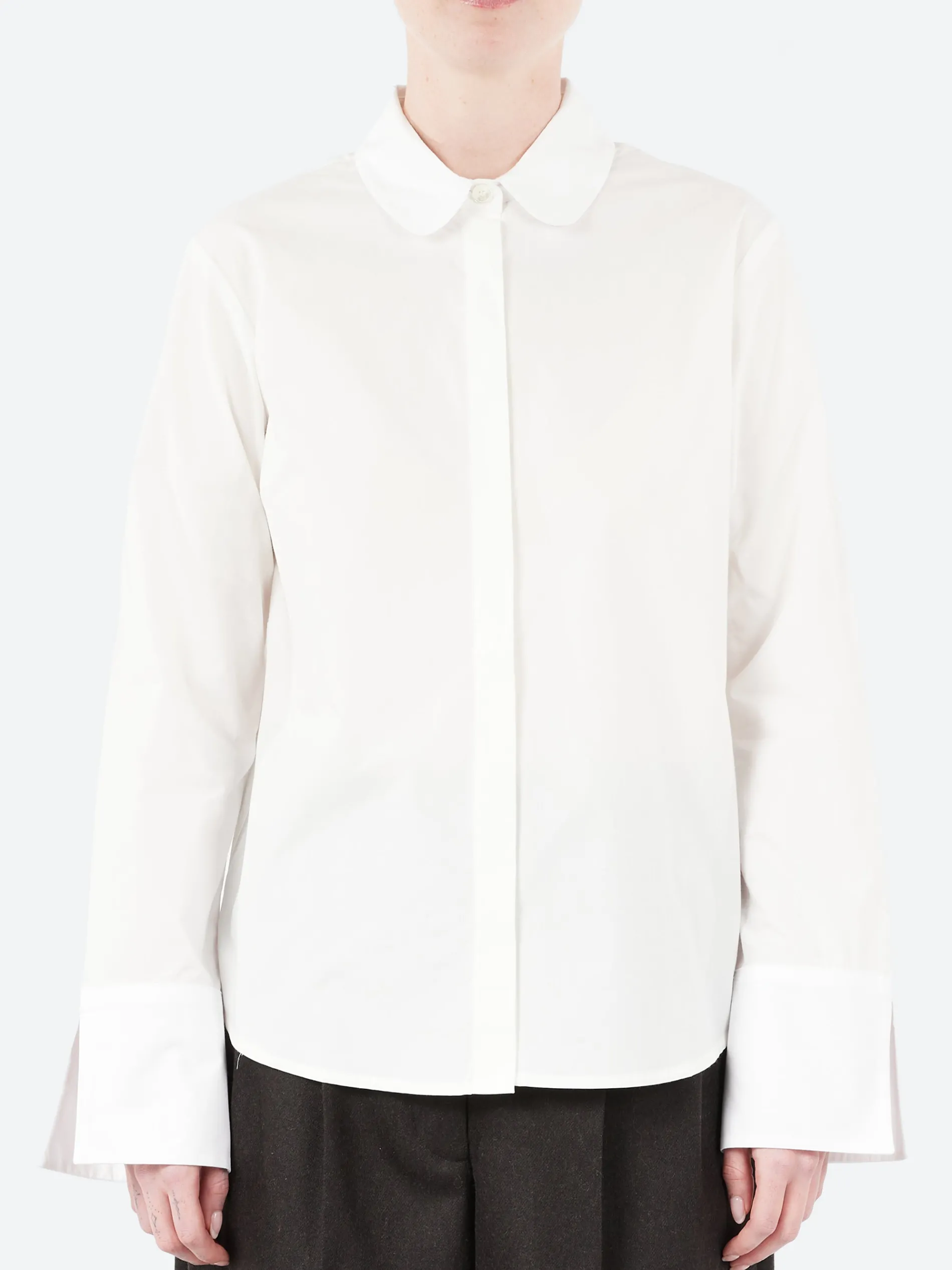 This white shirt from A.P.C. embodies a minimalist, refined aesthetic. It features a straight cut that offers a clean, flattering silhouette. The rounded collar adds a soft, subtle detail, while the hidden buttoning maintains a sleek, uninterrupted front. Large slit cuffs enhance the modern feel, making this shirt a versatile and stylish addition to any wardrobe.