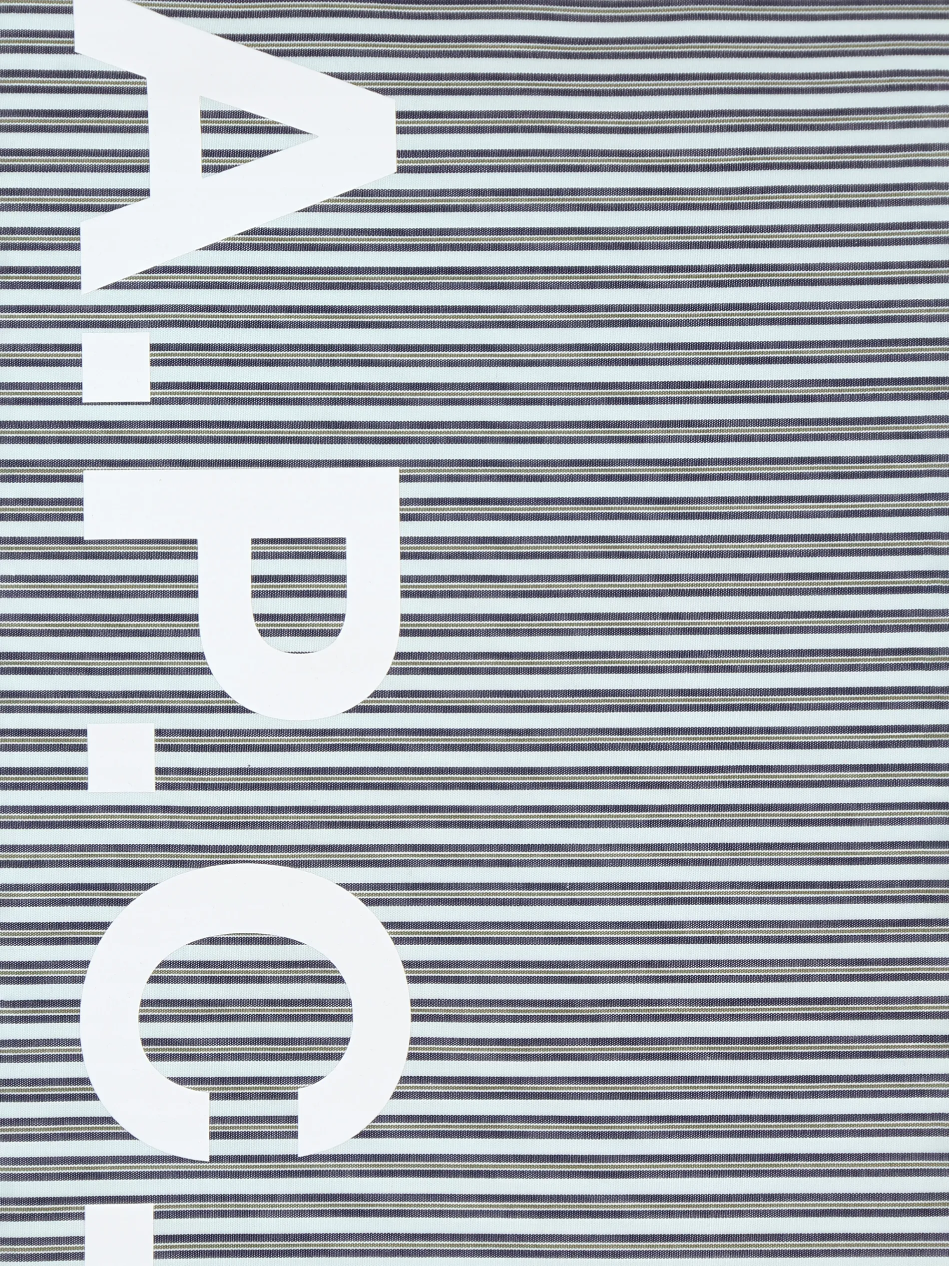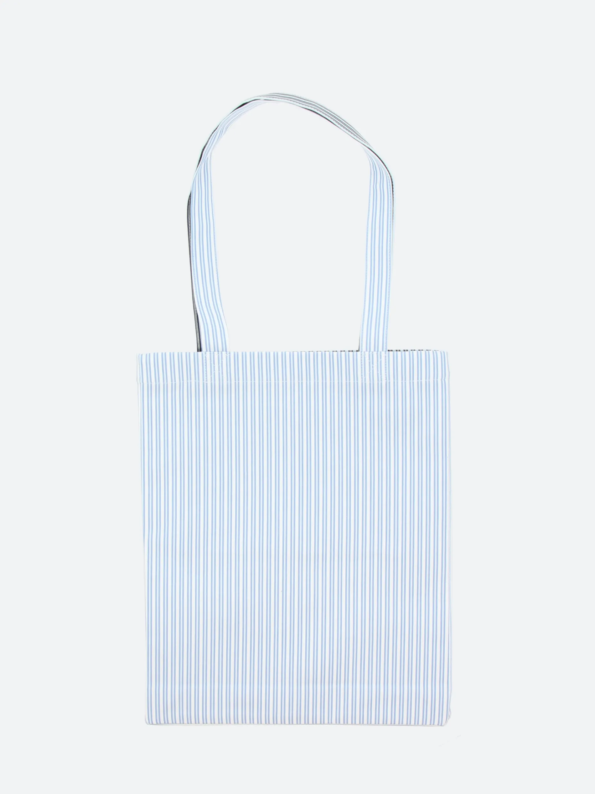 Vertical tote bag with ecru and blue stripes in organic cotton. Two large handles to carry the bag by hand or on the shoulder.