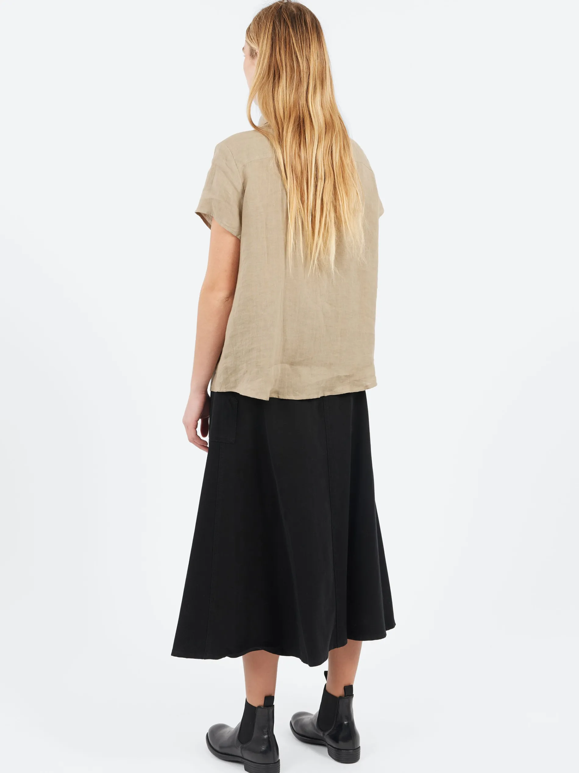 The A.P.C. Marina short-sleeved shirt is crafted from lightweight linen, making it an ideal choice for warm weather. It features a classic point collar and a front button closure for a clean, polished look. The short sleeves and slightly flared, oversized cut offer a relaxed fit that exudes effortless style and comfort, perfect for casual summer days.