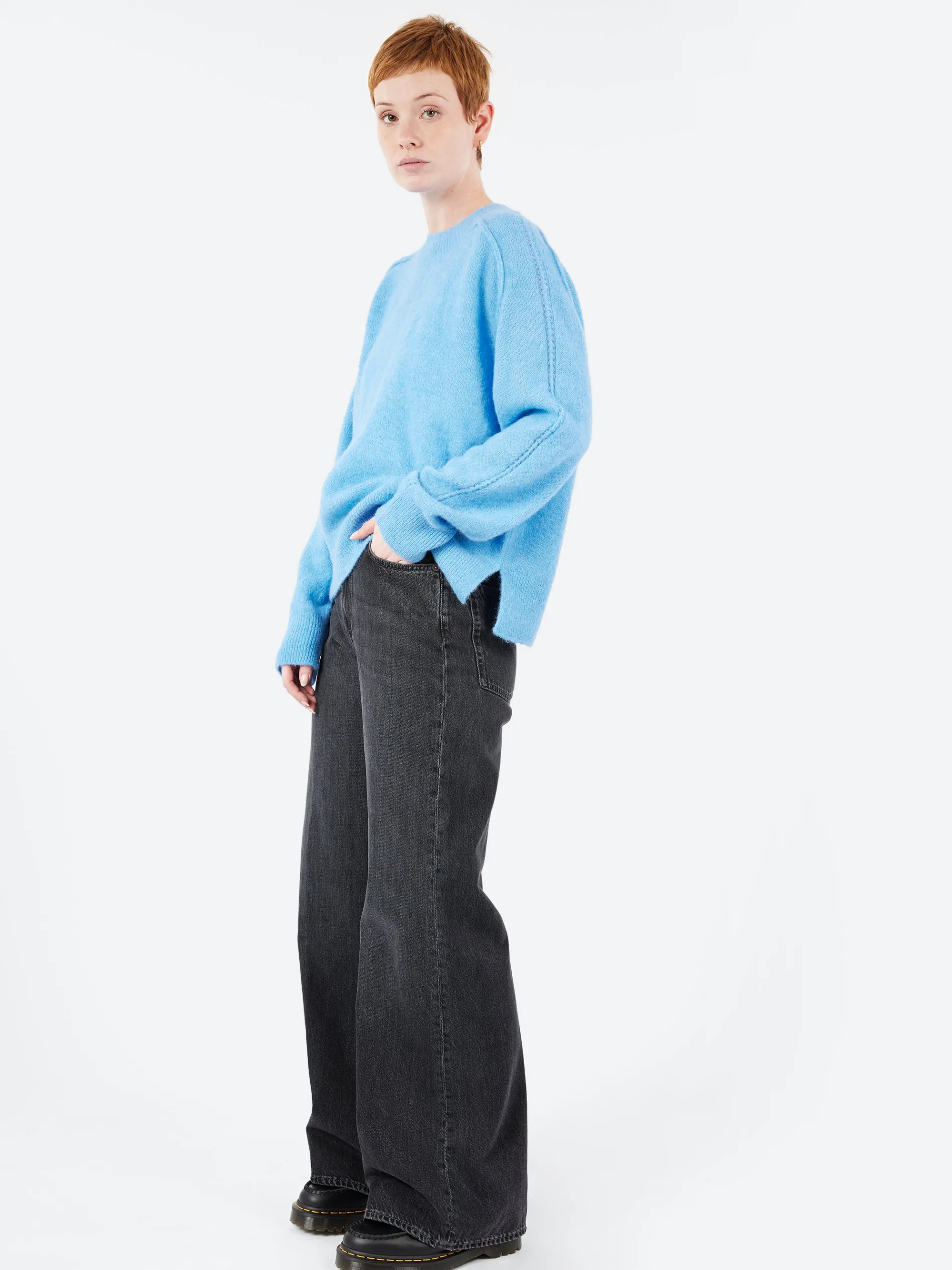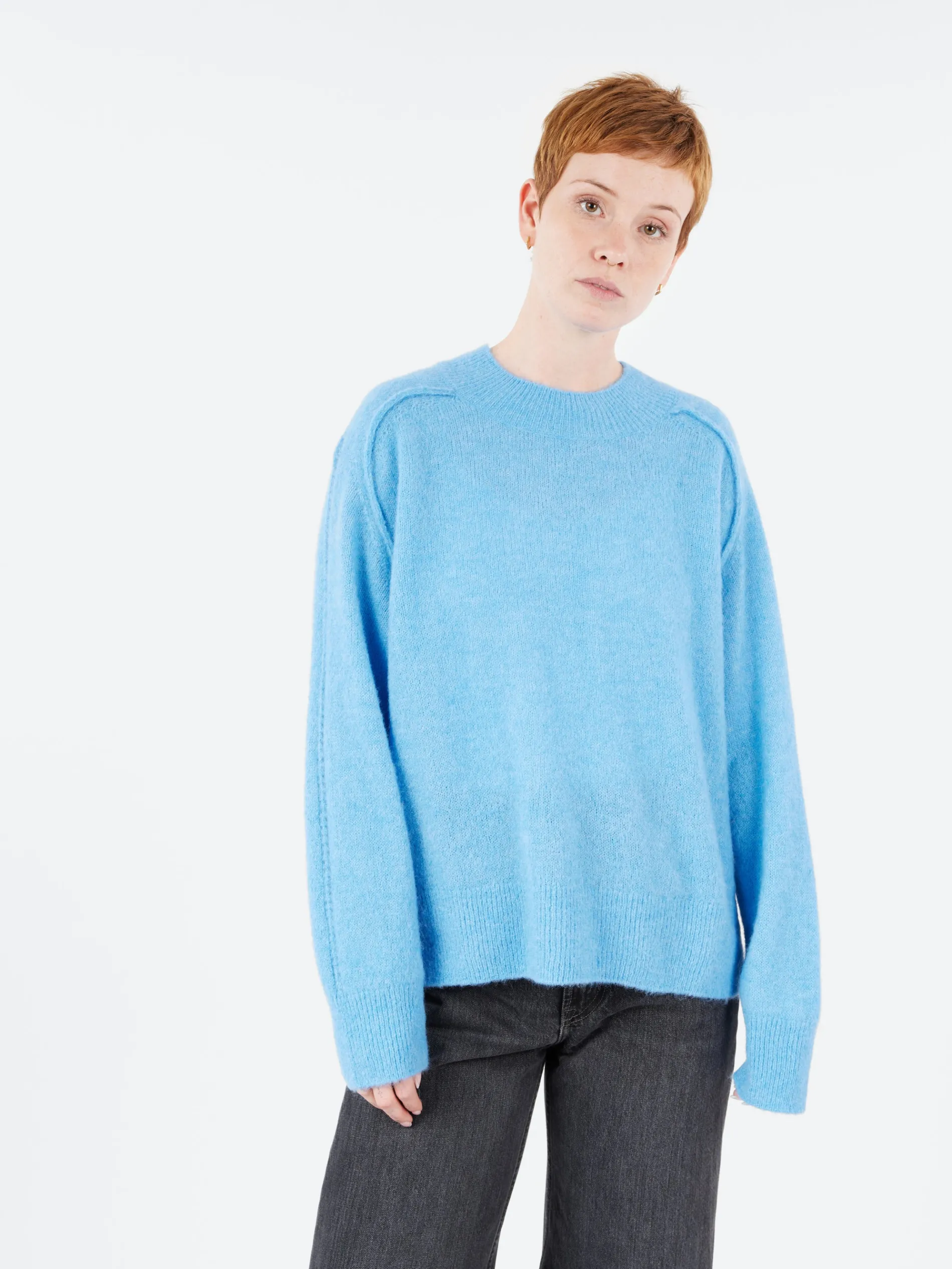 Blue loose-fit sweater in a soft, downy baby alpaca-Merino wool blend. Finished with textured details on the shoulders.