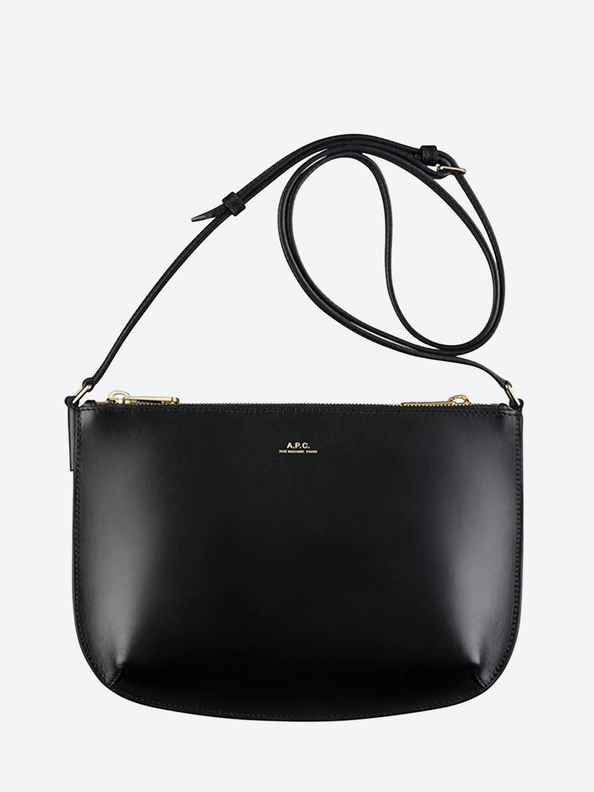This leather bag has a shoulder strap and the gold ‘A.P.C. Rue Madame’ logo on front.