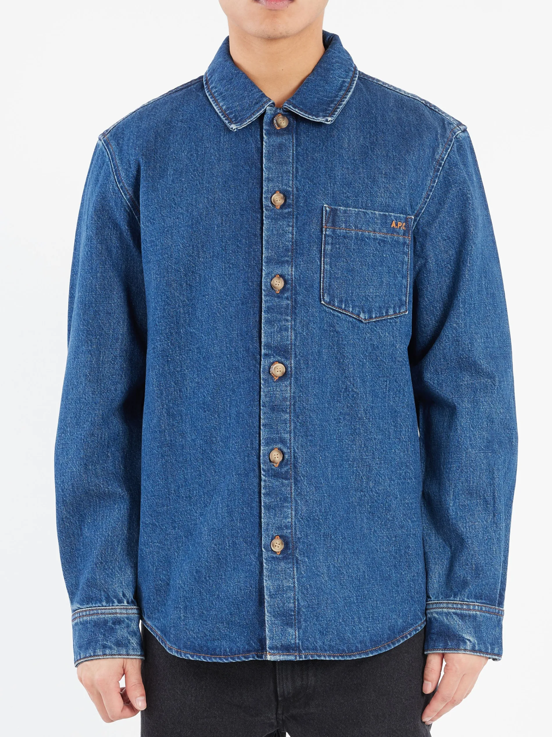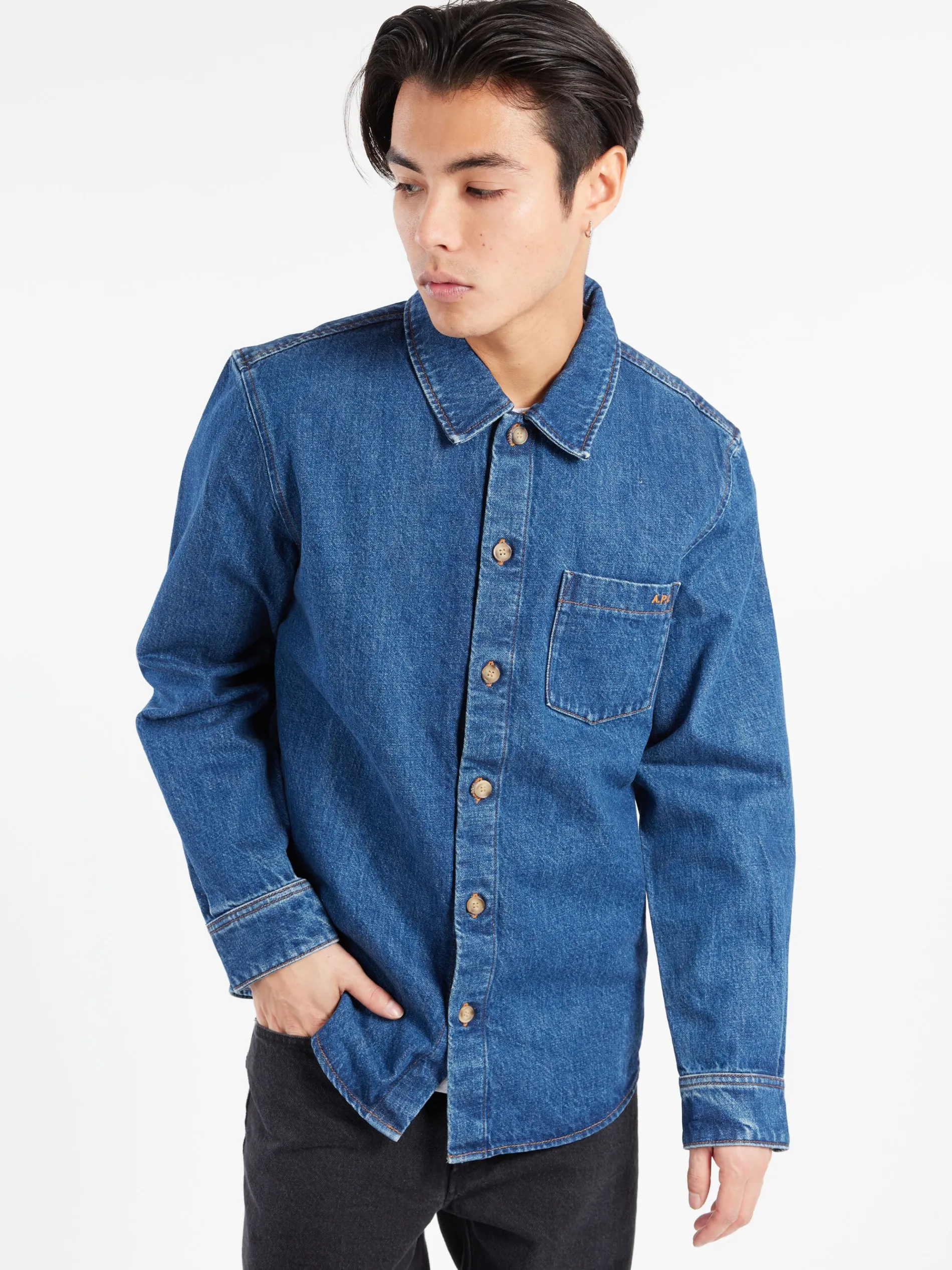 Overshirt in stonewashed indigo Japanese organic cotton denim.