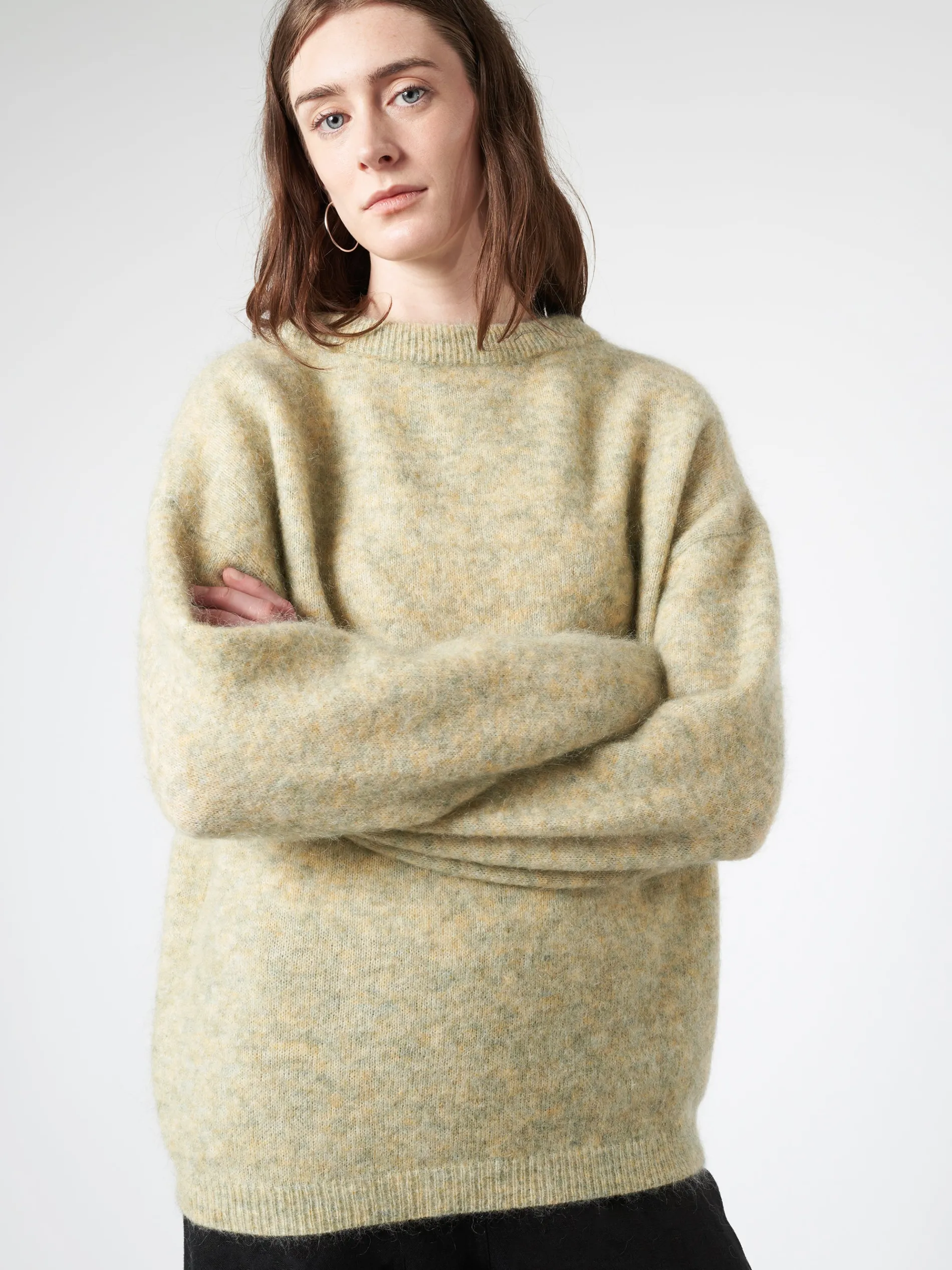 Acne Studios crew neck sweater is crafted from a rich wool mohair blend with a soft and fluffy hand feel.