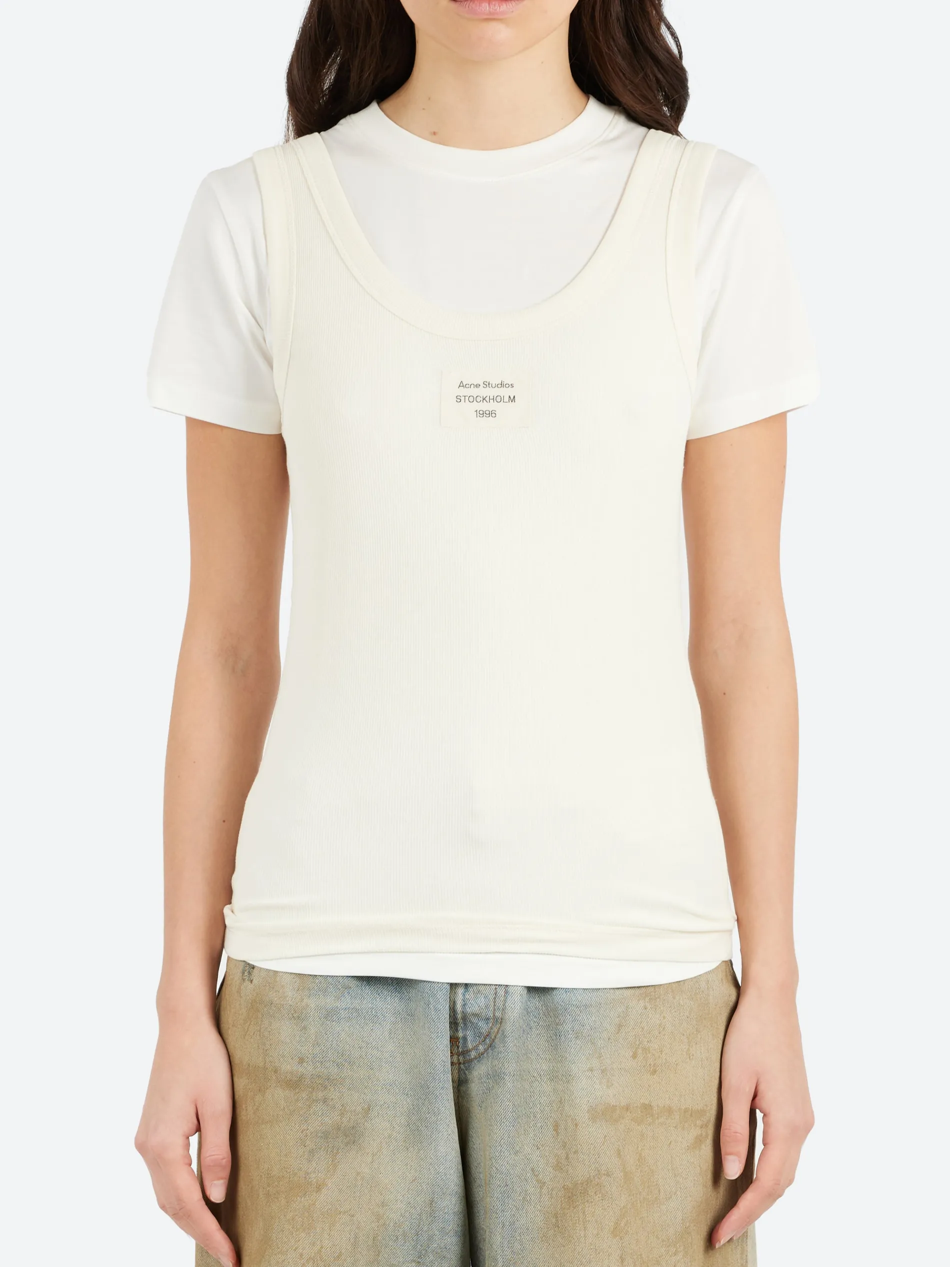 Layered t-shirt features an Acne Studios logo label at the front. Constructed with a fitted t-shirt and tank top.