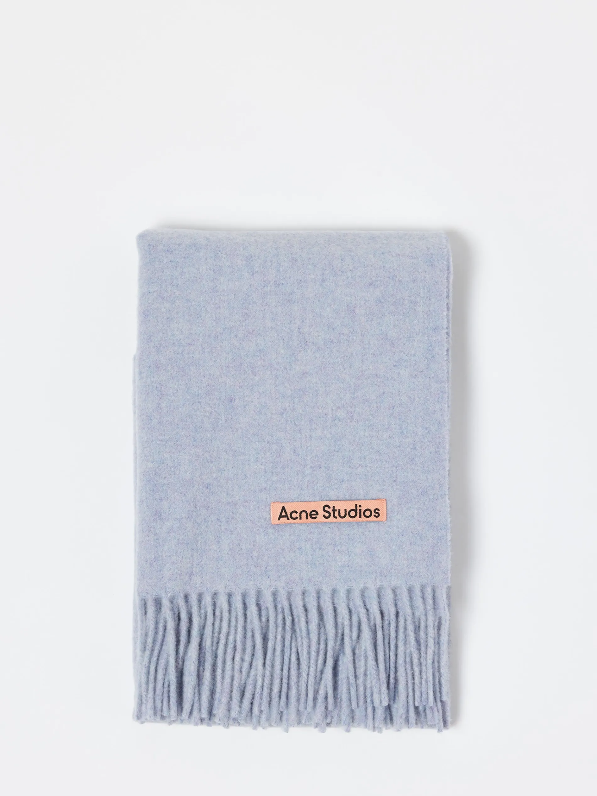 Acne Studios Canada Narrow fringed scarf is crafted from pure wool and finished with a label across one corner.