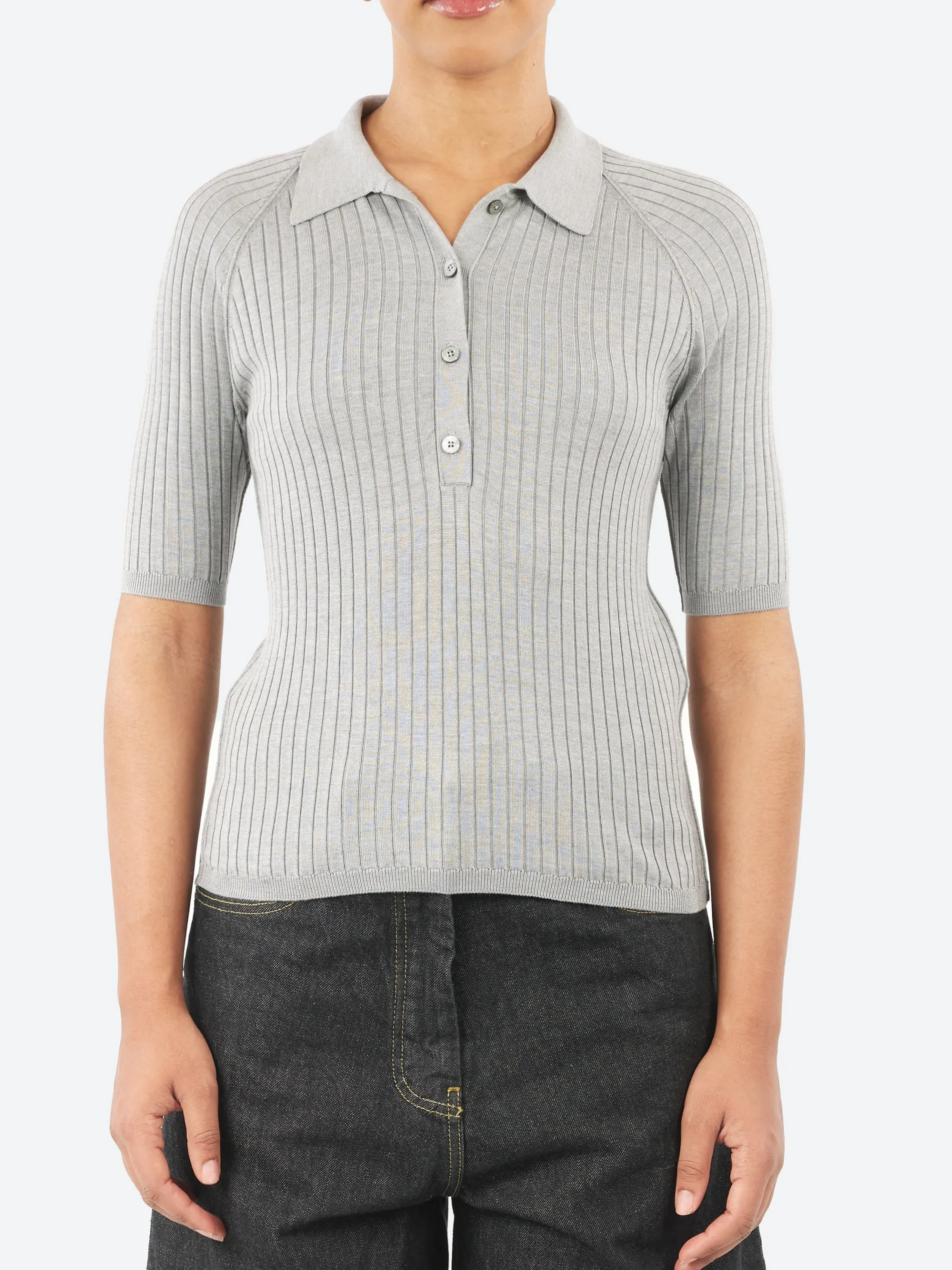 Short sleeve polo shirt is crafted from lightweight ribbed silk, detailed with a silver-toned logo engraved heart charm at the back. Complete with a button-up front opening. Cut to a regular fit and hip length.