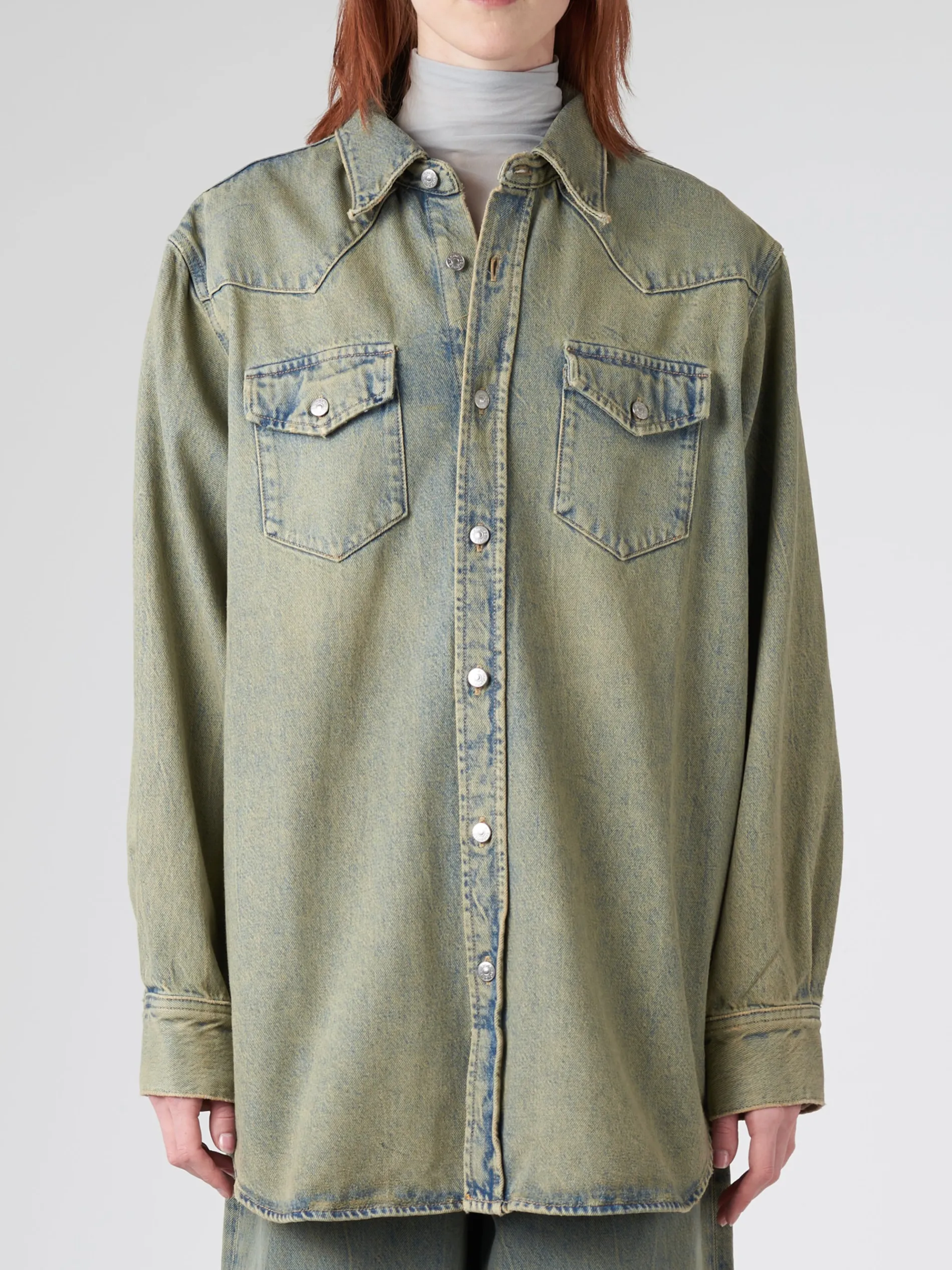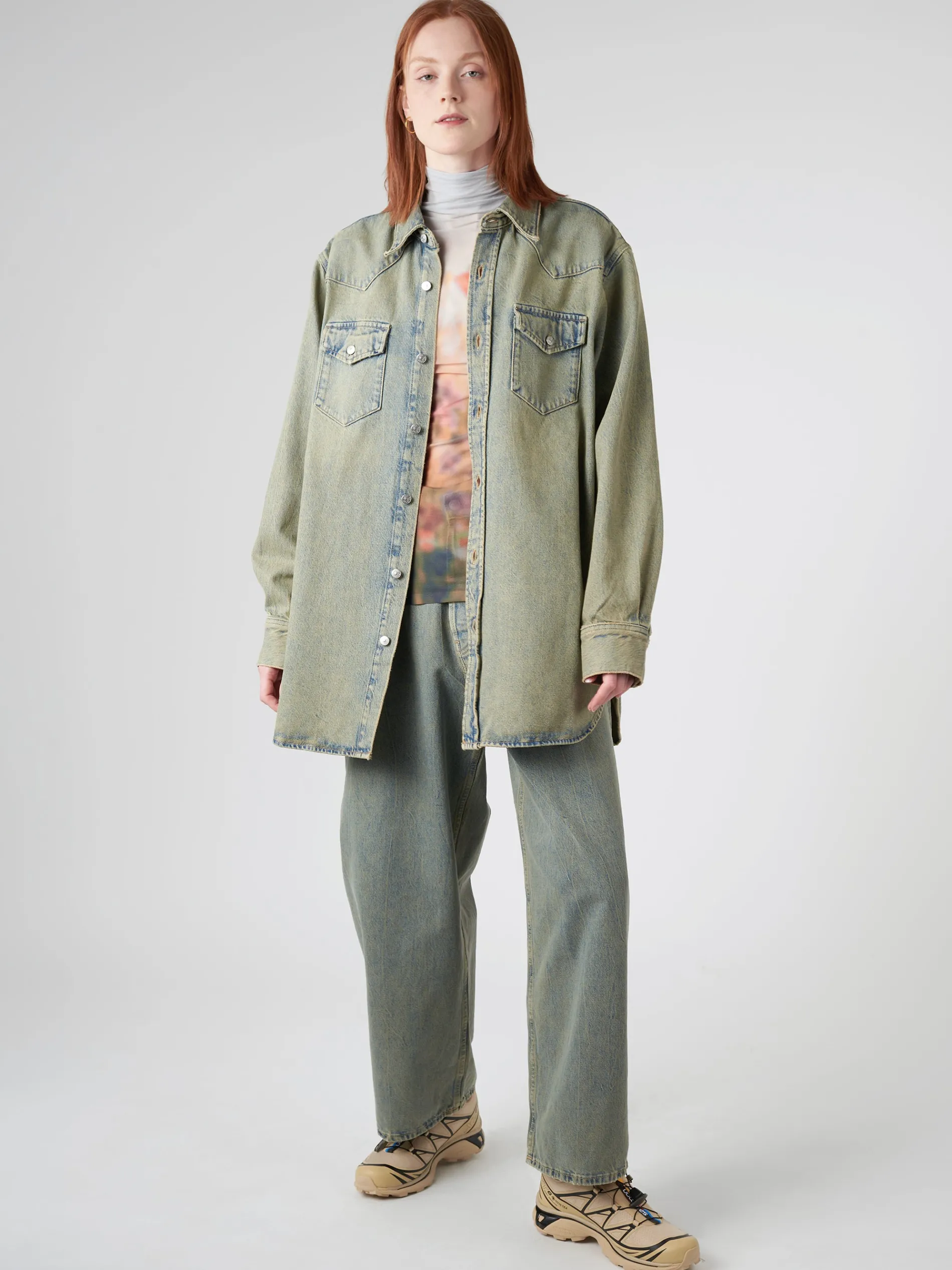 Cut to a relaxed unisex fit with dropped shoulders and below hip length, the Karty Overshirt is crafted from a non-stretch denim in a used blue wash.