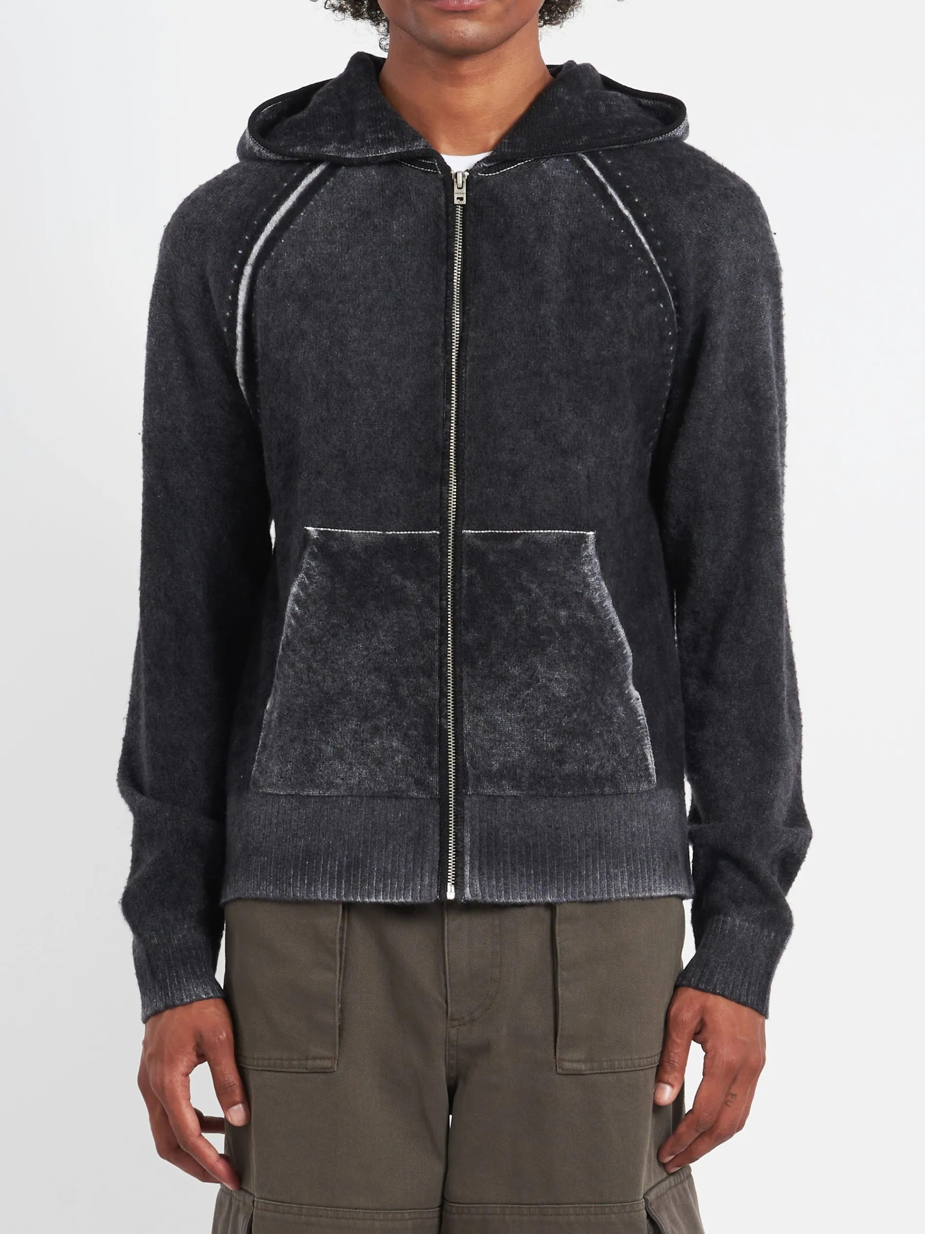 Hooded sweater features an inside print with a vintage finish, crafted from a wool cashmere blend. Detailed with an Acne Studios logo print on the hood.