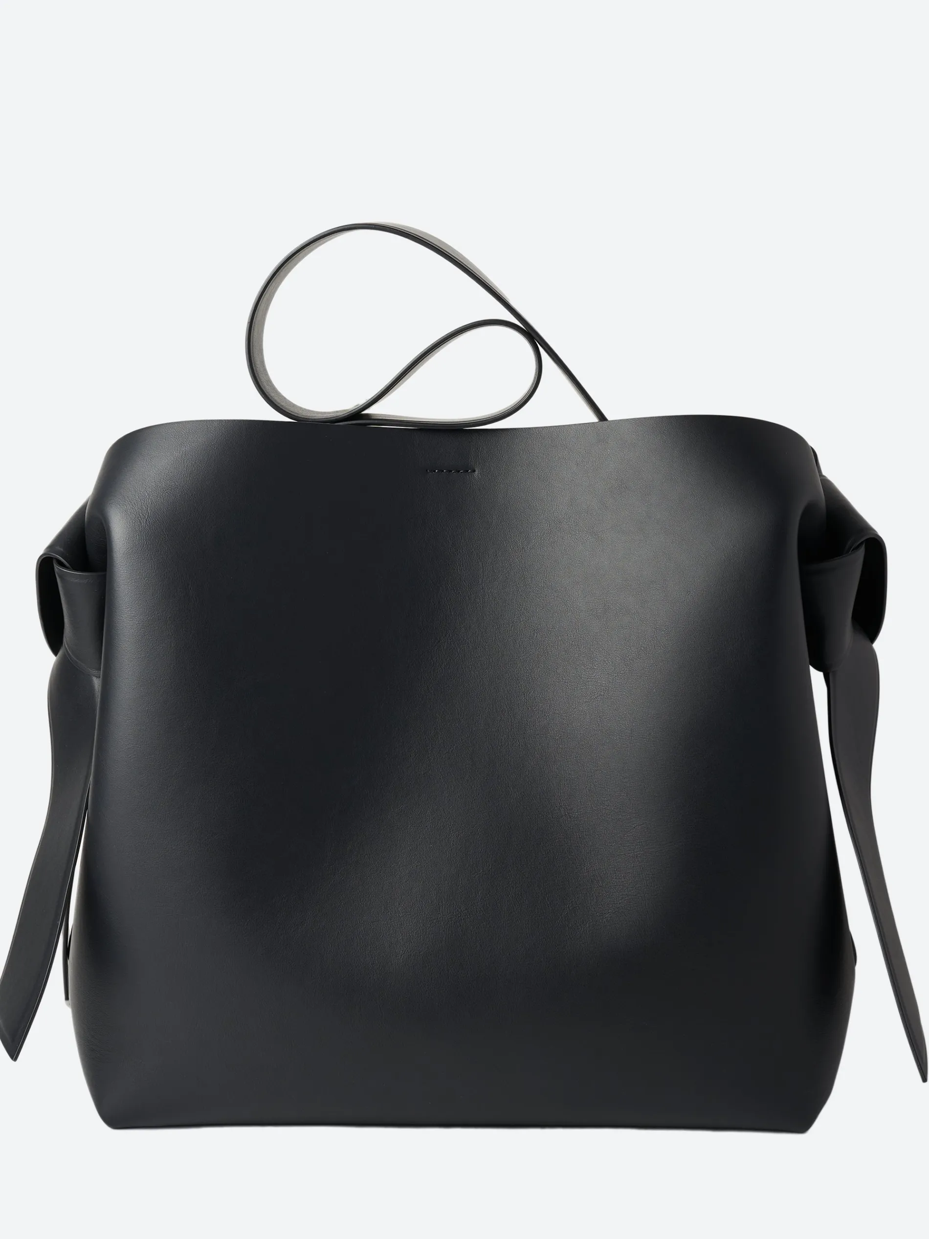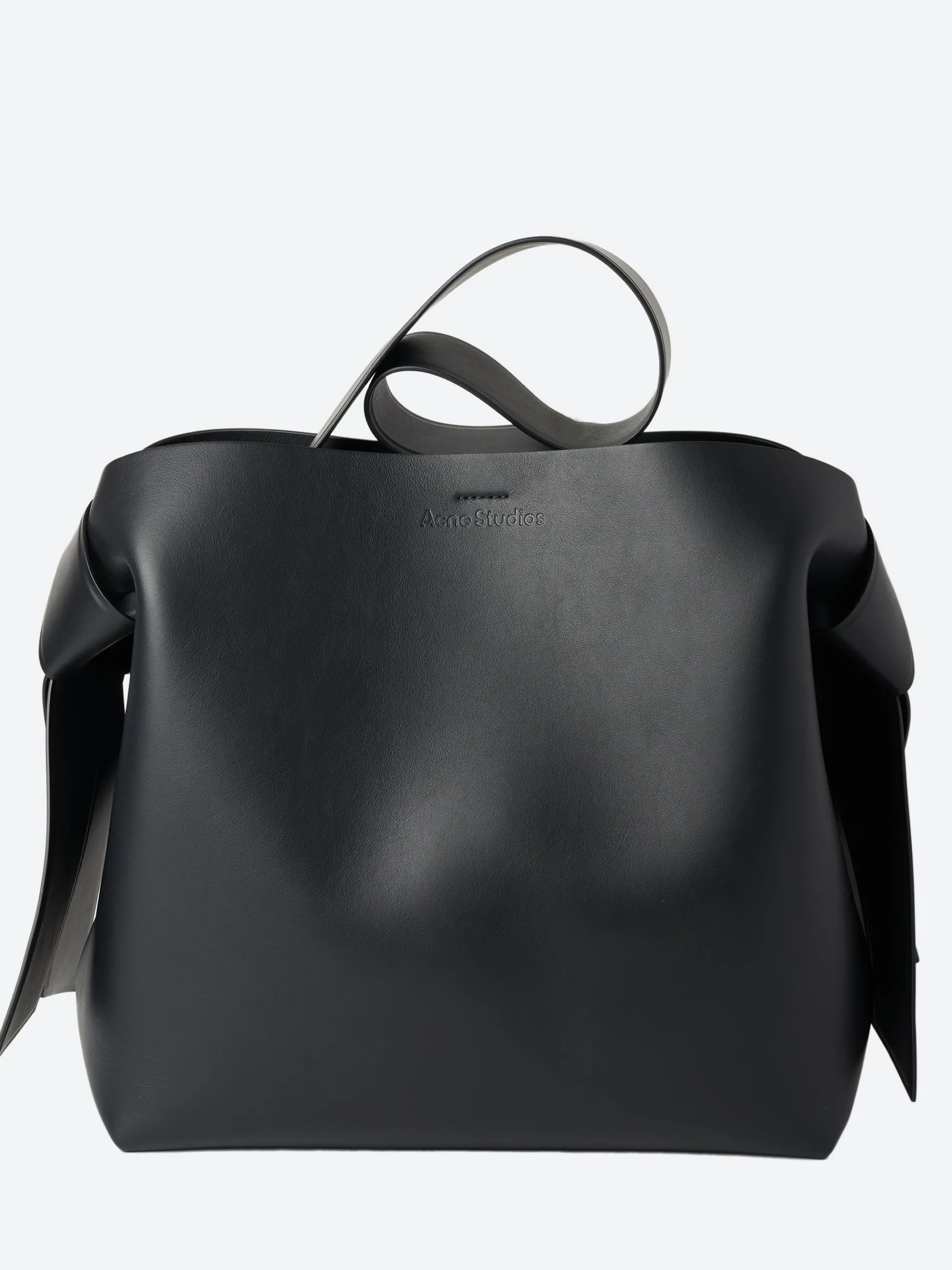 Midi shoulder bag is adorned with twisted musubi knots on each side, inspired by traditional Japanese obi sashes. Crafted from soft leather, detailed with an embossed Acne Studios logo.