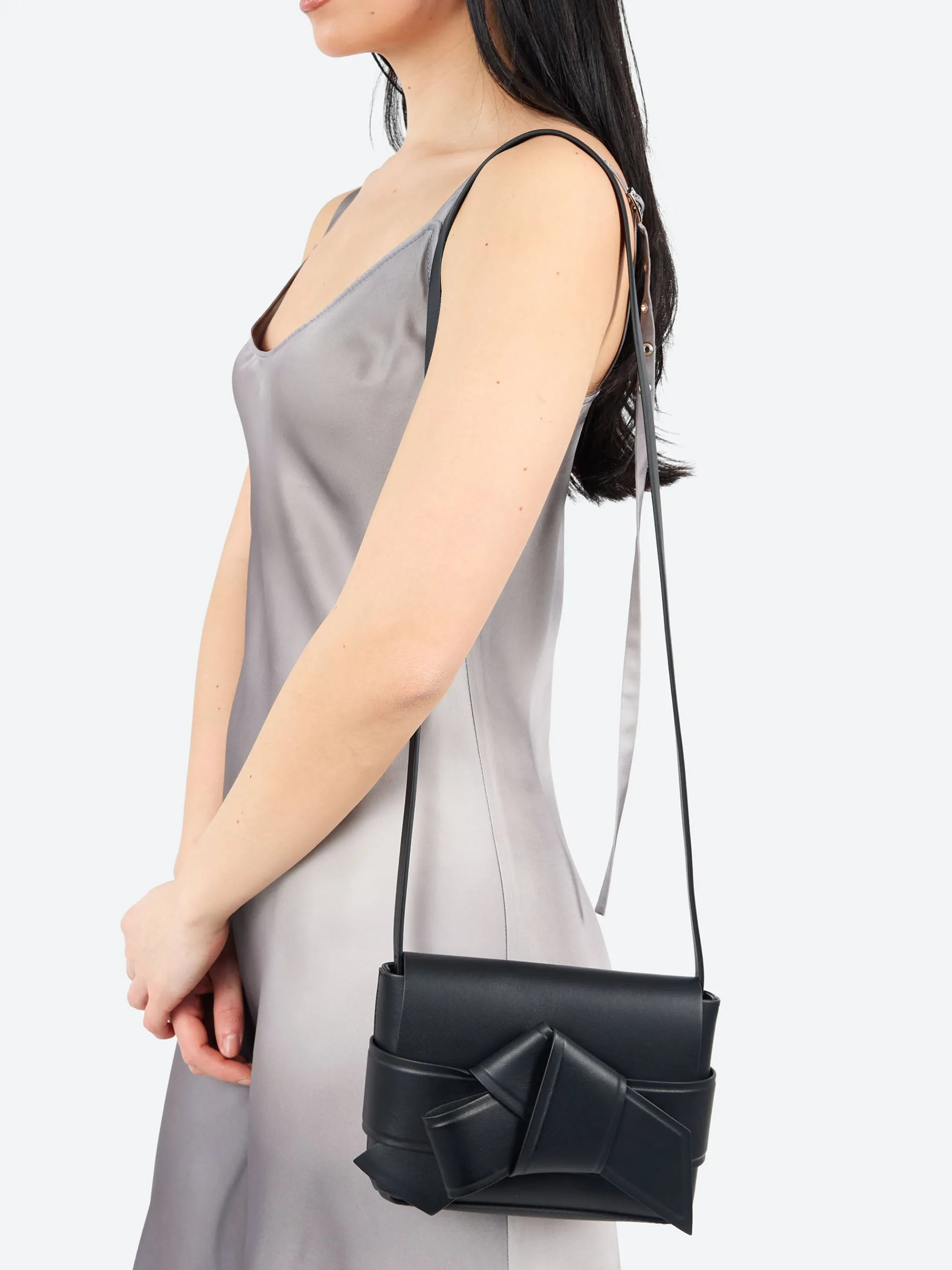 Acne Studios Musubi Mini Crossbody Bag is crafted from smooth leather adorned with a twisted musubi knot on the front, inspired by the traditional Japanese obi sashes. Complete with interior card slots and an adjustable crossbody strap.