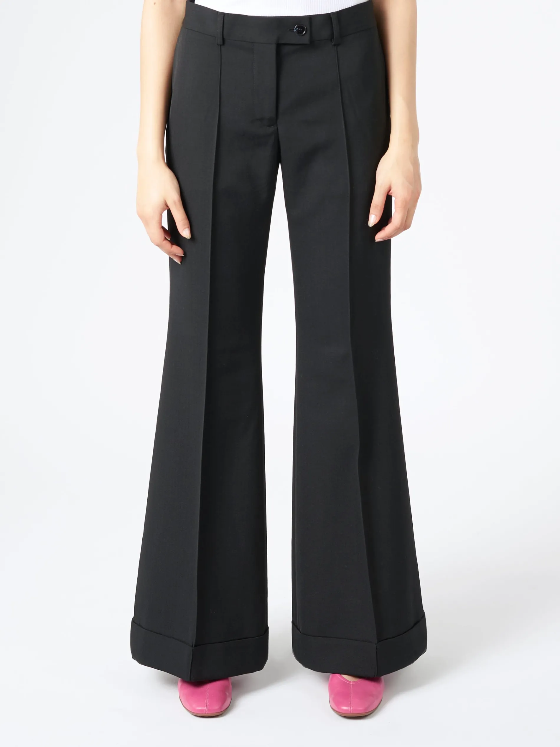 Acne Studios tailored trousers are crafted from a wool blend, detailed with front topstitched leg pleats and fold-up hem. Cut to a regular fit with a mid-waist, flared leg and long length.
