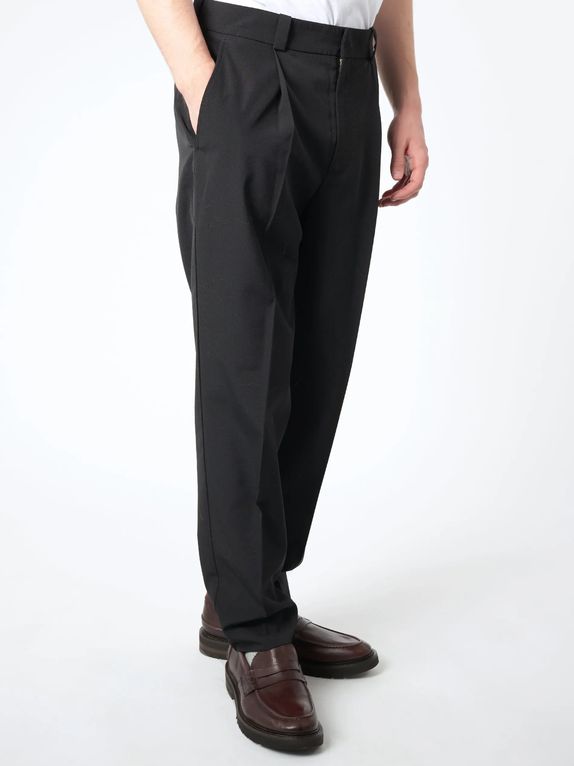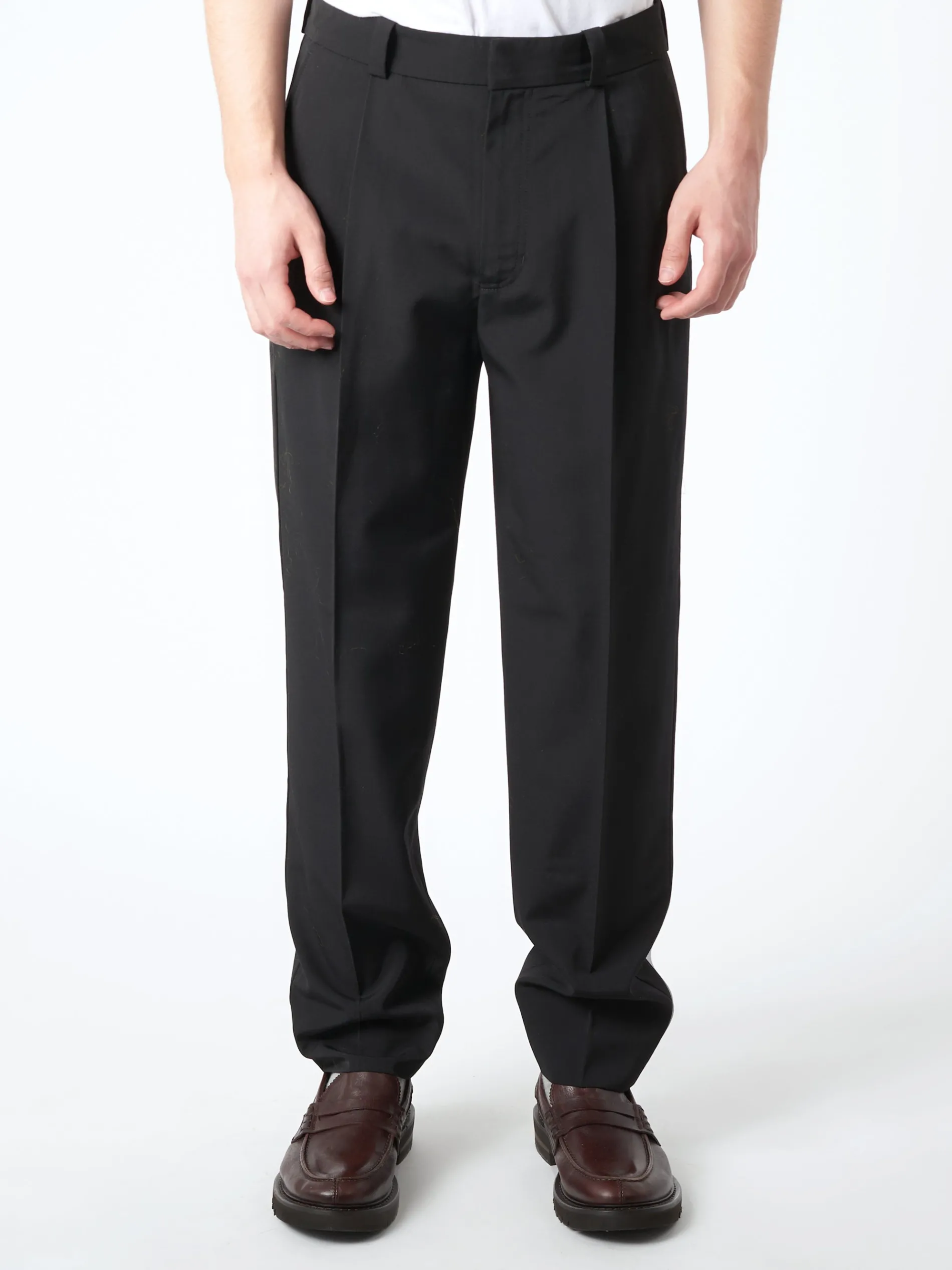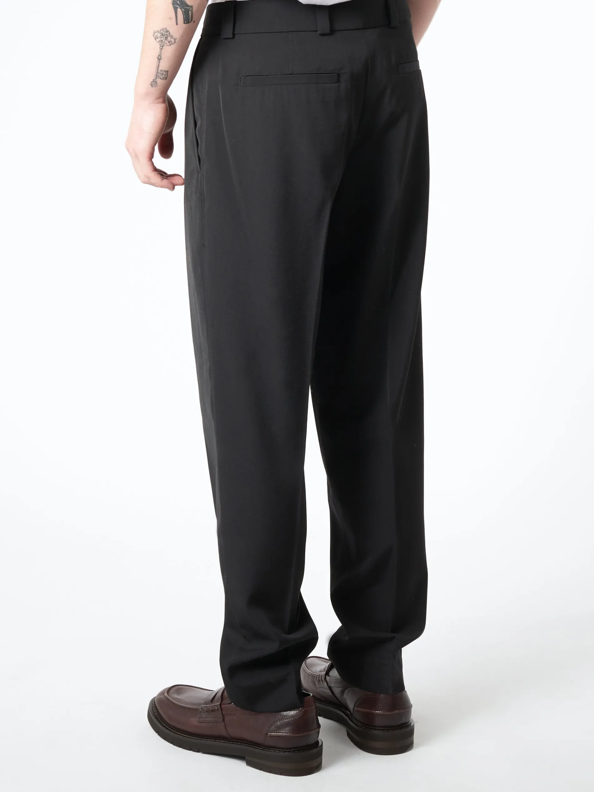 Tailored suit trousers are cut to a regular fit and long length. Crafted from a wool blend, detailed with front and back leg creases.
