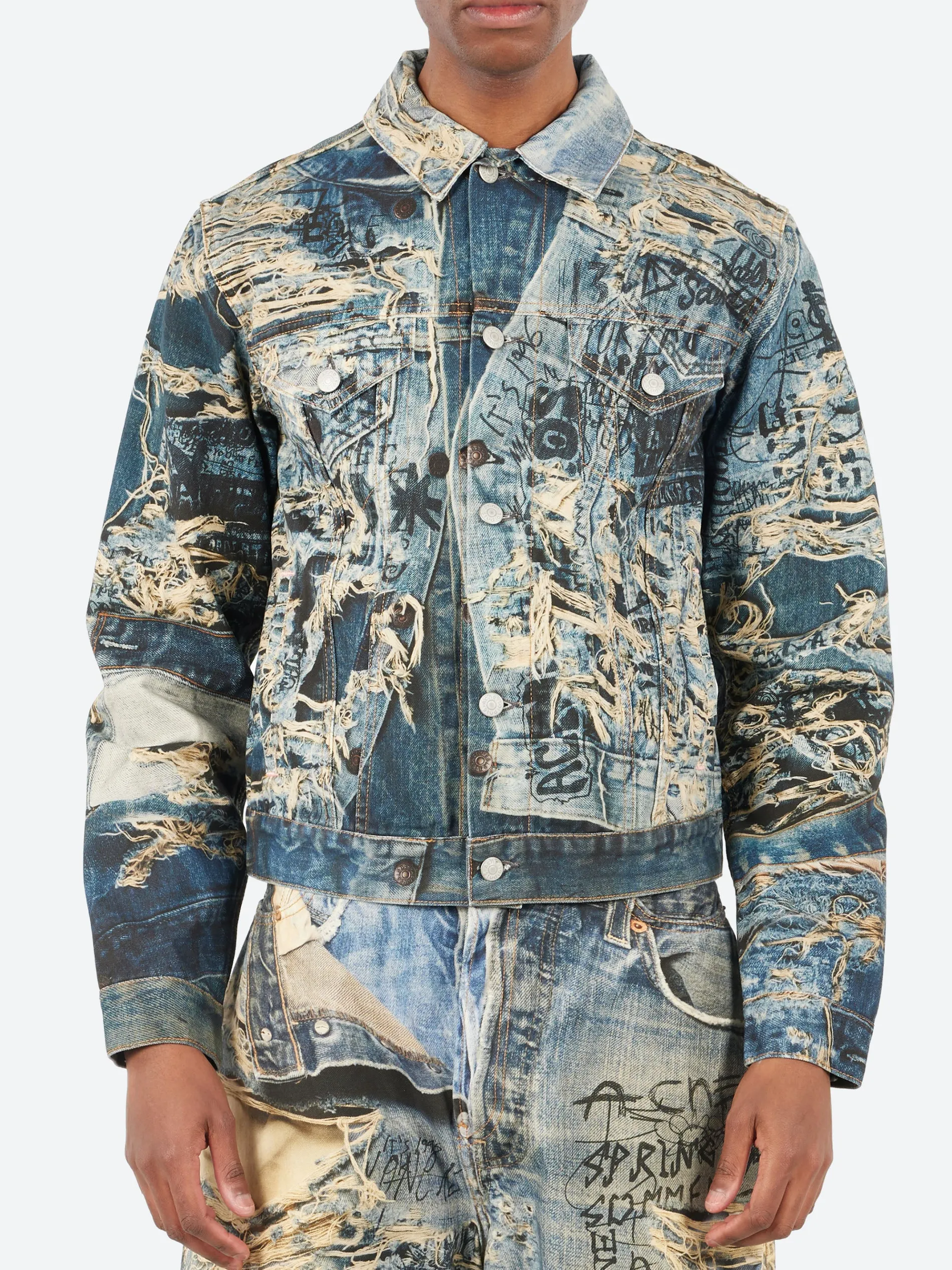Denim jacket adorned with a seasonal trompe l’oeil ‘torn scribble’ print, crafted from non-stretch denim with a mineral tint. Cut to a regular fit and waist length.