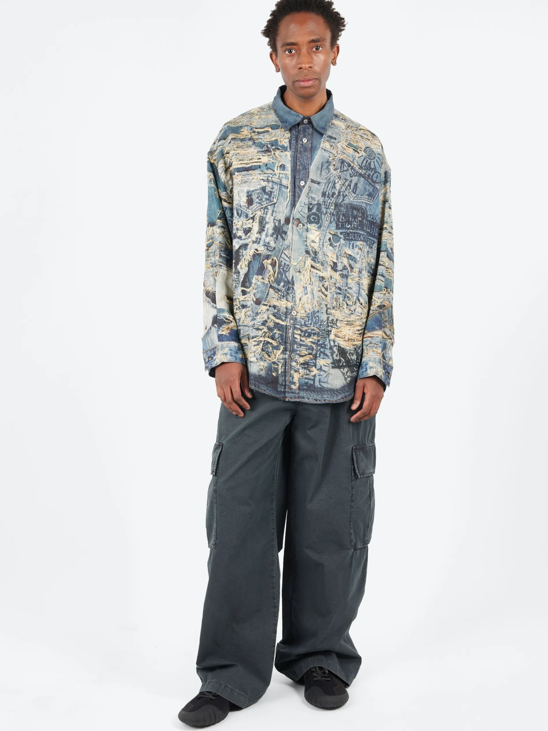 Button-up shirt is crafted in lightweight linen, adorned with a seasonal trompe l’oeil distressed denim print and logo. Cut to a relaxed fit and below hip length.