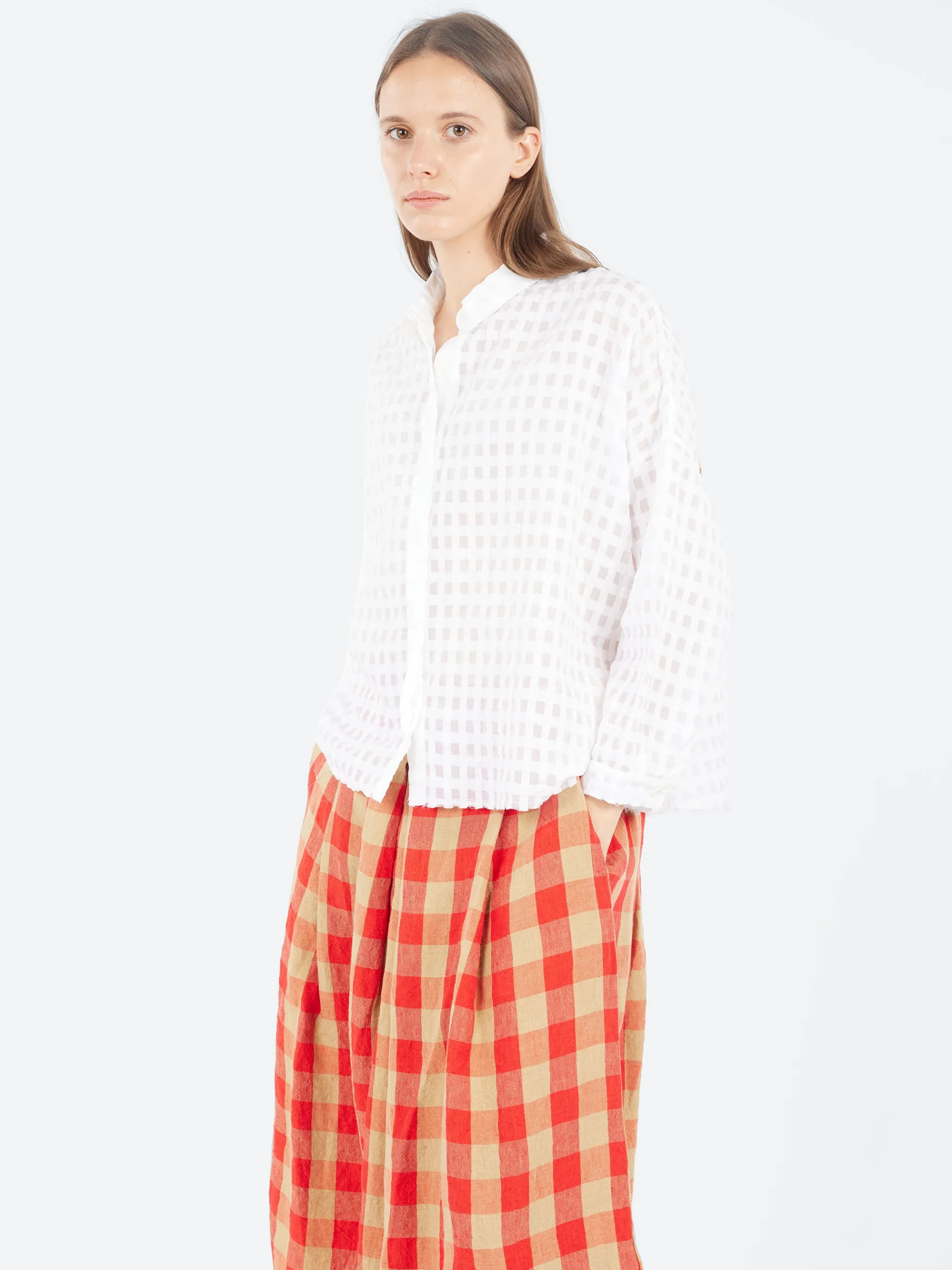 The Aequamente Seersucker Shirt is thoughtfully crafted with a loose-fitting design, offering a relaxed, airy feel that allows for greater freedom of movement and a more laid-back, effortless look. Featuring a classic collar, button-up front, and long sleeves, this shirt is made from self-check cotton and silk seersucker fabric for a timeless, refined look.