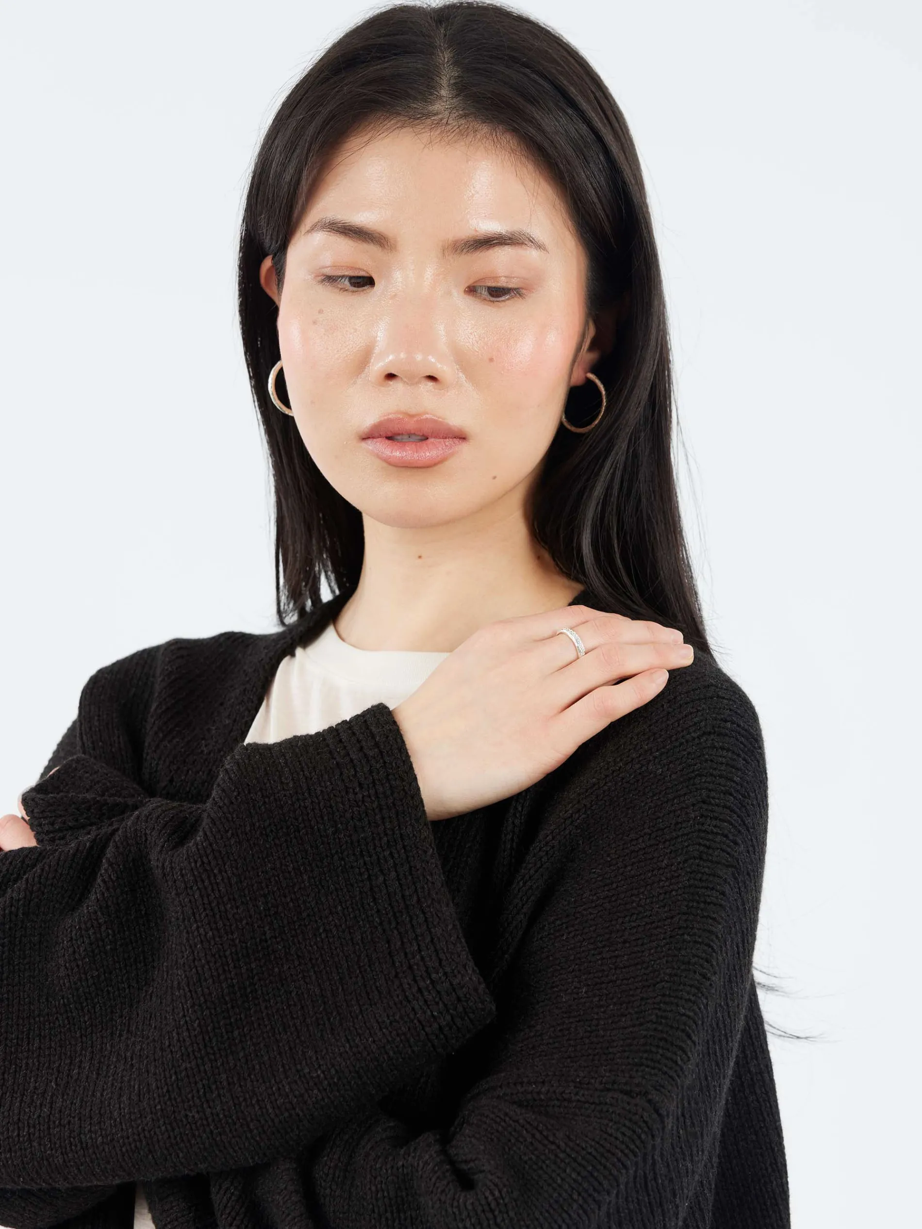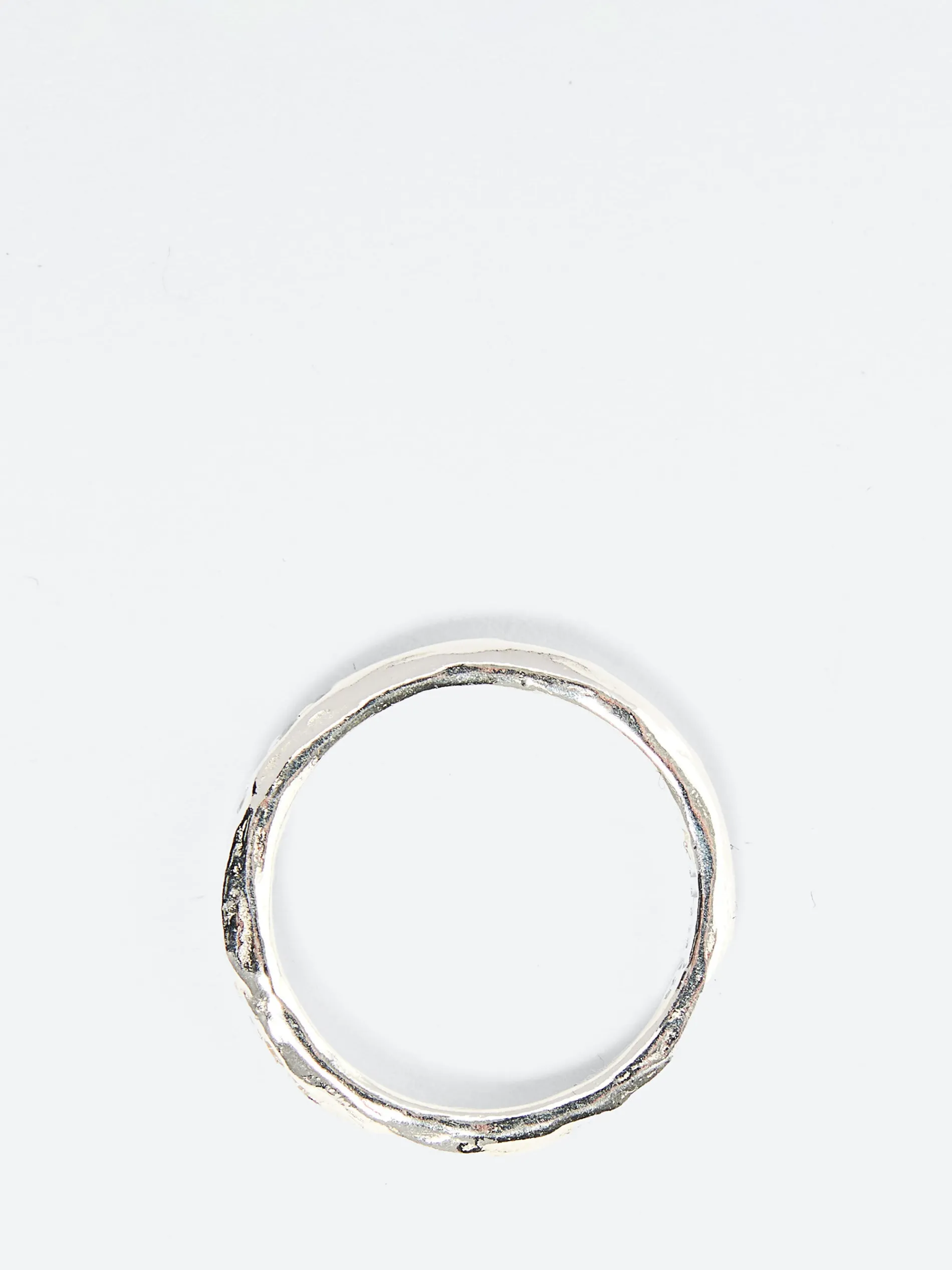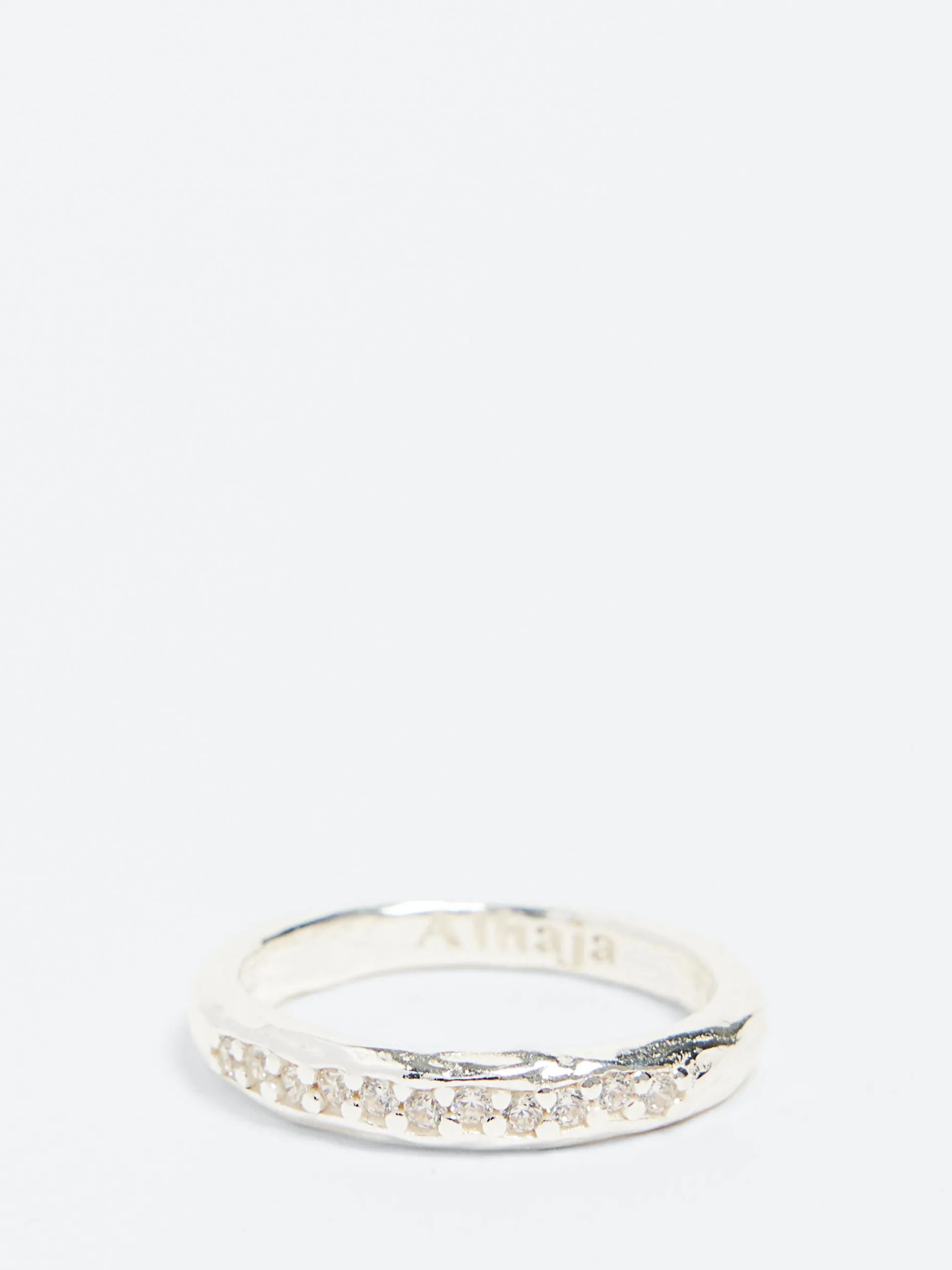 The Casilda Ring from Alhaja is an elegant eternity band that combines timeless design with a touch of ancient inspiration. Crafted with a textured finish reminiscent of ancient relics, this ring features a row of carved zircons, adding a subtle sparkle to its rugged aesthetic.
