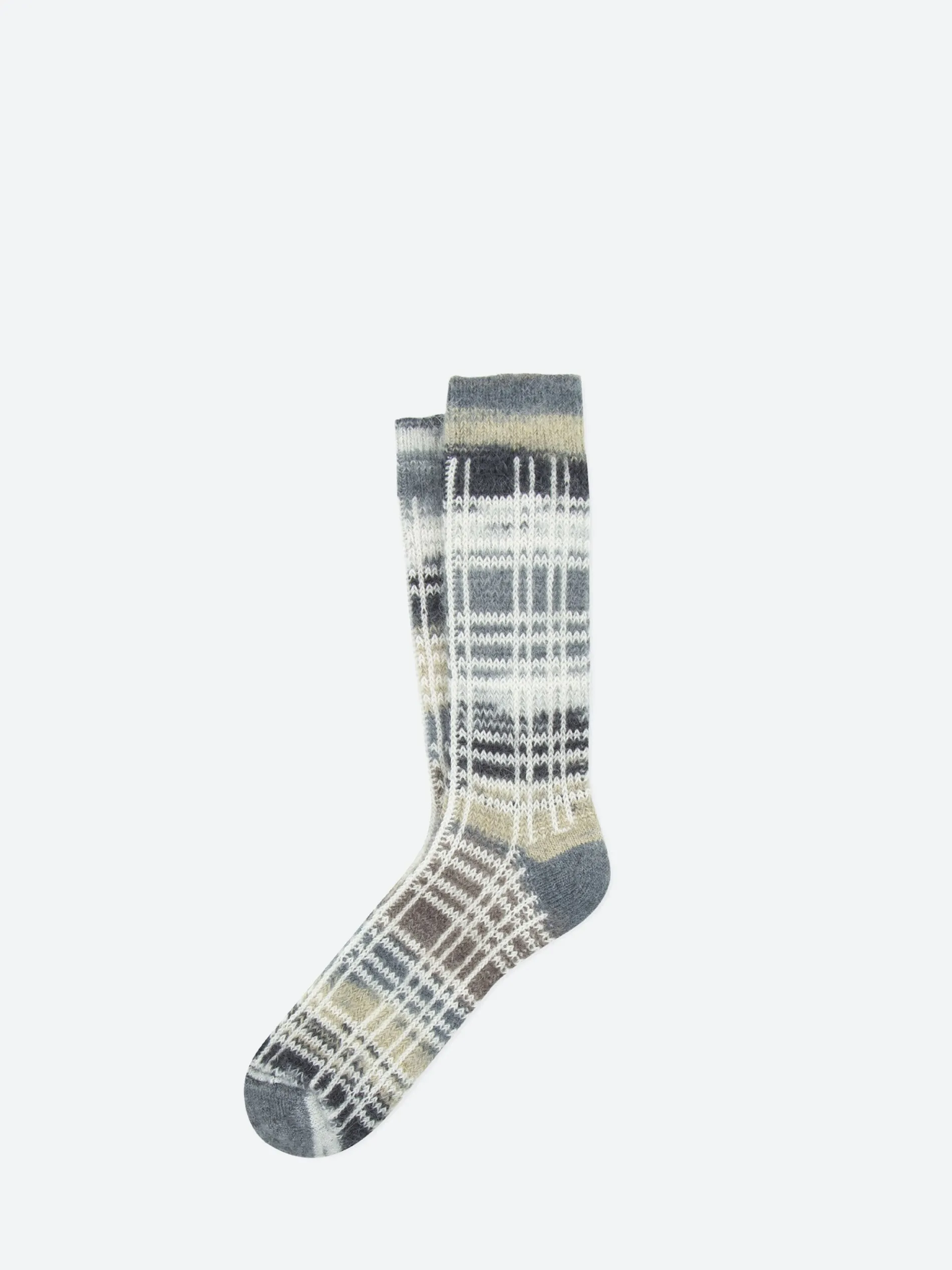 Crew socks knit in a multicolored mohair-alpaca blend, featuring a check design.