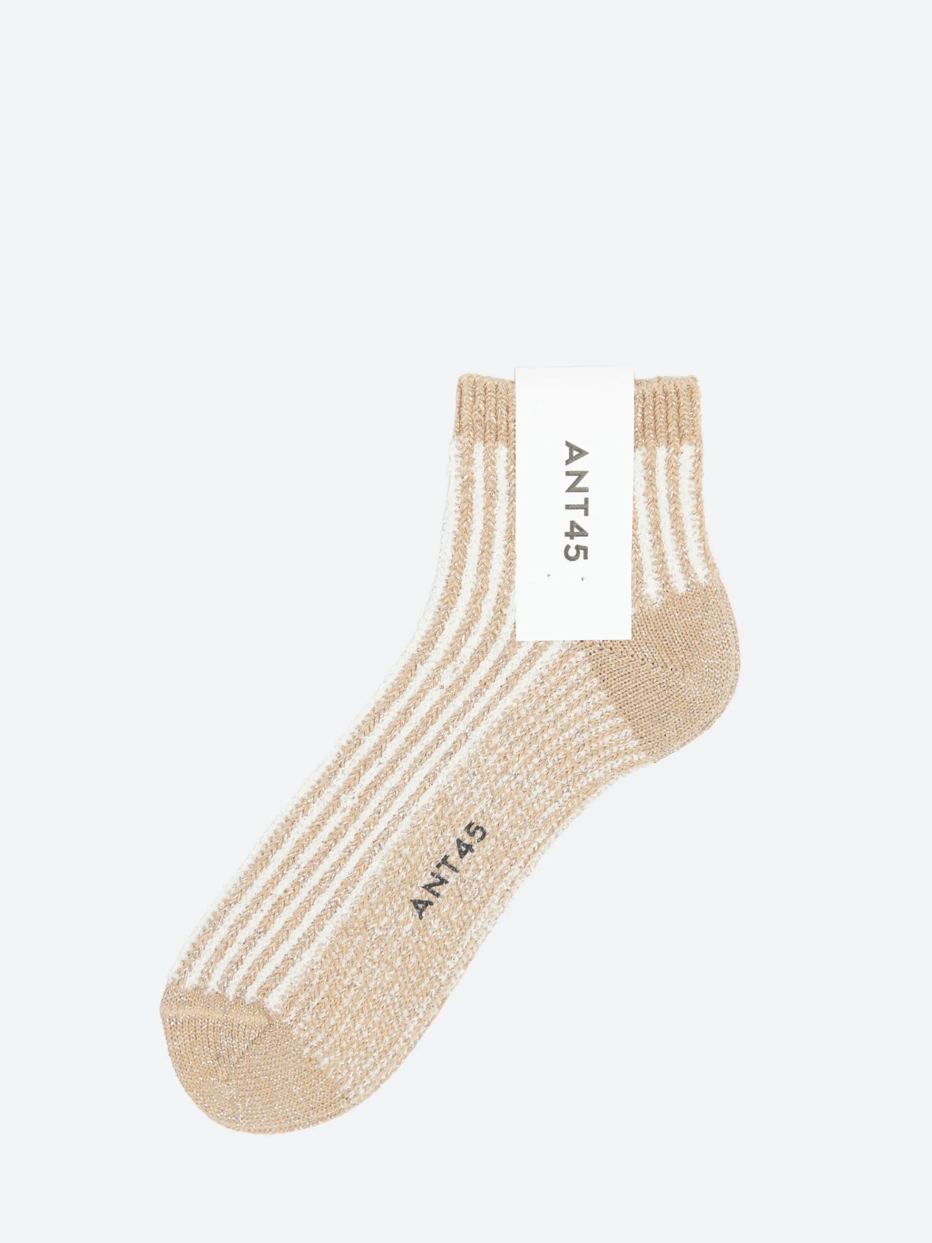The Plata from ANT45 is a pair of striped short socks crafted from a soft cotton-mélange blend with a touch of metallic fibers, offering a subtle shimmer. These socks are designed with contrasting stripes, adding a stylish accent to your footwear.