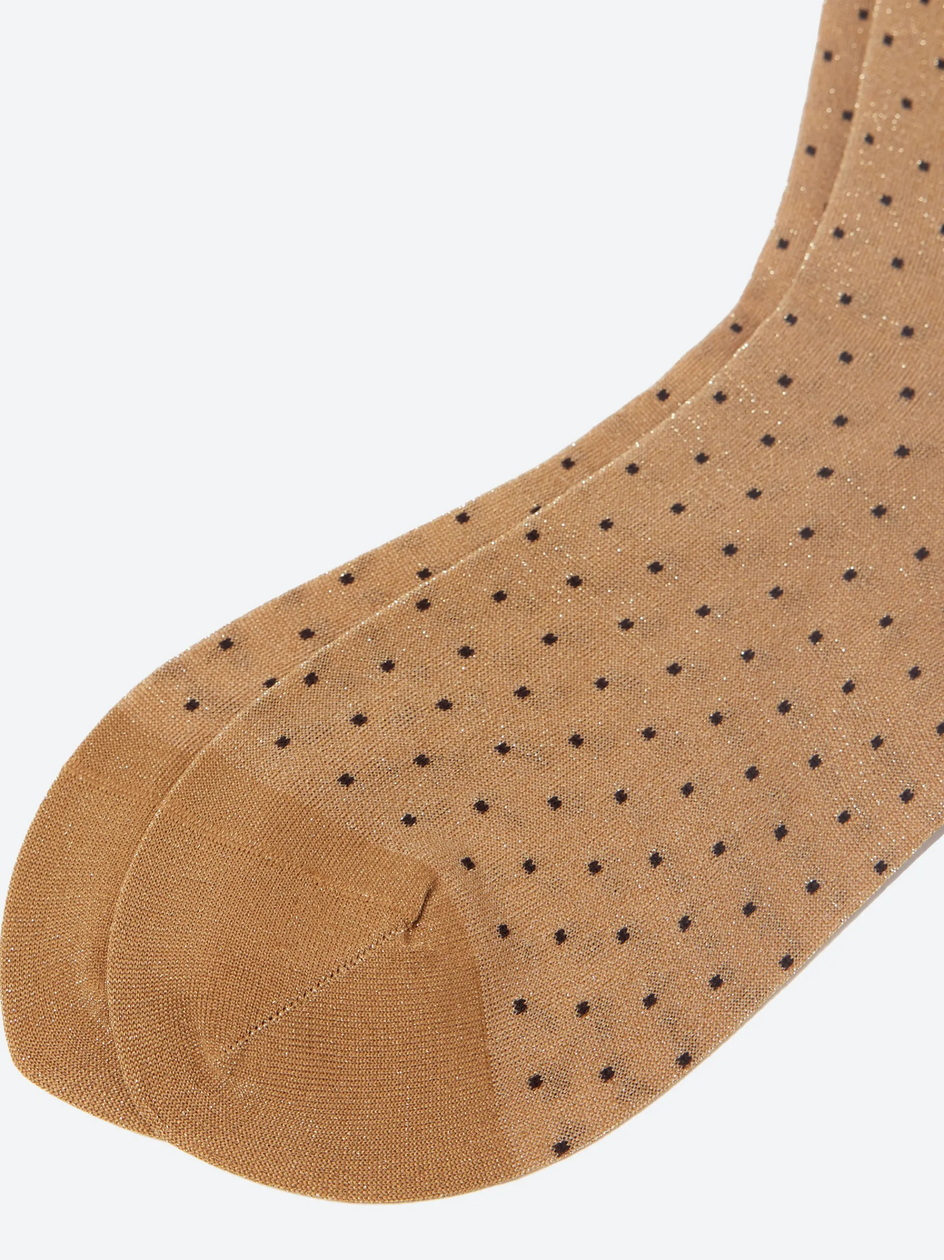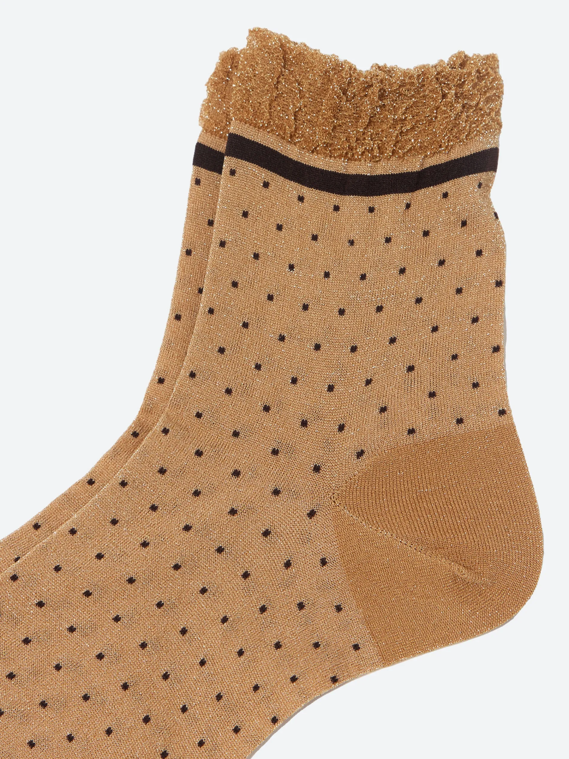 Antipast The Sky Point Socks are knitted in a fine-gauge blend, featuring a charming polka dot jacquard pattern. The socks are finished with a delicate ruffled cuff edge and have a classic crew height. With just the right amount of glitter, they offer a special, sparkling touch to elevate your look.