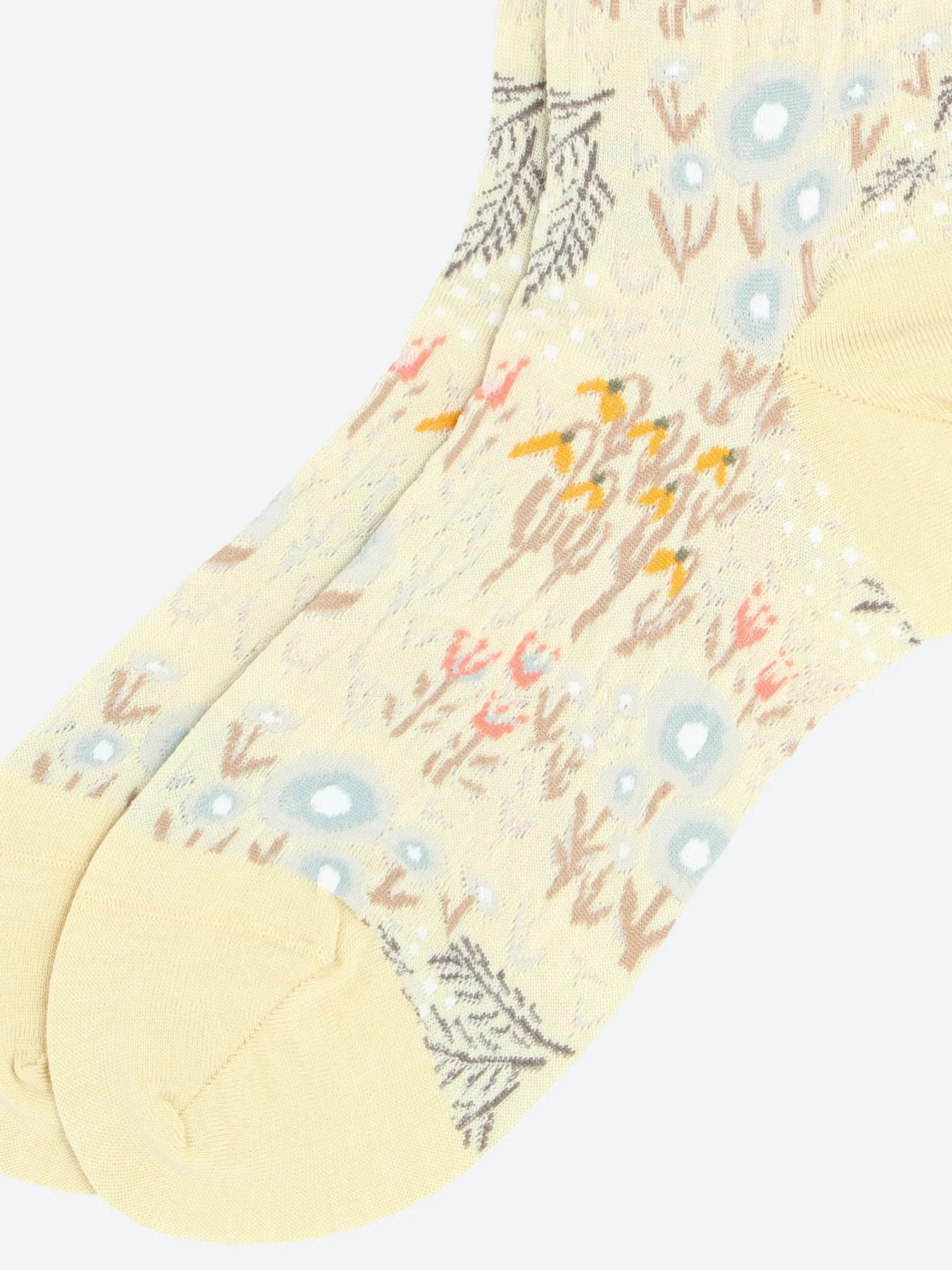 Antipast crew socks knitted in a fine gauge blend with a floral jacquard pattern.