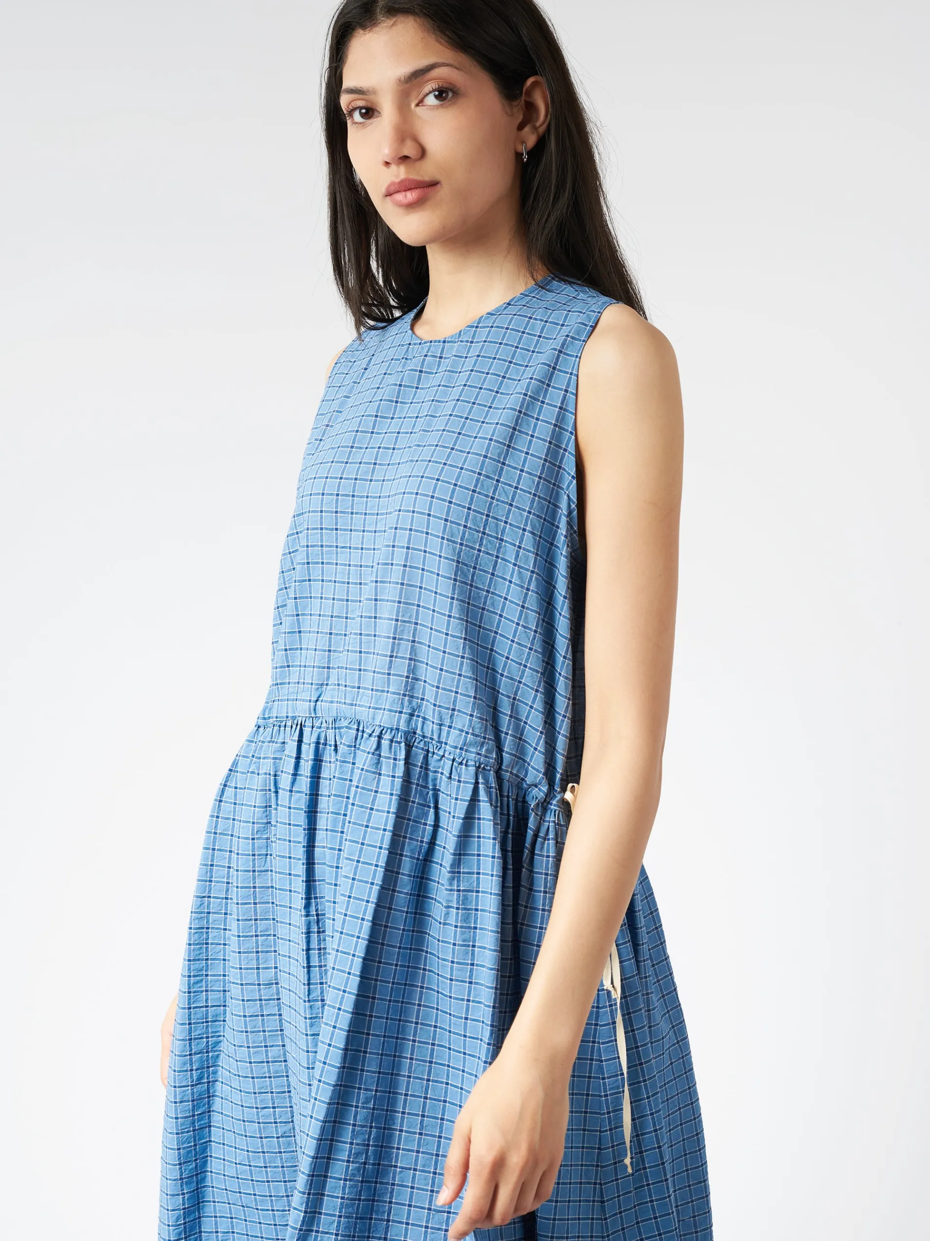 Oversized sleeveless dress with a gathered skirt, with an inner drawstring to cinch the waist.