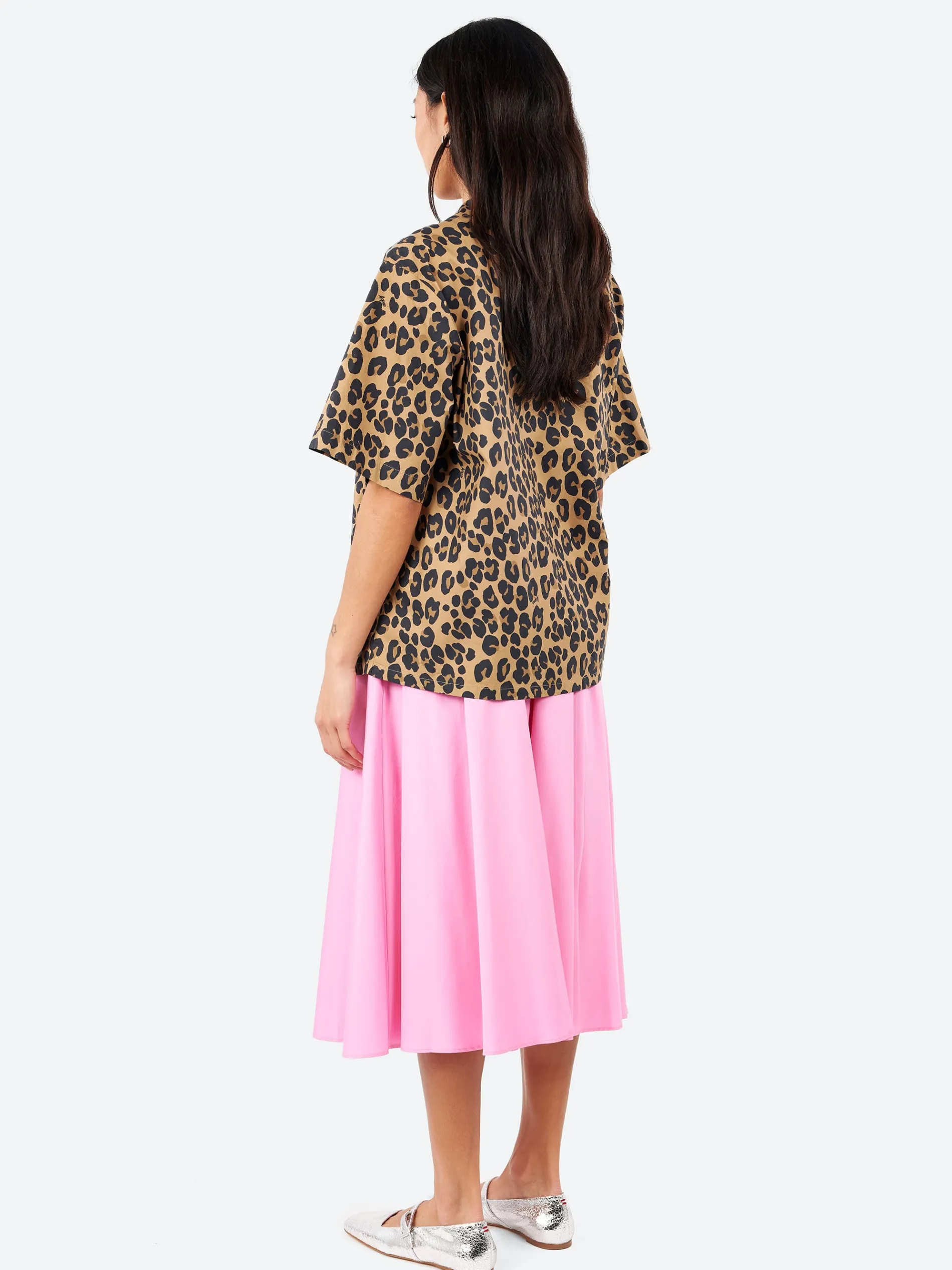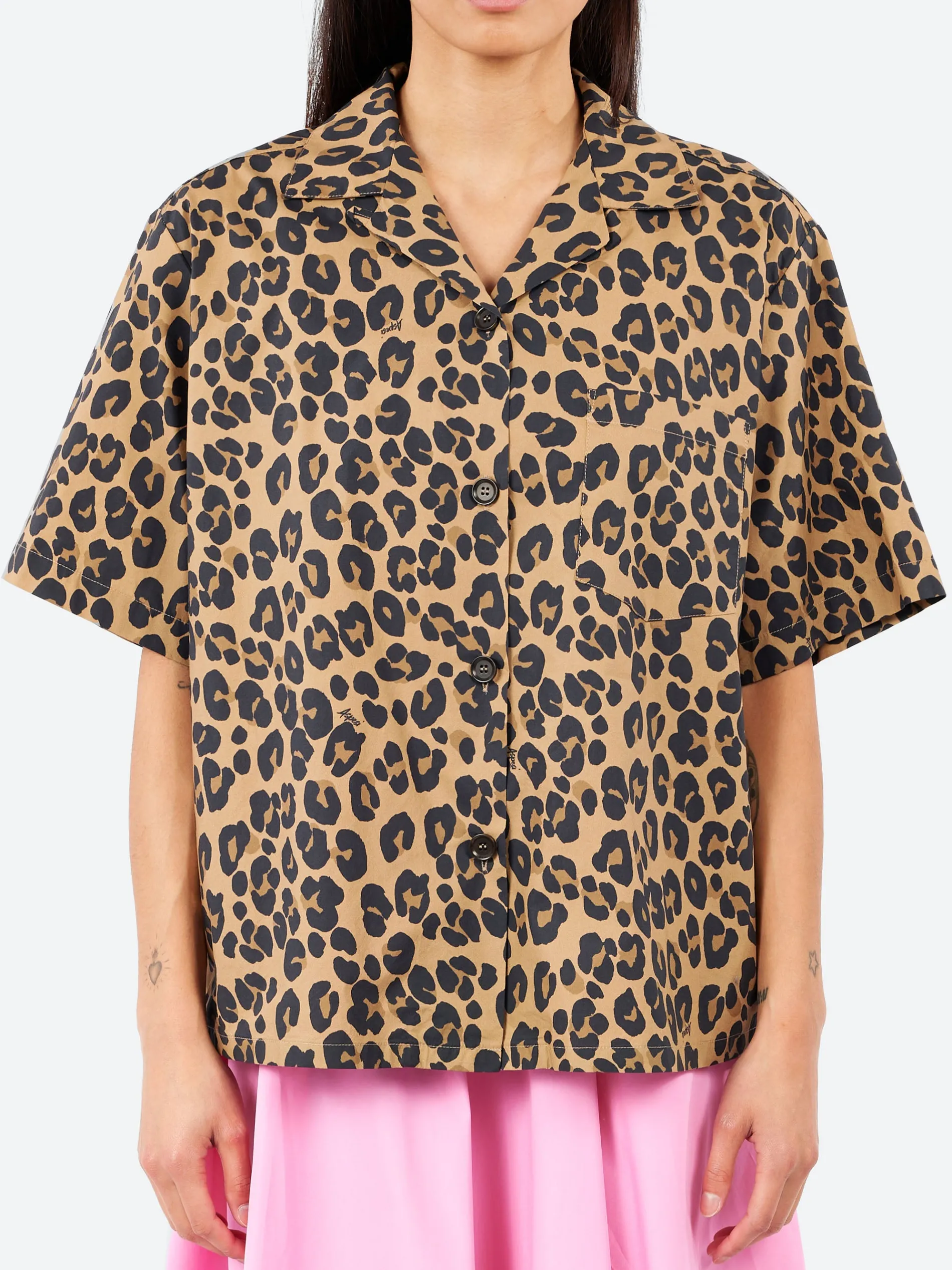 Aspesi boxy-cut shirt is made from pure cotton poplin and features a vibrant all-over leopard print. The half-sleeve design is complemented by a stylish bowling collar, front buttoning, and a straight hem. With a loose fit, this shirt combines comfort and bold style, making it a standout piece for any wardrobe.
