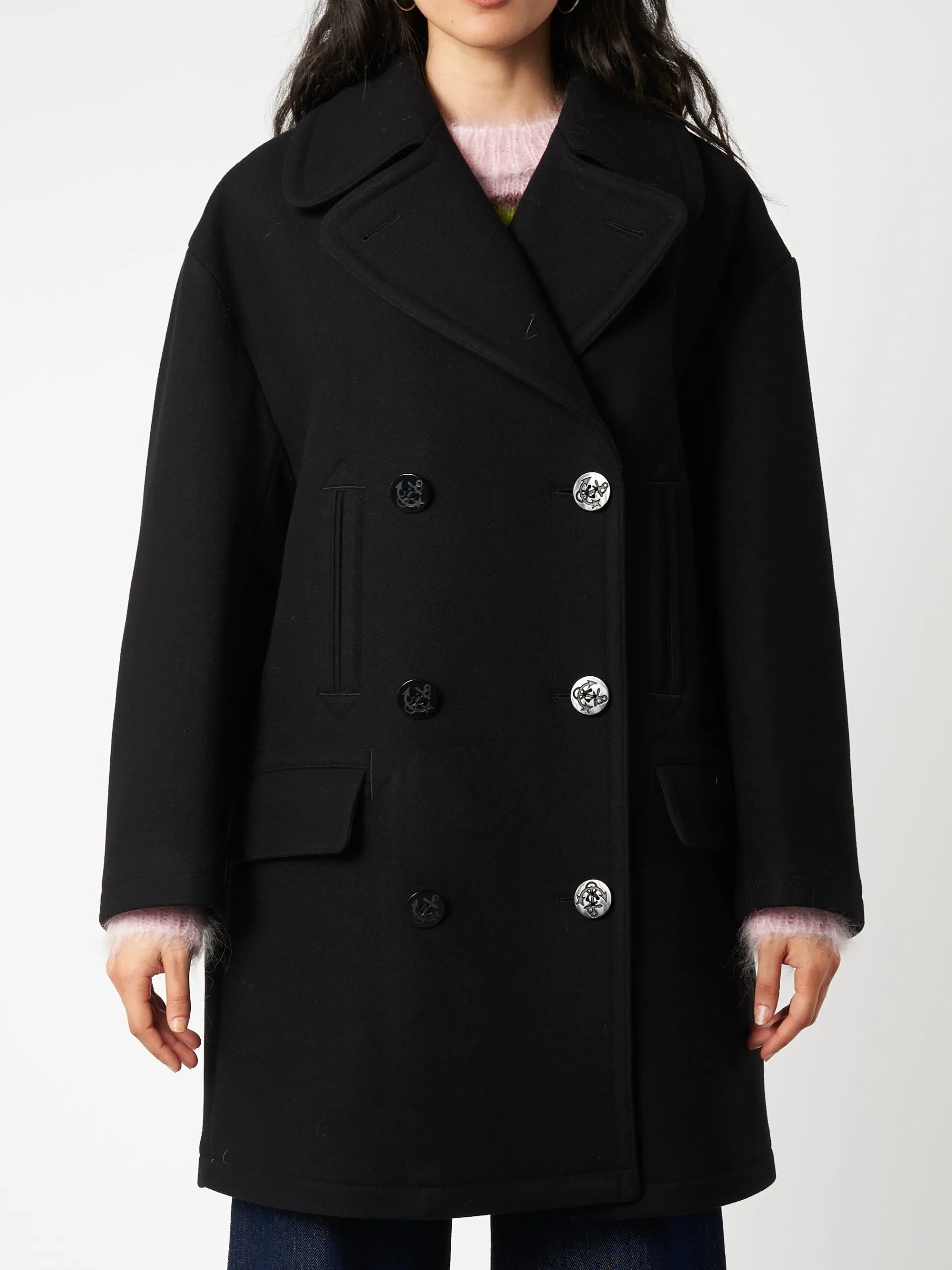 Aspesi peacoat tailored from an insulating wool-blend and has a classic double-breast profile.