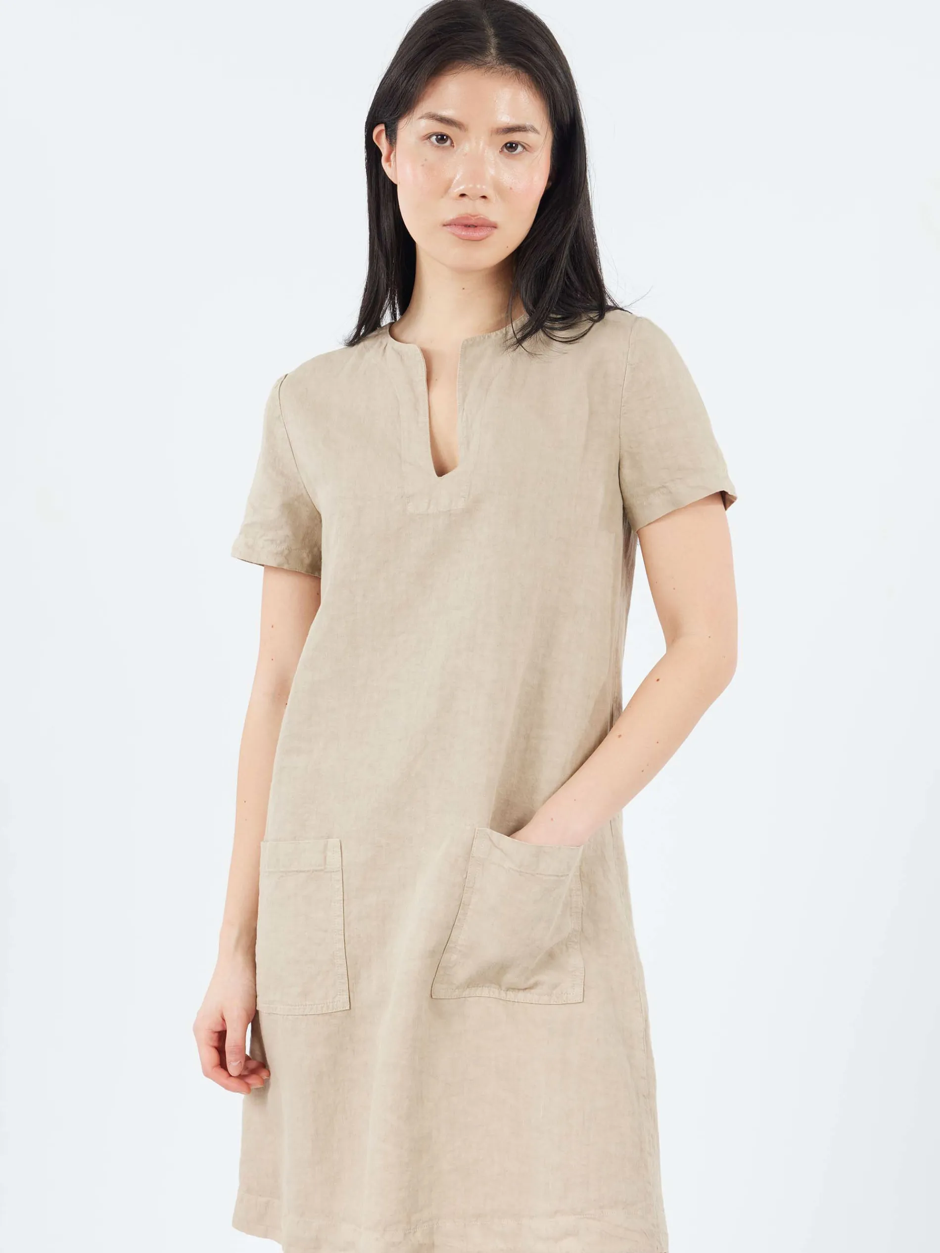 The Aspesi garment-dyed slub linen dress offers a compact feel with a slightly flared A-line silhouette. It features short sleeves, a crew neck with a front opening, and two front patch pockets for added practicality. The dress is finished with a central zip fastening at the back. With its unlined design, this dress combines effortless style with comfort, perfect for warm-weather wear.