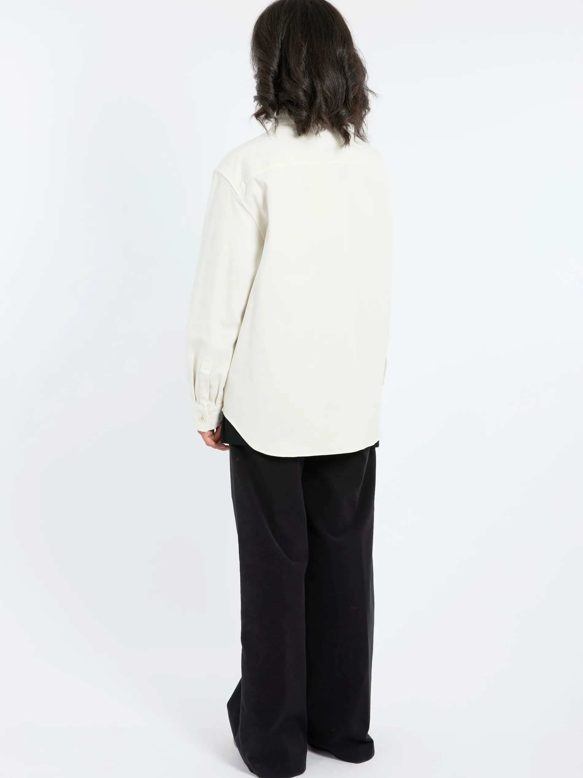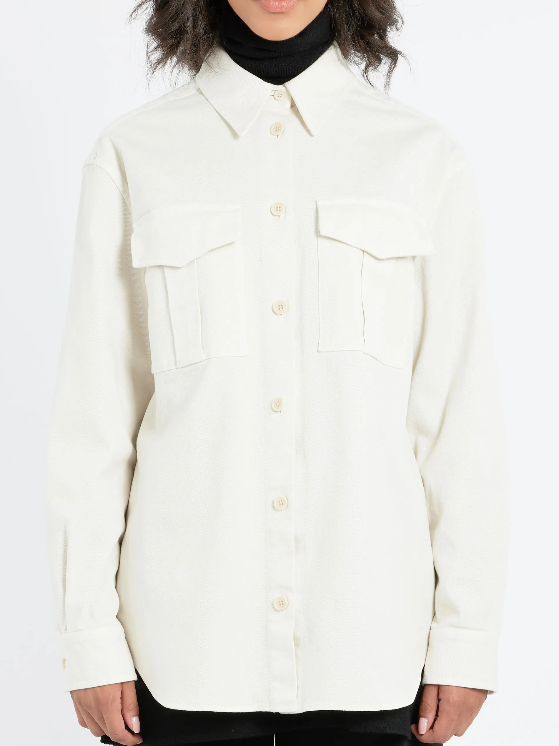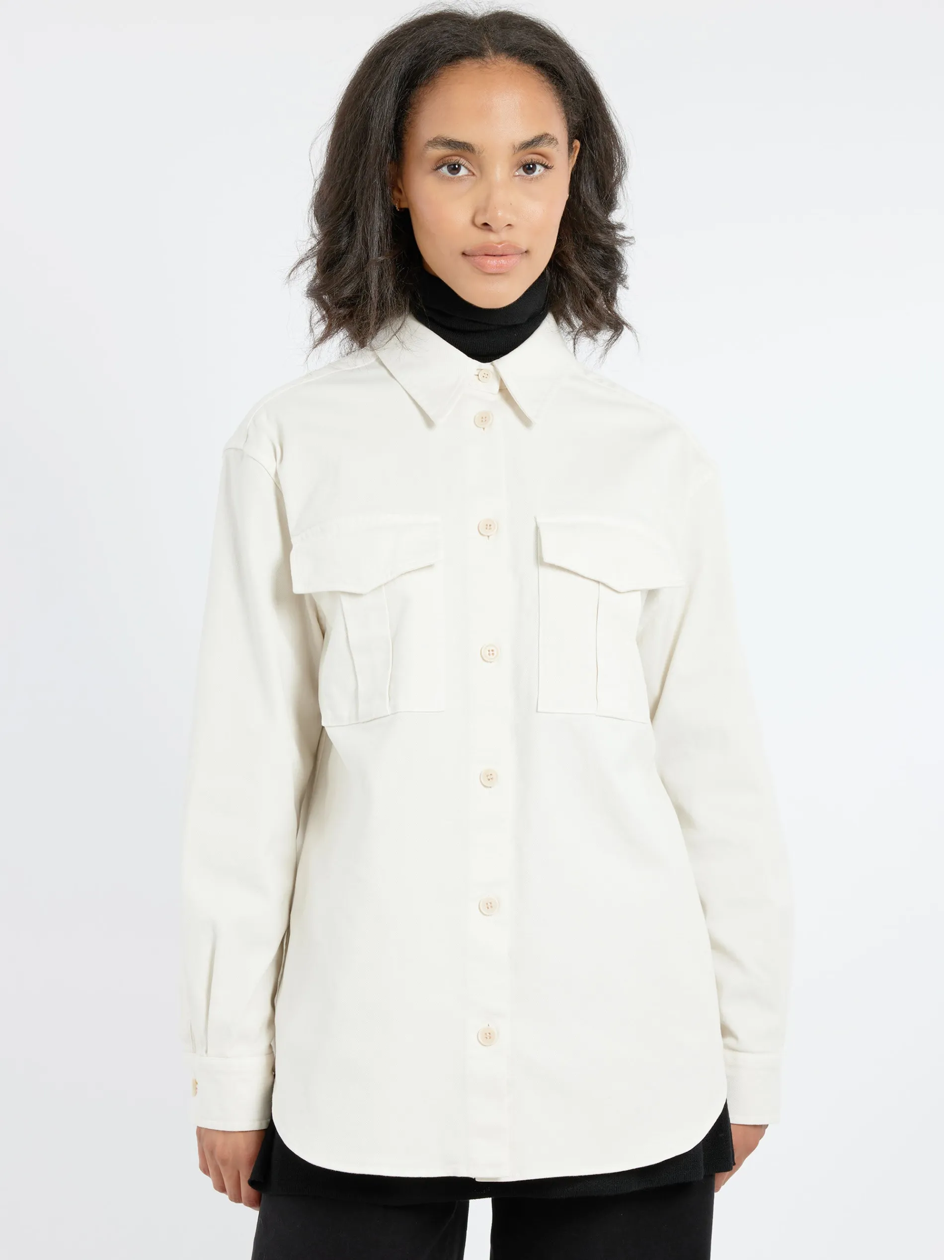 A loose-fitting shirt made from garment-dyed stretch cotton gabardine, a compact fabric with a thick feel.