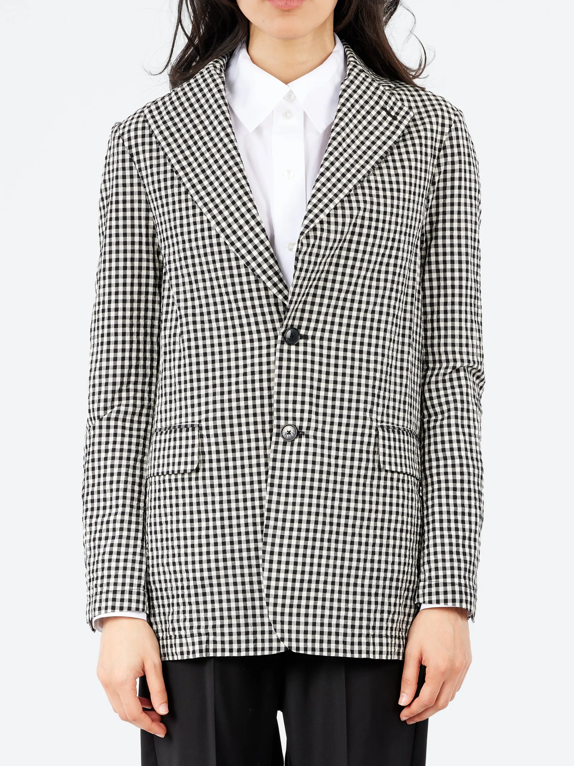 The iconic Galà blazer, a must-have piece for Barena’s womenswear collection, is crafted from super lightweight cotton Vichy seersucker. The timeless appeal of the classic Vichy check pattern is paired with the relaxed-fit silhouette, enriched with refined and tailoring details, creating a perfect balance of elegance and ease.