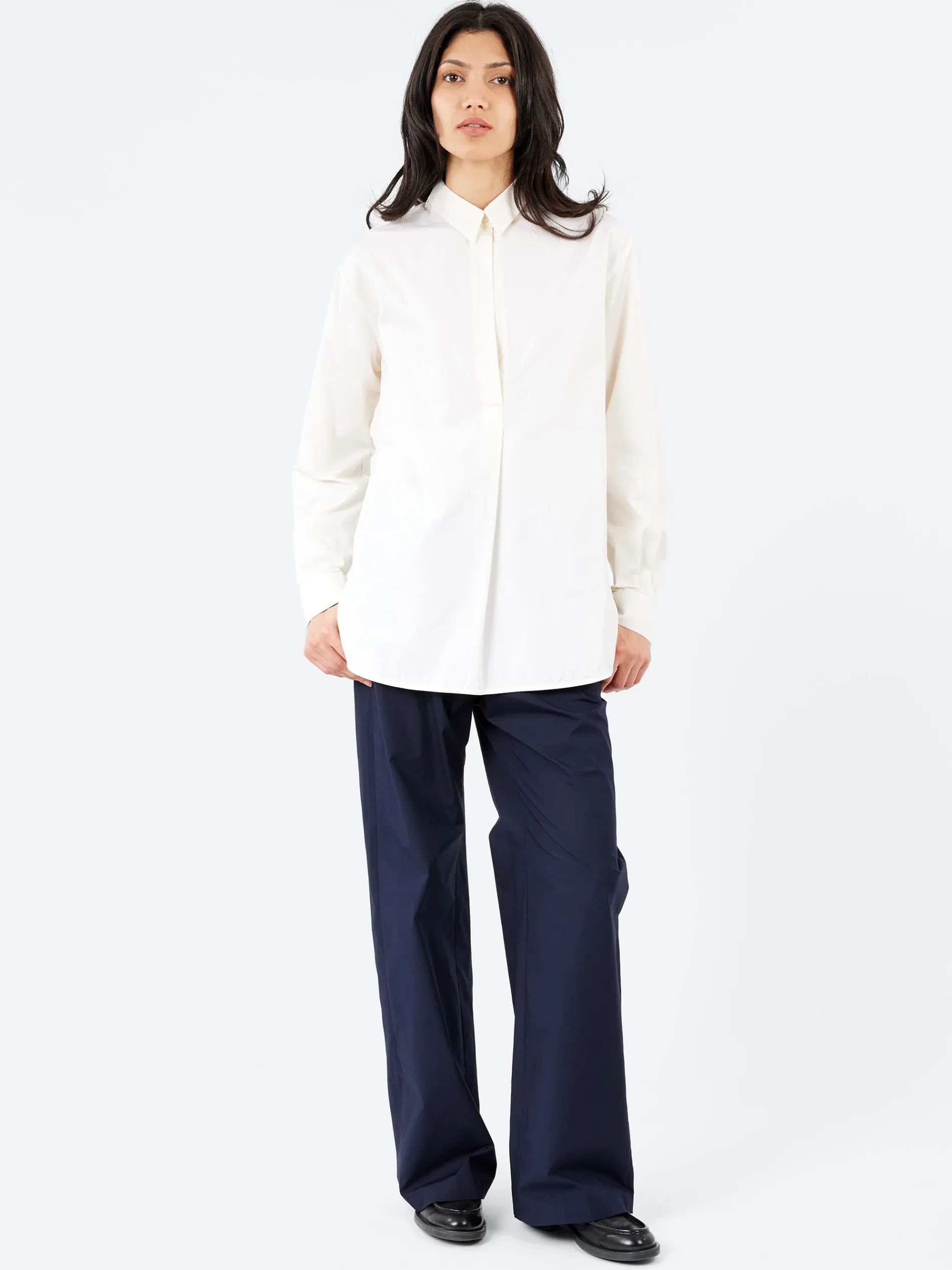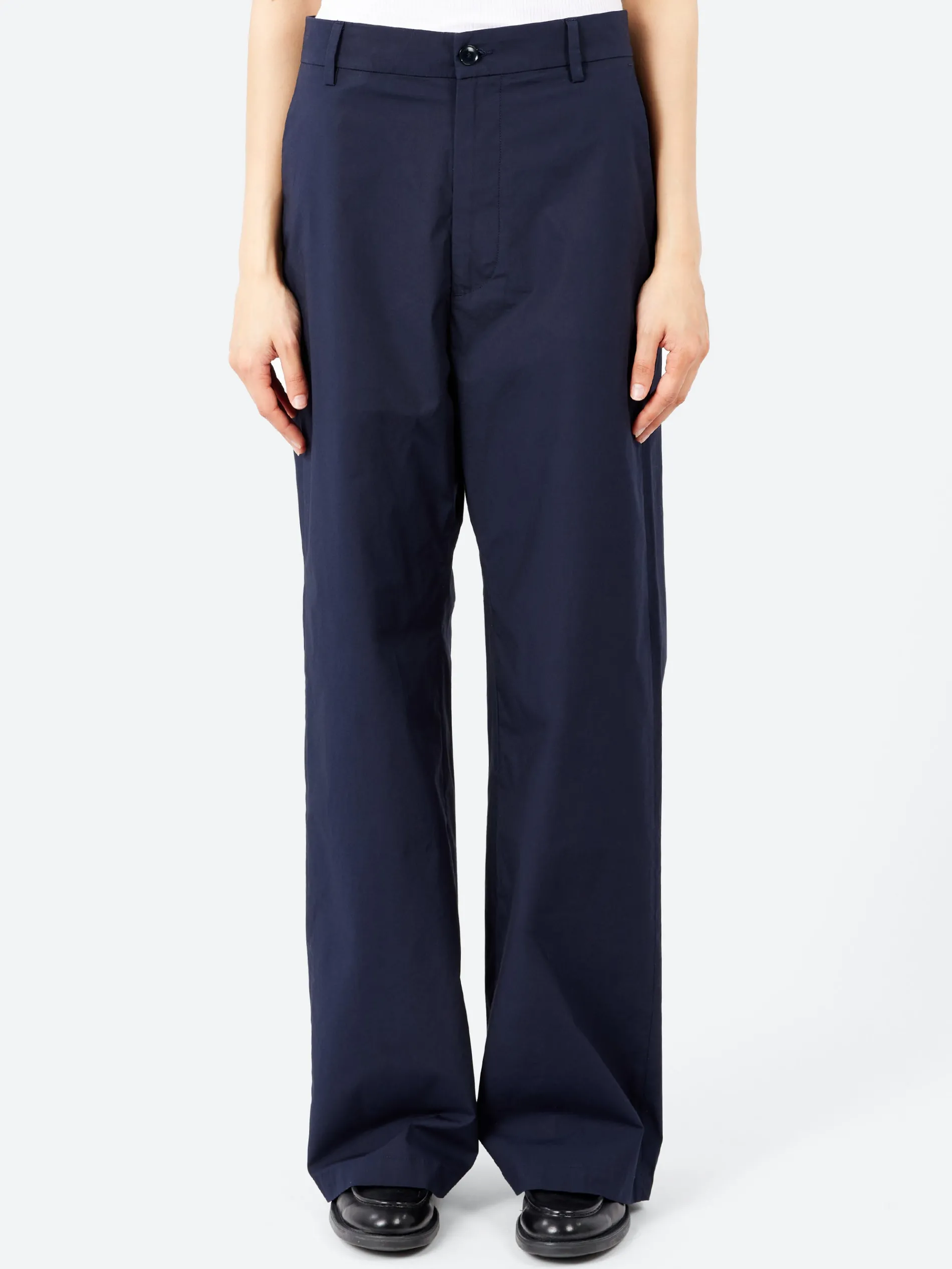 Featuring long, wide leg and a minimalist design, the Nini trousers pay homage to the essence of design. They are crafted from lightweight parachute stretch poplin in a rich navy hue, offering both comfort and sophistication.