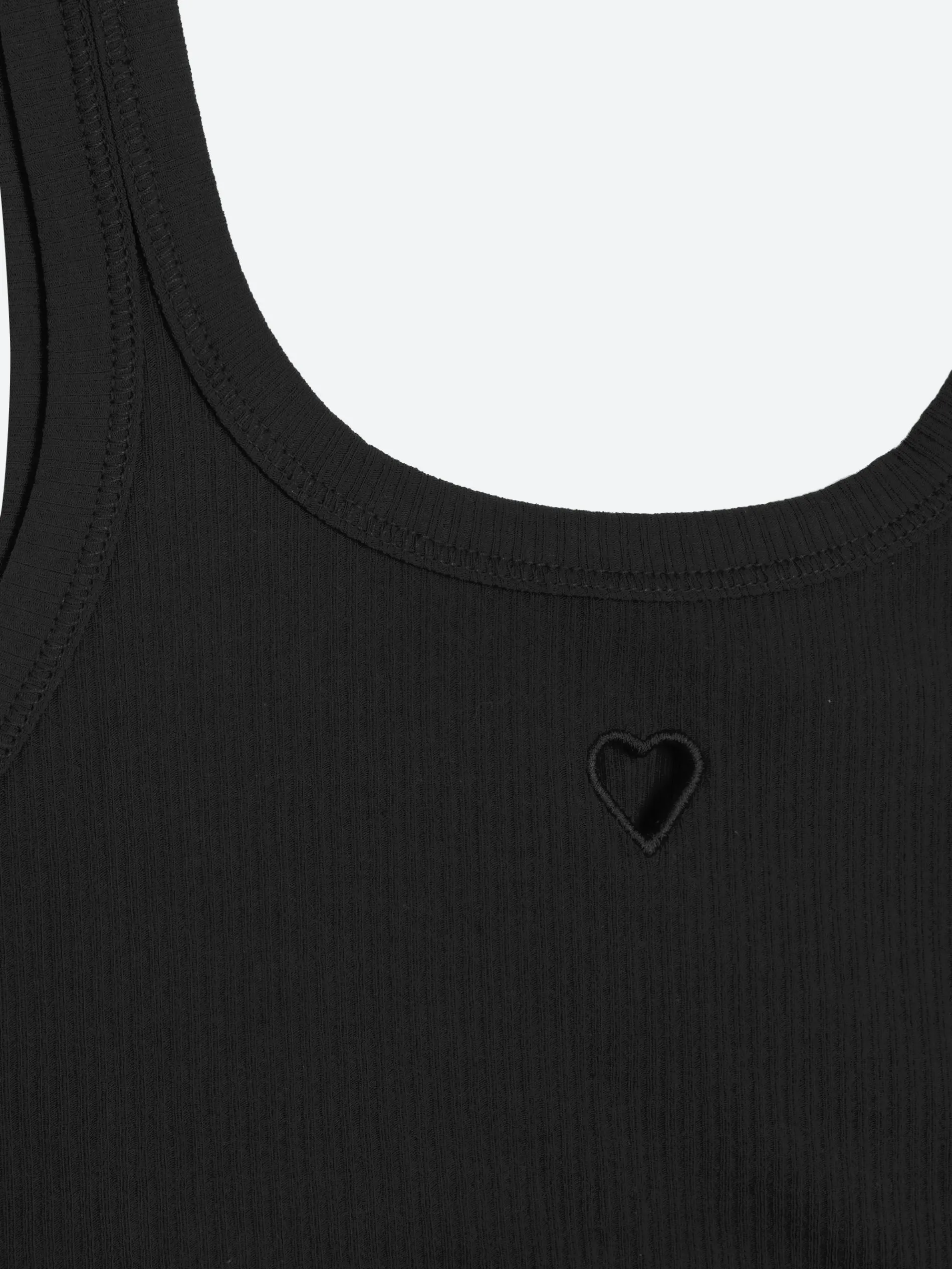 A soft, eco-friendly organic cotton rib bra with heart-shaped embroidery, a front cut-out, and a scoop neckline. Features elastic trim at the neckline and hem, made from cotton for a natural, sustainable touch.