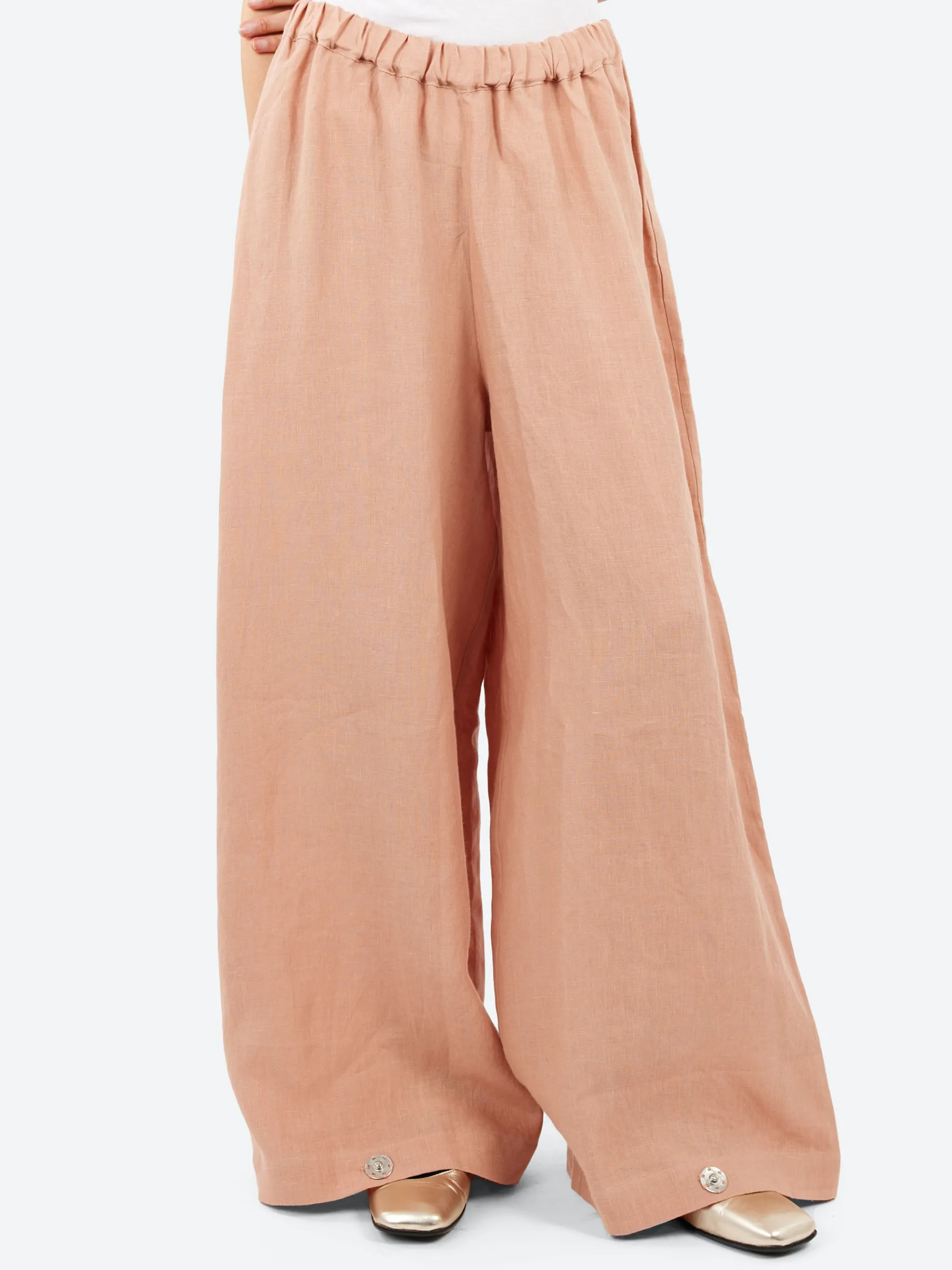These Baserange pants feature an elastic waistband for a comfortable fit and snap buttons at the cuffs, allowing for an adjustable, customizable look. Made from durable hemp fabric, they offer a sustainable and stylish option for casual wear.