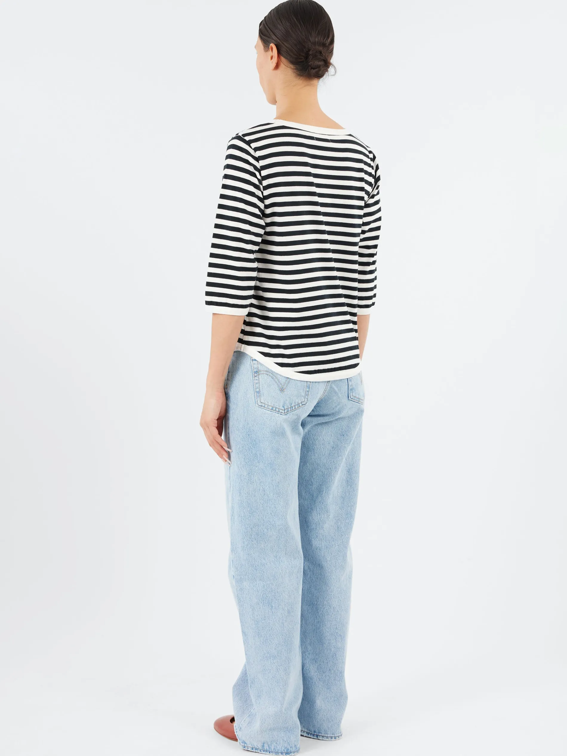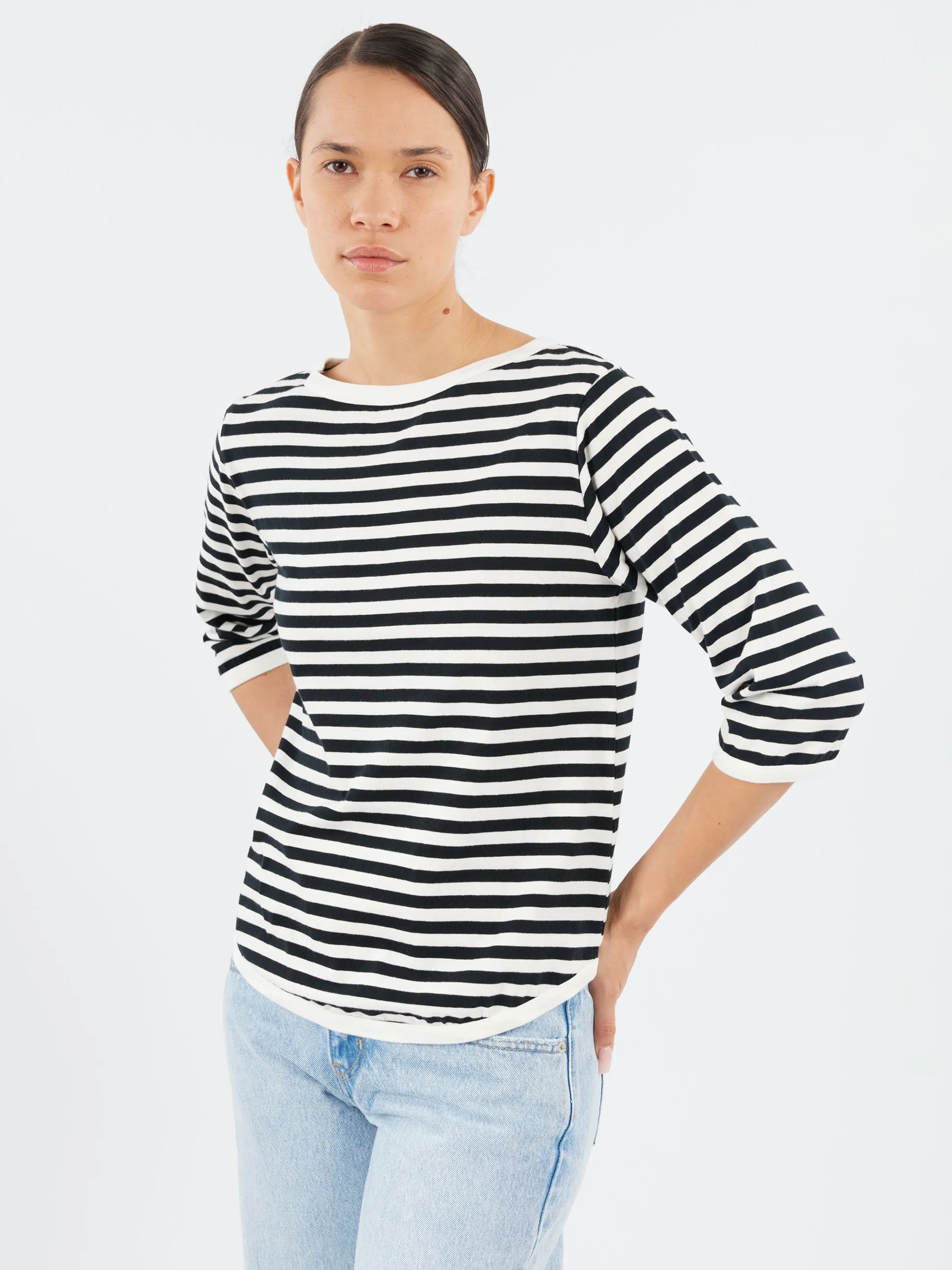 The BEAMS BOY Border Boat Neck 3/4 Sleeve T-Shirt offers a fresh take on a classic design. Crafted from soft cotton, this Japanese-made tee features a boat neckline and 3/4 sleeves, providing a comfortable and stylish fit. The 1cm horizontal stripes add a touch of playfulness, making it a versatile addition to any wardrobe.