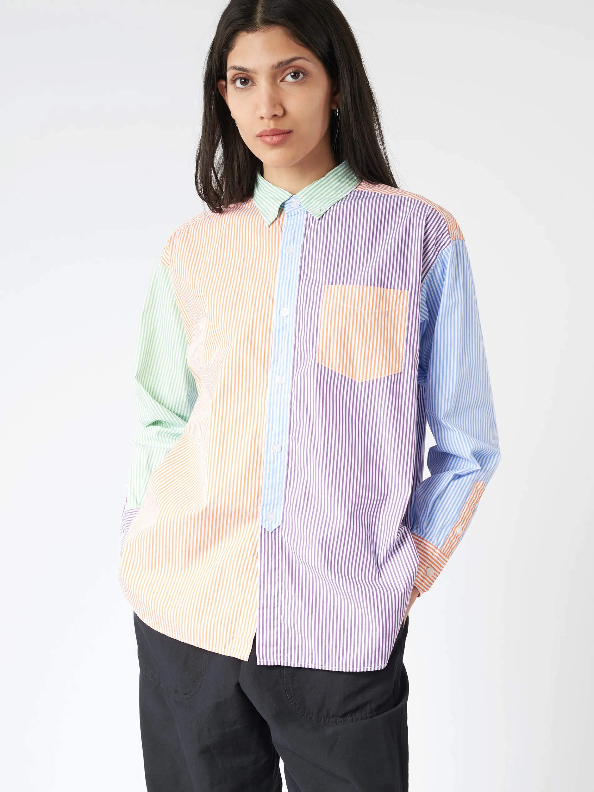 BEAMS BOY button-down shirt with vibrant contrasting stripes. Made from high-quality cotton broadcloth.