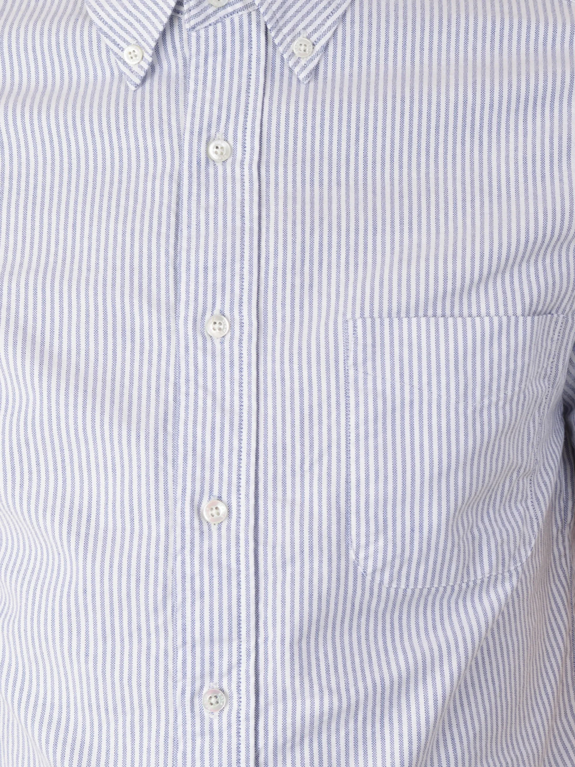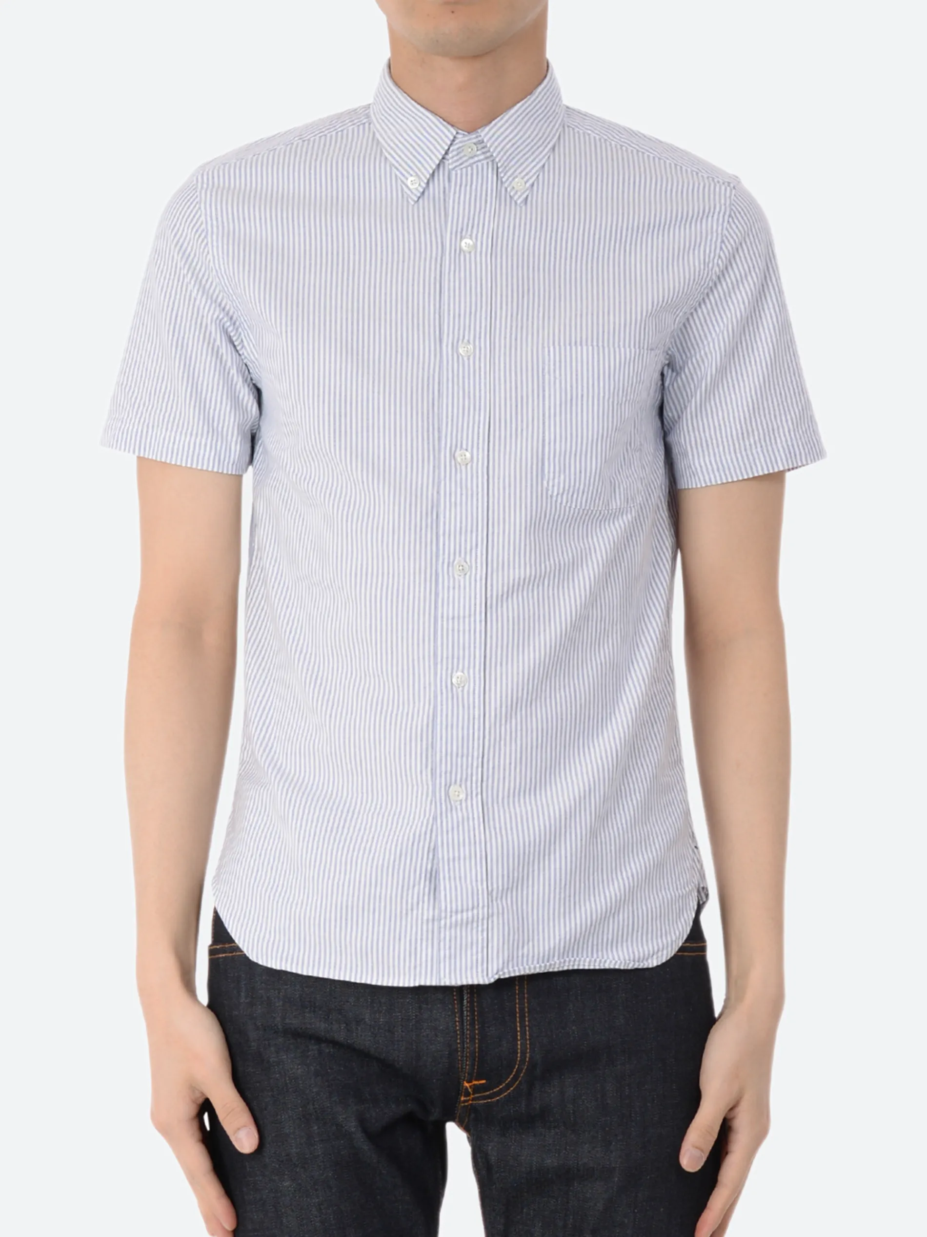 Beams Plus candy striped short sleeve shirt in blue and white oxford cotton. Styled for a preppy look and feel.