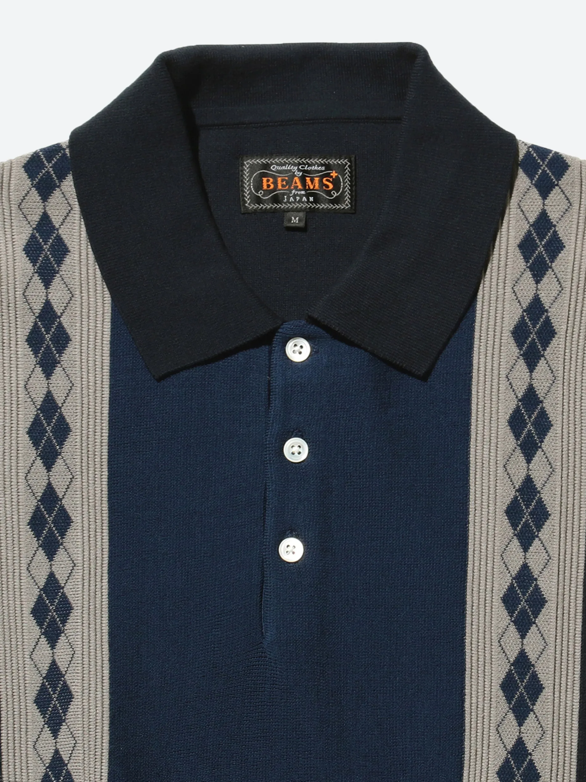 The BEAMS PLUS short-sleeved polo shirt made from soft cotton weave, it offers a premium feel and comfort. The classic argyle diamond pattern is subtly highlighted with ribbed details on the collar, cuffs, and hem. This polo includes a traditional polo collar, a three-button placket, short sleeves, and a split hem, making it a versatile and stylish addition to any wardrobe.