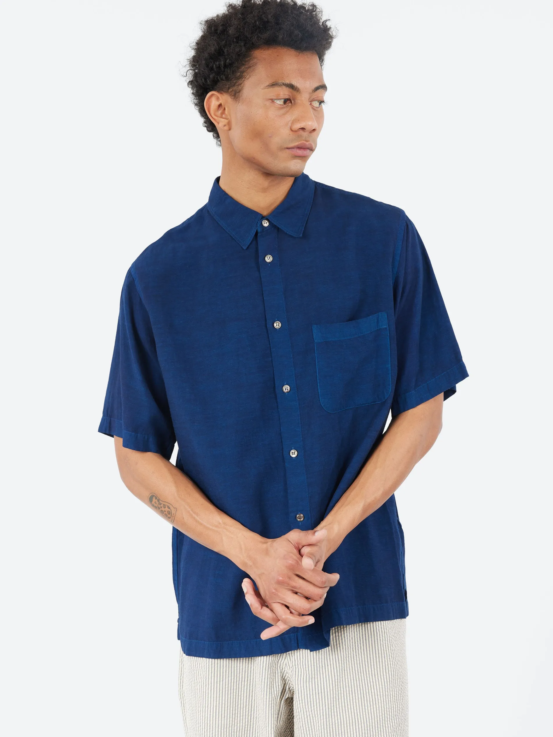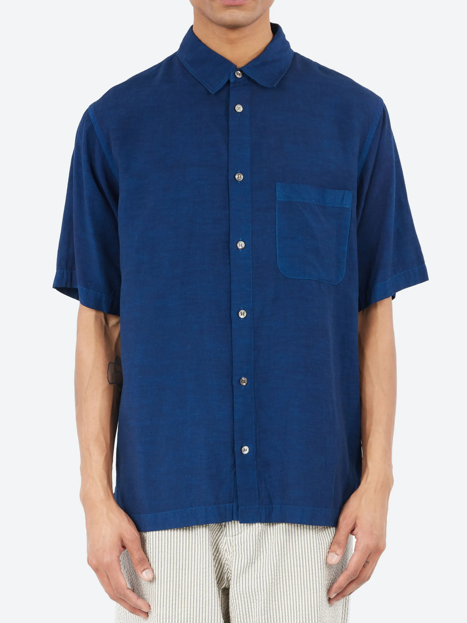 The Blue Blue Japan short-sleeved shirt made with a unique dyeing process. The shirt blends the dry touch of linen with the soft drape of Tencel. Its roomy silhouette makes it a perfect, laid-back piece.