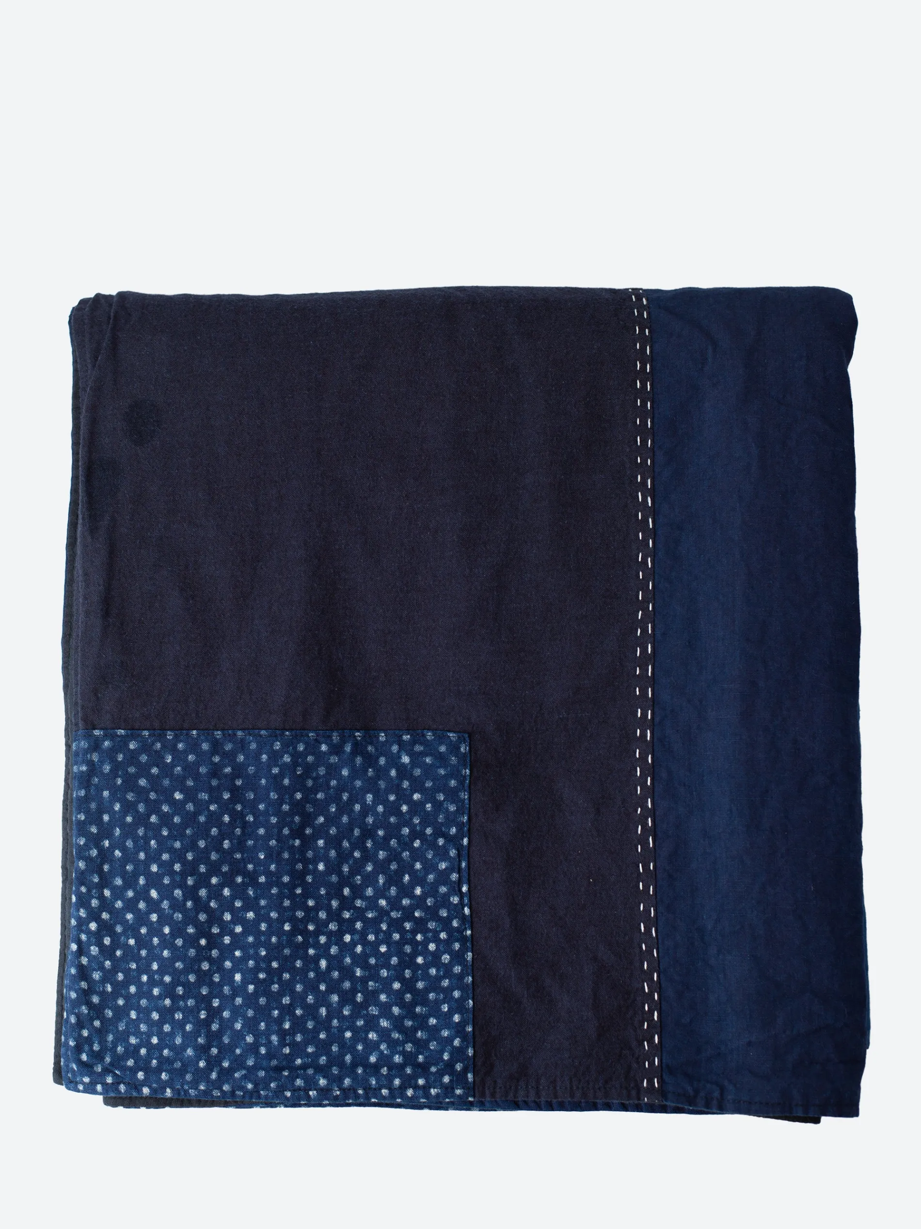 Indigo-dyed patchwork blanket with sashiko stitching, a traditional Japanese mending technique. Made from various cotton and linen fabrics from Blue Blue Japan’s archive.
