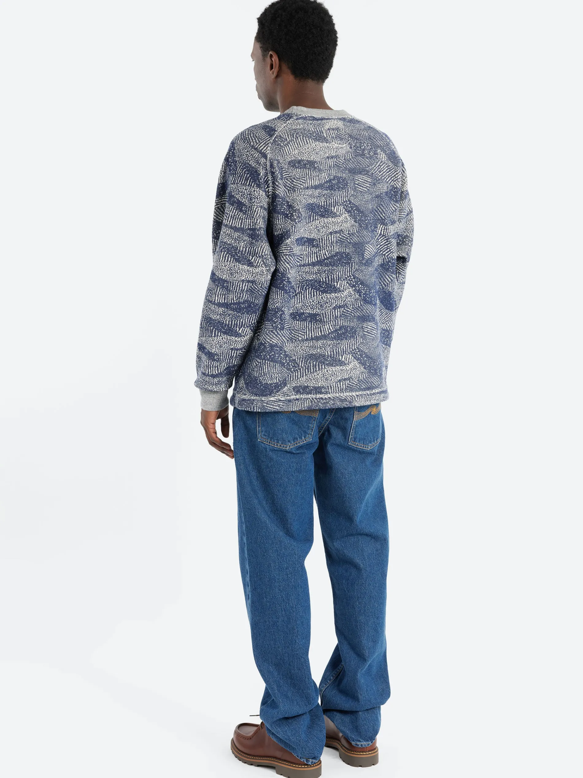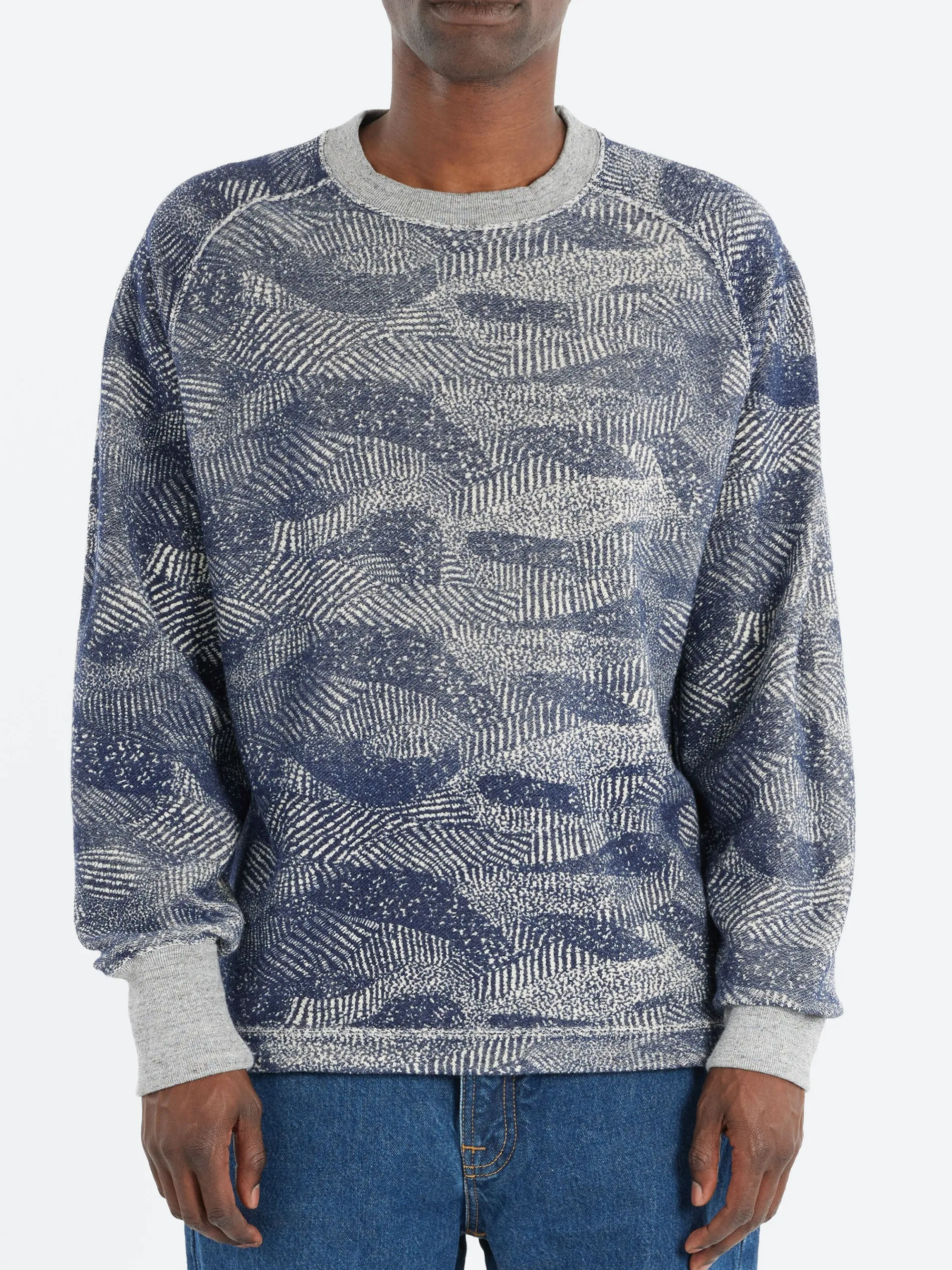 Blue Blue Japan crew neck pullover with print on the back loop of the sweat fabric and a drawcord at the hem.