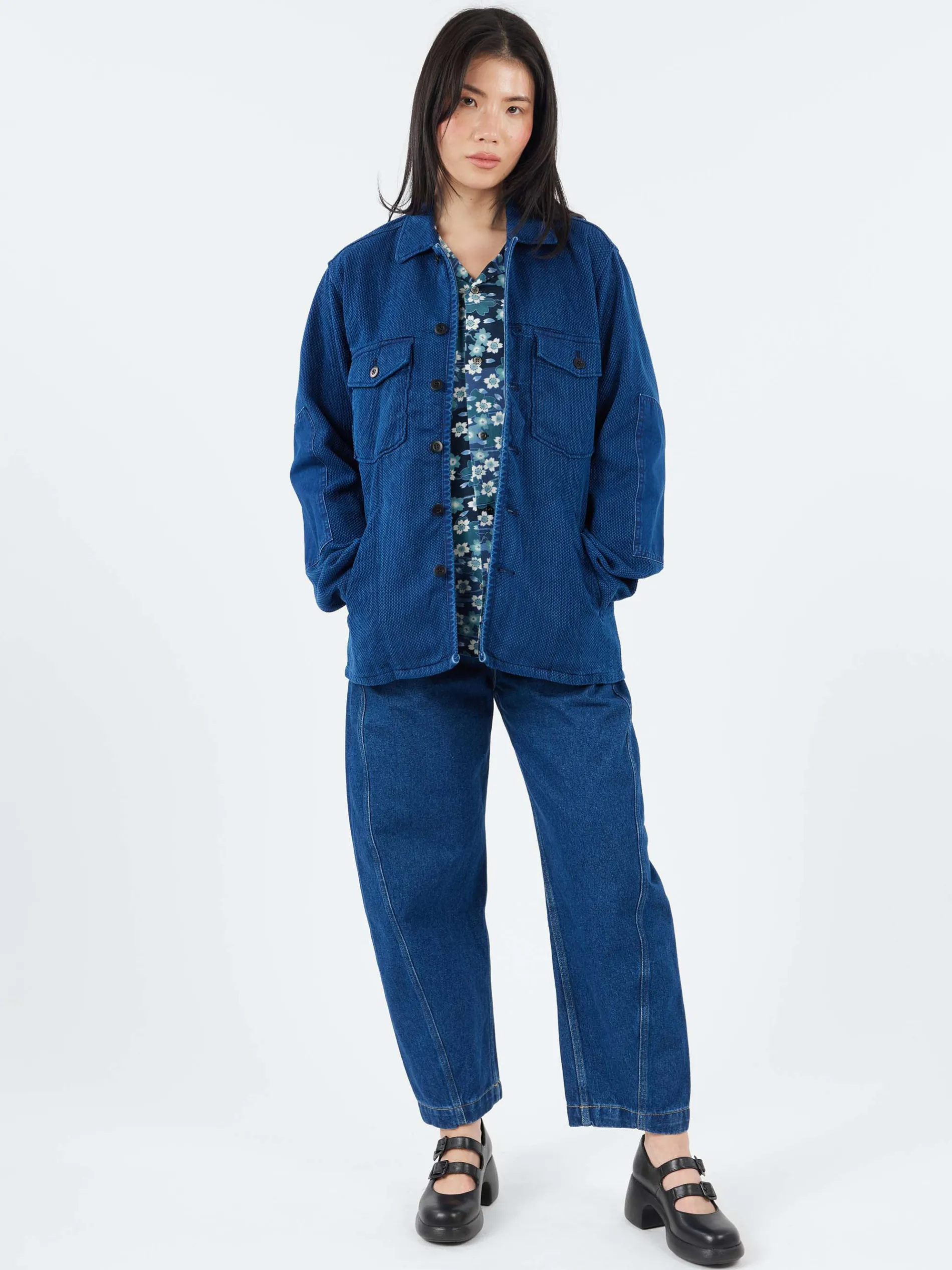 This Blue Blue Japan shirt jacket features an original sashiko fabric with thread dyed indigo and a worn-in appearance. The contrast between the indigo finish on the front and elbows, processed after production, and the unique vertical fading of the yarn-dyed Sashiko fabric is a standout detail. With large flap pockets on the chest and waist pockets, it has the rugged feel of a jacket while still maintaining the form of a shirt.