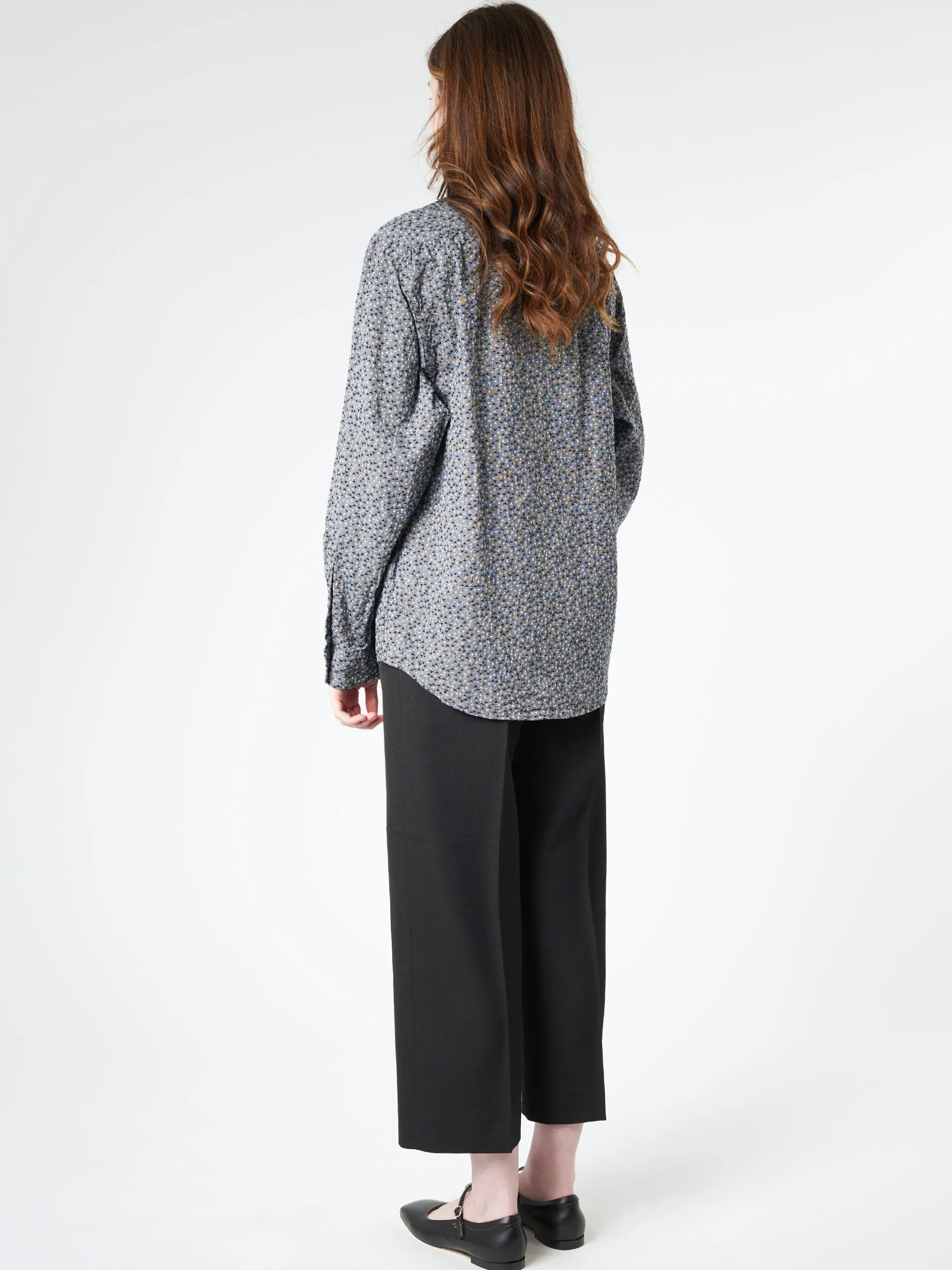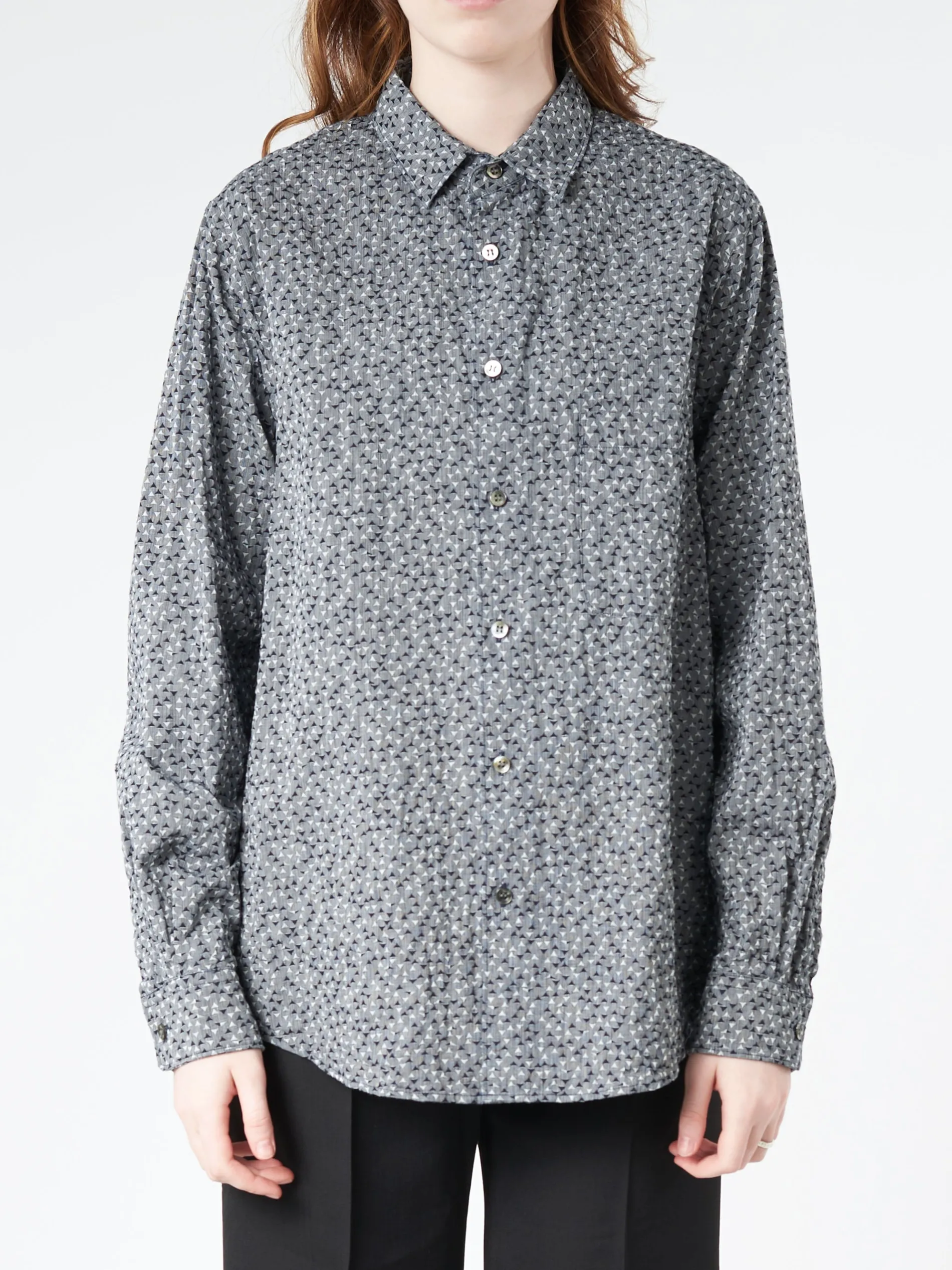 Blue Blue Japan shirt with a geometric pattern representing mountains. This shirt has fine gathers on the back yoke for easy movement and is comfortable to wear.