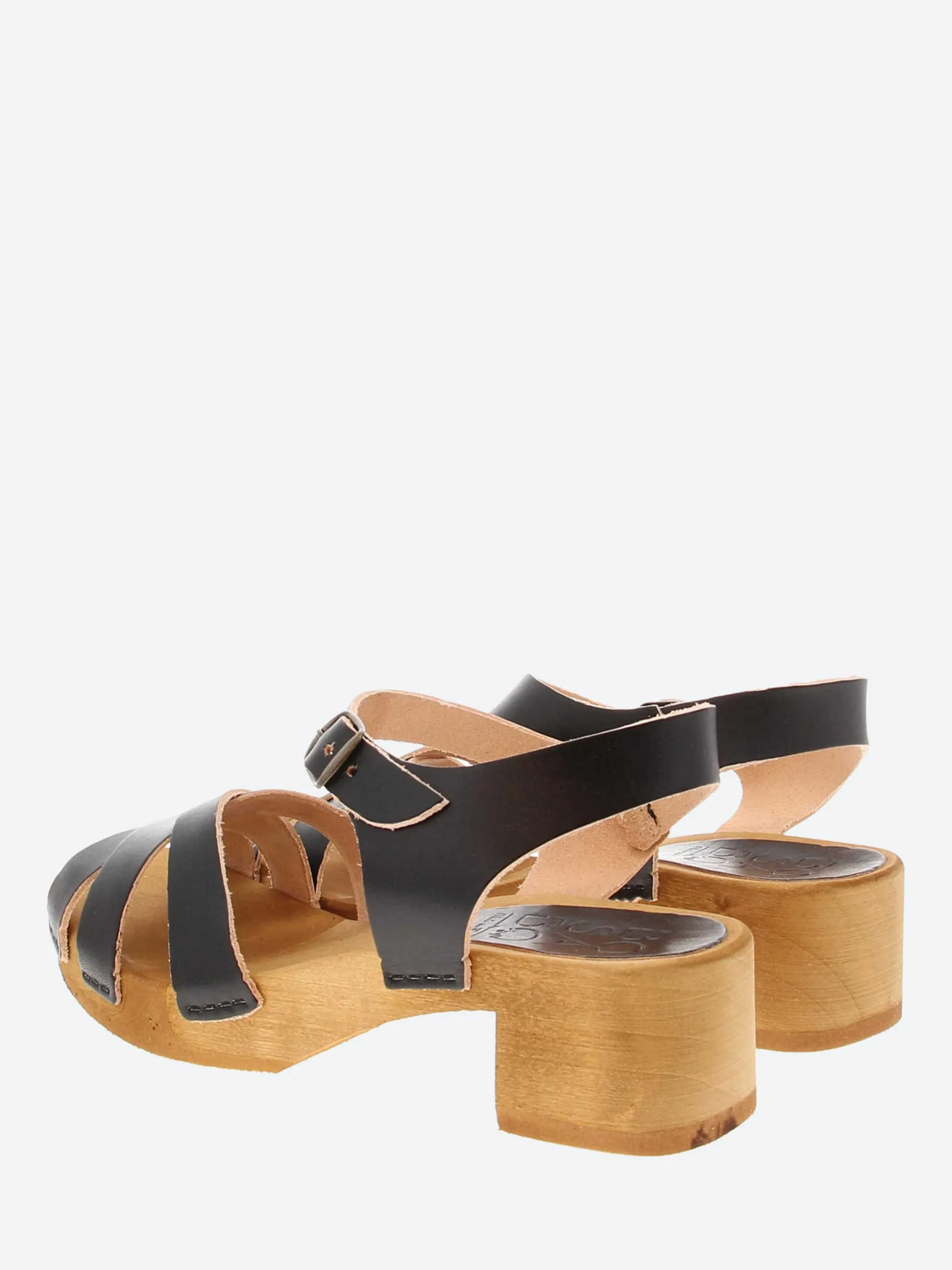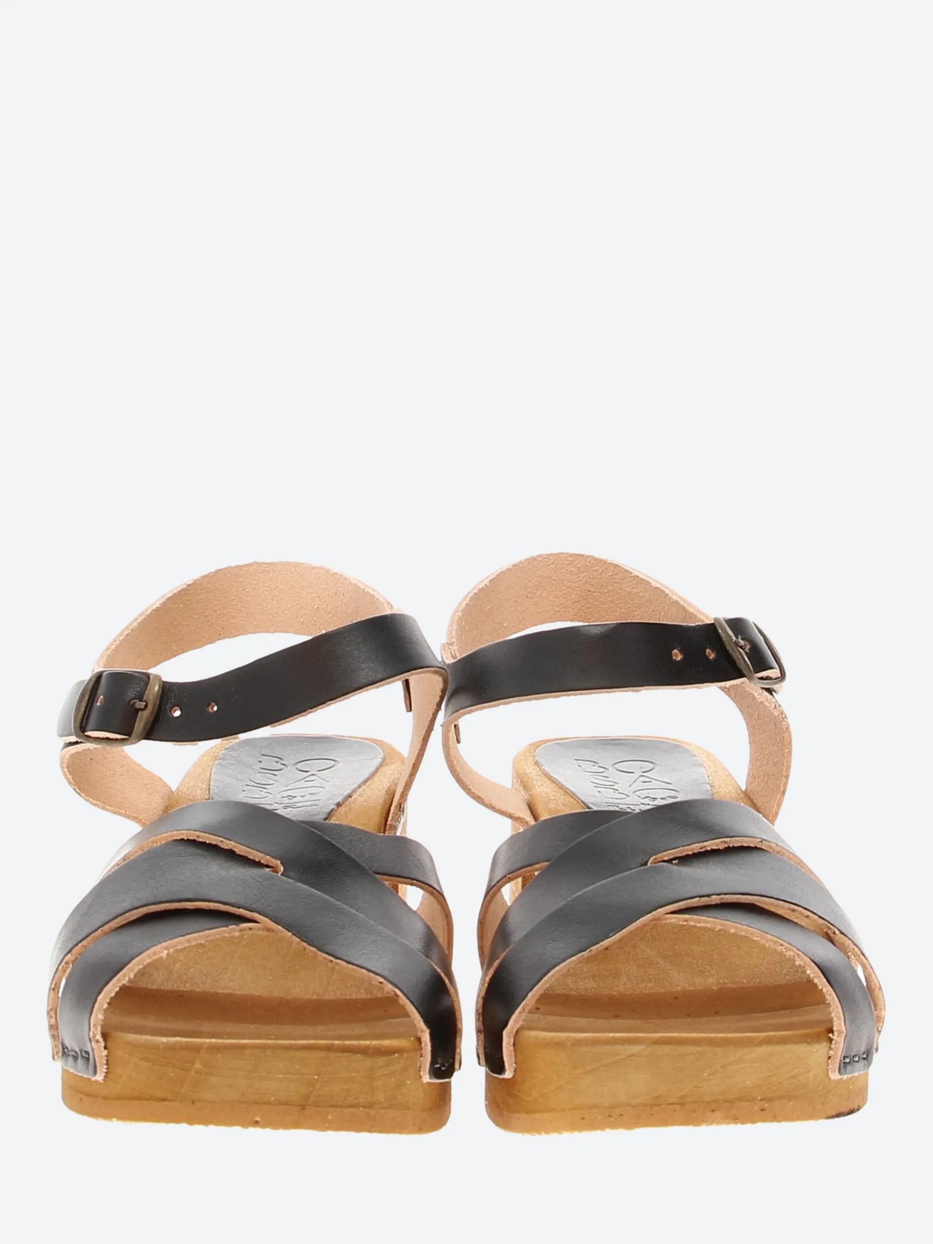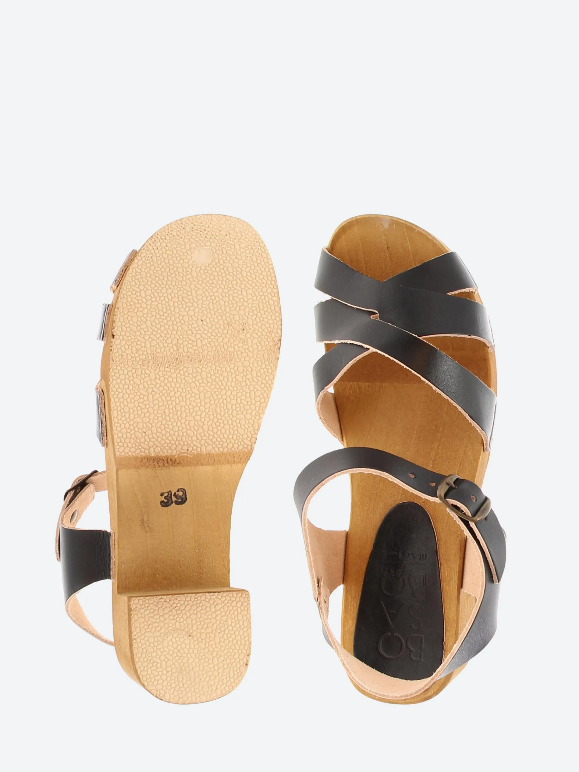 This elegant Bosabo sandal will accompany you to all your summer events. Its adjustable ankle strap and multi-strap weaving dress the foot, as the flexible wooden sole with an intermediate heel provides comfort while keeping a feminine look.