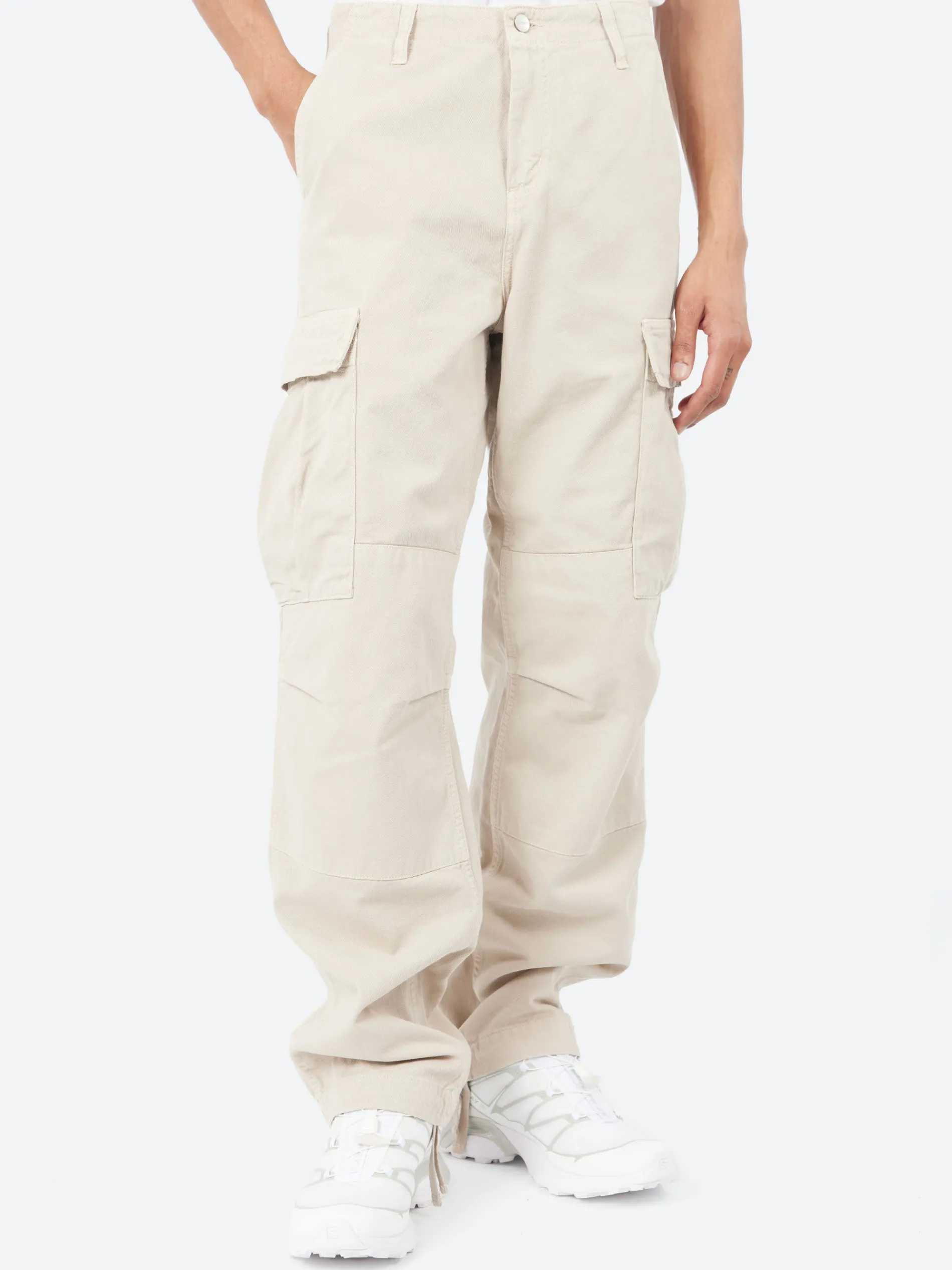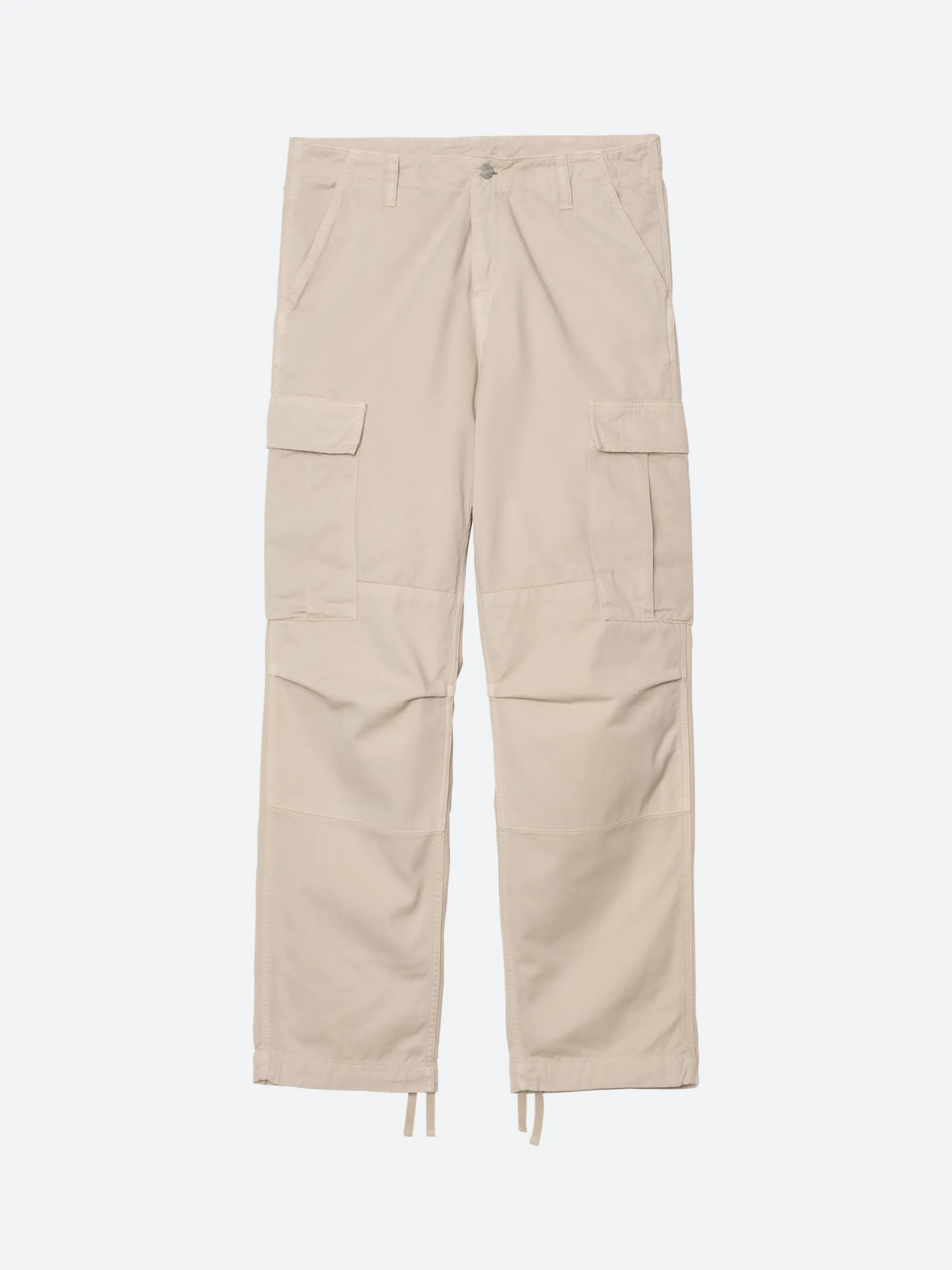 The Regular Cargo Pant is constructed from durable Moraga twill, which is a midweight organic cotton fabric that has been garment-dyed, resulting in subtle color variations throughout and a softer feel. The style is cut in a regular fit with a low waist, and features double-layer knees, adding to its robust qualities. Multiple patch pockets throughout nod to the garment’s military influences, and tie detailing at the cuffs allow for the fit to be adjusted.