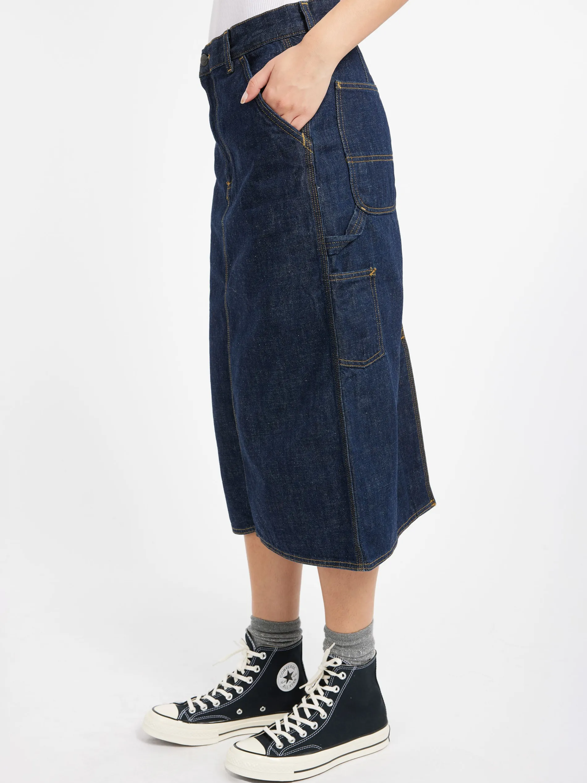 The women’s single knee skirt is crafted from heavyweight cotton denim in a loose, relaxed fit silhouette, and features triple stitching details, a tool pocket and a hammer loop. A woven Carhartt WIP square label completes the design.