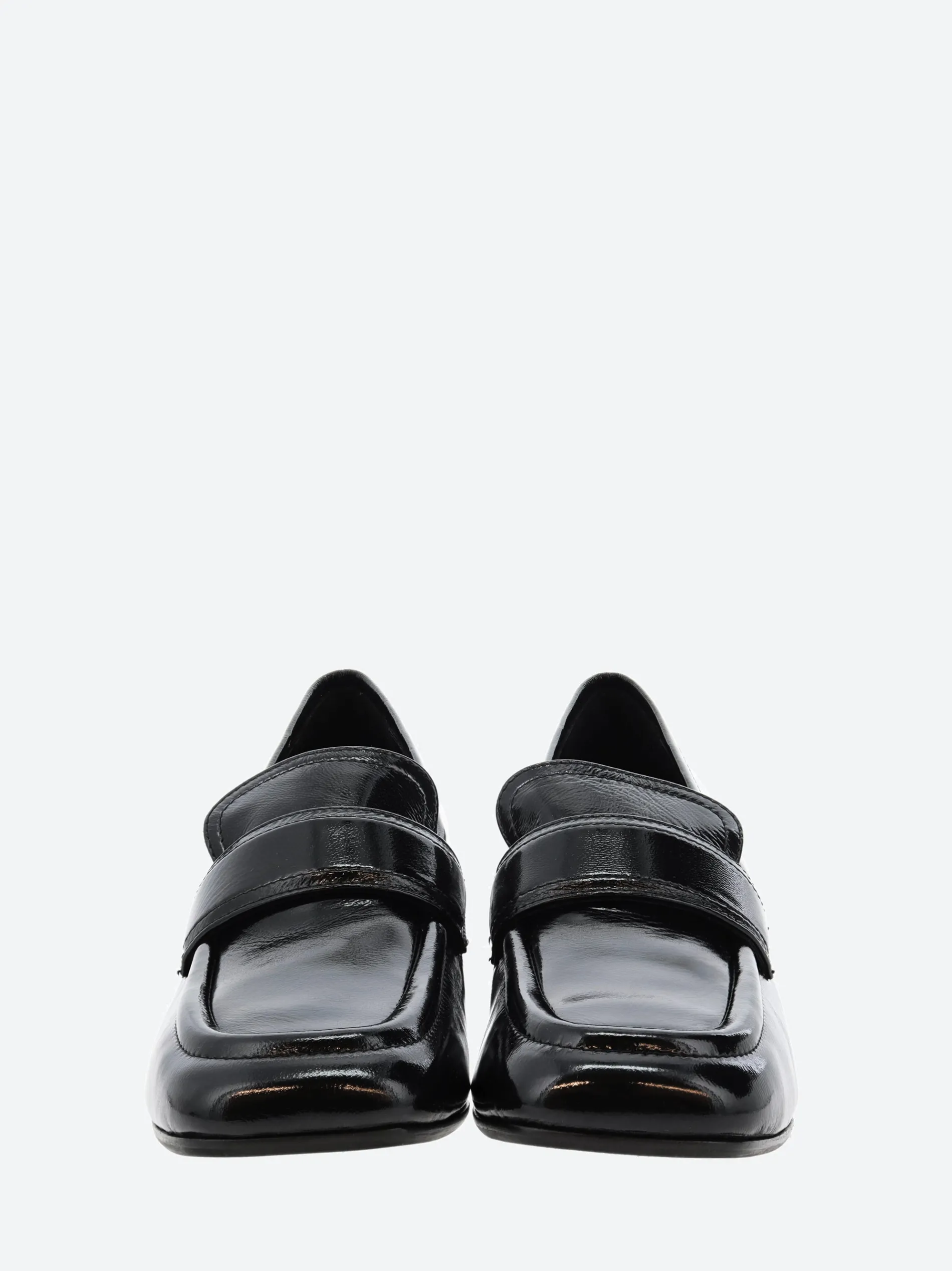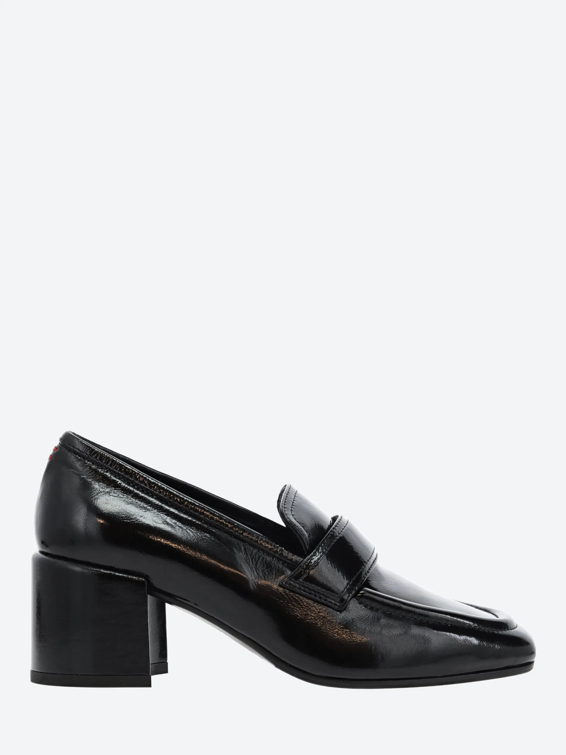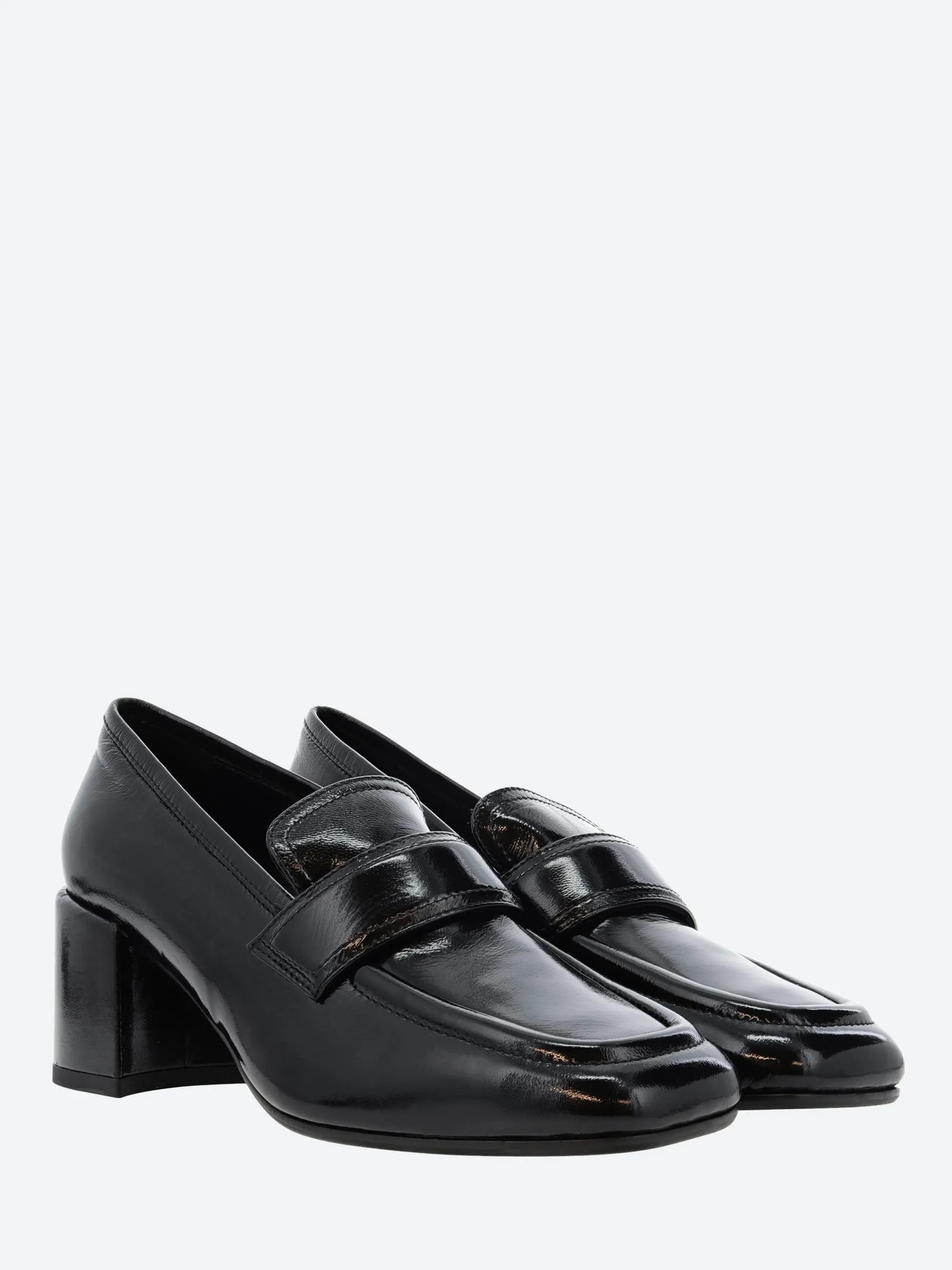 Halmanera heeled loafer in shiny leather. A slip-on style for easy on and off. Finished with a self covered wooden heel.